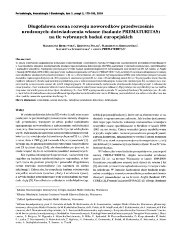 Perinatologia, Neonatologia i Ginekologia, tom 3, zeszyt 3, 175-180, 2010 Długofalowa ocena rozwoju noworodków przedwcześnie urodzonych: doświadczenia własne (badanie PREMATURITAS) na tle wybranych badań europejskich MAGDALENA RUTKOWSKA1, KRYSTYNA POLAK1, MAŁGORZATA SEROCZYŃSKA2, KATARZYNA SZAMOTULSKA3 I GRUPA PREMATURITAS4 Streszczenie W pracy omówiono zagadnienia dotyczące epidemiologii i czynników ryzyka wystąpienia najczęstszych powikłań stwierdzanych u noworodków skrajnie niedojrzałych: mózgowego porażenia dziecięcego (MPDz), zaburzeń w sferach poznawczej, intelektualnej i narządów zmysłów. Następnie porównano wyniki badań epidemiologicznych wykonanych pod koniec lat 90. XX wieku w Anglii i Francji (EPIPAGE, EPICURE) oraz pierwsze badanie regionalne w Polsce (PREMATURITAS), w których oceniano długofalowo rozwój noworodków urodzonych przedwcześnie (< 32 t.c.). Stwierdzono, że częstość występowania MPDz jest odwrotnie proporcjonalna do wieku ciążowego i dotyczy ok. 20% populacji urodzonej przed 28. t.c. i ok. 10% urodzonej przed 32. t.c. W przypadku stwierdzenia ciężkich zaburzeń chodu najczęściej współistnieją one z zaburzeniami intelektualnymi i znacznie obniżonym IQ, co wiąże się z niemożnością uczęszczania nawet do szkół integracyjnych. W zaburzeniach zachowania dominowała hiperaktywność i zaburzenia emocjonalne, choć większość dzieci chodzi do normalnych szkół (nauczanie początkowe). Optymistyczne wyniki dotyczą narządów zmysłów: niewielki procent dzieci jest niewidomych, choć ROP występowała u prawie 3 populacji badanej. W późniejszym okresie u części dzieci stwierdzano nieprawidłowości pod postacią niedowidzenia i zeza. Znikomy procent dzieci ma zaburzenia słuchu z koniecznością noszenia aparatów słuchowych. Słowa kluczowe: wcześniak, ocena rozwoju, mózgowe porażenie dziecięce, retinopatia Wstęp W ostatnim dziesięcioleciu XX wieku dzięki znacznym postępom w perinatologii (nowoczesne metody diagnostyki prenatalnej, transport in utero, podaż surfaktantu egzogennego noworodkom z zaburzeniami oddychania) oraz przy obserwowanym wzroście liczby ciąż wielopłodowych, zwiększyła się zarówno częstość urodzeń noworodków bardzo niedojrzałych (urodzonych przed 32. t.c. i/lub z masą ciała < 1500 g), jak i wzrosła ich przeżywalność [1]. Wydaje się, że granicą możliwości ratowania noworodków jest 23. tydzień ciąży [2-4], ale dowiedzionym jest też, że może wiązać się to ze wzrostem powikłań rozwojowych. Jak wynika z dostępnych opracowań, najbardziej wiarygodne są badania epidemiologiczne regionalne, w których bada się poziom przeżycia i prowadzi długofalową ocenę rozwoju noworodków (co najmniej do wieku szkolnego). Zaleca się, by populacja badana obejmowała wszystkie urodzenia (martwe płody i urodzenia żywe), a wyniki badań przedstawiane były z podziałem na tygodnie ciąży [5]. Umożliwia to uniknięcie wielu błędów (np. selekcji populacji badanej), które nie są eliminowane w badaniach o ograniczonym zakresie. Jak trudno jest prowadzić tego typu badania wskazuje metaanaliza oceniająca wszystkie prace opublikowane w Medline w latach 1980-2001 na ten temat. Cztery warunki (praca opublikowana w języku angielskim, badanie prowadzone prospektywnie z grupą kontrolną, zgłaszalność w wieku 5 lat nie mniejsza niż 70% oraz obok oceny rozwoju ruchowego także rozwój intelektualny i poznawczy) spełniało jedynie 15 na 227 znalezionych prac. W Polsce pierwsze badanie prospektywne, znane pod nazwą PREMATURITAS, objęło noworodki urodzone przed 33. t.c. na terenie Warszawy w latach 1998-1999. Oceniono początkowo rozwój tych dzieci do wieku 2 lat [6], obecnie prowadzone są badania oceny rozwoju w wieku szkolnym. W Europie Zachodniej duże badania regionalne oceniające rozwój noworodków przedwcześnie urodzonych prowadzone są na terenie Anglii (badanie EPICURE) [2], Francji (badanie EPIPAGE) [3] i Belgii (badanie 1 Klinika Neonatologii i Intensywnej Terapii, Instytut Matki i Dziecka, Warszawa 2 Klinika Okulistyki, Instytut Centrum Pomnik Zdrowia Dziecka, Warszawa 3 Zakład Epidemiologii, Instytut Matki i Dziecka, Warszawa 4 Główni koordynatorzy: prof. E. Helwich, dr hab. M. Rutkowska, dr K. Szamotulska, Instytut Matki i Dziecka, Warszawa; główni wykonawcy z Instytutu Matki i Dziecka: dr M. Rudzińska-Chazan, dr K. Polak, dr M. Maj-Pucek, dr Z. Kułakowska, dr A. Jeziorek, dr I. Palczewska, dr E. Nowakowska-Szyrwińska, dr A. Romaniuk-Doroszewska; wykonawcy z Instytutu-Pomnika Centrum Zdrowia Dziecka: dr M. Seroczyńska; koordynatorzy z Oddziałów Noworodkowych, Patologii Noworodka i Intensywnych Terapii w Warszawie: J. Baszczeska, B. Fedyna, M. Figurska A. Górecka-Śledziewska, B. Hille, U. Jędrasiak, B. Kassur-Siemieńska, D. Krzyczkowska, K. Kufel, E. Lipska, Z. Maciejewski, G. Małecka-Lech, Z. Ogińska, H. Orłowska, G. Ostrowska, K. Polak, M. Rutkowska, B. Sitkowska, A. Służewska, A. Stafiej-Modrowska, T. Szreter, A. Tomik 176 M. Rutkowska, K. Polak, M. Seroczyńska, K. Szamotulska i grupa PREMATURITAS EPIBEL) [4]. Opublikowano już dane zawierające informacje o rozwoju dzieci angielskich i francuskich w wieku szkolnym [7, 8]. Najczęstszym problemem neurologicznym stwierdzanym u noworodków urodzonych przed 32. t.c. jest mózgowe porażenie dziecięce (MPDz). Częstość jego występowania jest odwrotnie proporcjonalna do wieku ciążowego [9-11]. Przez ostatnie 10 lat wahała się od 8-12% wśród populacji noworodków urodzonych przed 32 t.c. do 17-18% u tych urodzonych przed 28. t.c. [10]. W ostatnim okresie jednak publikowane są prace, w których po raz pierwszy obserwuje się spadek częstości występowania MPDz, także w grupie noworodków skrajnie niedojrzałych [11]. Szczegółowych danych dotyczących występowania MPDz w zależności od dojrzałości noworodka przy urodzeniu dostarcza opracowanie obejmujące 