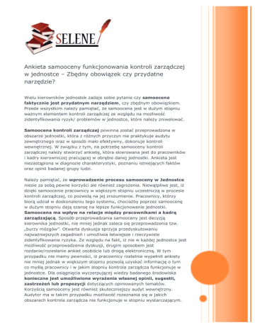 Ankieta samooceny funkcjonowania kontroli zarządczej w jednostce – Zbędny obowiązek czy przydatne narzędzie? Wielu kierowników jednostek zadaje sobie pytanie czy samoocena faktycznie jest przydatnym narzędziem, czy zbędnym obowiązkiem. Przede wszystkim należy pamiętać, że samoocena jest w dużym stopniu ważnym elementem kontroli zarządczej ze względu na możliwość zidentyfikowania ryzyk/ problemów w jednostce, które należy zniwelować. Samoocena kontroli zarządczej powinna zostać przeprowadzona w obszarze jednostki, która z różnych przyczyn nie praktykuje audytu zewnętrznego oraz w sposób mało efektywny, dokonuje kontroli wewnętrznej. W związku z tym, na potrzebę samooceny kontroli zarządczej należy stworzyć ankietę, która skierowana jest do pracowników i kadry kierowniczej pracującej w obrębie danej jednostki. Ankieta jest niezastąpiona w diagnozie charakterystyki, poznaniu istniejących faktów oraz opinii badanej grupy ludzi. Należy pamiętać, że wprowadzenie procesu samooceny w Jednostce niesie za sobą pewne korzyści ale również zagrożenia. Niewątpliwe jest, iż dzięki samoocenie pracownicy w większym stopniu uczestniczą w procesie kontroli zarządczej, co pozwolą na jej zrozumienie. Pracownicy, którzy biorą udział w doskonaleniu tego systemu, chociażby poprzez samoocenę w dużym stopniu dają szansę na lepsze funkcjonowanie jednostki. Samoocena ma wpływ na relacje między pracownikami a kadrą zarządzającą. Sposób przeprowadzania samooceny jest decyzją kierownika jednostki, nie mniej jednak zaleca się przeprowadzenia tzw. „burzy mózgów”. Otwarta dyskusja sprzyja przedyskutowaniu najważniejszych zagadnień i umożliwia łatwiejsze i rzeczywiste zidentyfikowanie ryzyka. Ze względu na fakt, iż nie w każdej jednostce jest możliwość przeprowadzenia dyskusji, drugim sposobem jest rozdanie/rozesłanie ankiet osobiście lub drogą elektroniczną. W tym przypadku nie mamy pewności, iż pracownicy rzetelnie wypełnili ankiety nie mniej jednak w większym stopniu pozwolą uzyskać informację o tym co myślą pracownicy i w jakim stopniu kontrola zarządcza funkcjonuje w jednostce. Dla osiągnięcia wyczerpującej wiedzy badanego środowiska konieczne jest umożliwione wyrażenia własnej opinii, sugestii, zastrzeżeń lub propozycji dotyczących opiniowanych tematów. Korzyścią samooceny jest również skuteczniejszy audyt wewnętrzny. Audytor ma w takim przypadku możliwość rozeznania się w jakich obszarach kontrola zarządcza nie funkcjonuje w stopniu wystarczającym. [Wybierz datę] Każde działanie niesie za sobą pewne korzyści ale również konsekwencje. W przypadku wprowadzenia systemu samooceny w jednostce kierownik jednostki musi liczyć się również z ryzykiem jakie przyniesie wprowadzenie tego systemu. Minusem jest na pewno fakt, iż wyniki kwestionariuszy/ankiet mogą być niewiarygodne – co nie pozwoli w rzeczywistości ocenić faktycznego stanu funkcjonowania kontroli zarządczej w jednostce. W związku z tym, wielu pracowników skłania się do udzielania odpowiedzi „oczekiwanych”, a nie szczerych. W mniejszych jednostkach zagrożenie to jest wysokie ze względu na obawę pracowników przed zidentyfikowaniem osoby wypełniającej ankietę. Mimo występujących zagrożeń z zakresu samooceny kontroli zarządczej nie należy rezygnować z jej przeprowadzania, ponieważ zagrożenia te można zminimalizować do poziomu akceptowalnego. Zaleca się wybranie koordynatora samooceny, który posiada odpowiednią wiedzę i umiejętności z zakresu kontroli zarządczej; pracownicy powinni być przeszkoleni z tego zakresu w celu zrozumienia systemu kontroli zarządczej – umożliwi to bardziej wiarygodne wyniki z przeprowadzonej samooceny; do przeprowadzenia samooceny powinno wybierać się pracowników, których faktycznie dotyczy problem z jej funkcjonowaniem w danym obszarze itp. W momencie pozyskania informacji zwrotnej zapisanej w kwestionariuszu ankiety zostają zsumowane, a jej wyniki poddane obszernej analizie. Analiza ankiet jest metodą wykorzystywaną do pomiaru opinii publicznej w zakresie analizowanego problemu poprzez interpretację słowną i/lub graficzną zebranego materiału. Przy wykorzystaniu wykresów słupkowych, kołowych, diagramów oraz za pomocą zestawienia danych w tabelach jest przeprowadzana szczegółowa analiza każdego pytania zawartego w formularzu ankiety. Kolejnym krokiem jest skumulowanie otrzymanych analiz na potrzebę ogólnego zobrazowania istniejącego stanu danej jednostki. Kierownik jednostki, który chce usprawnić w niej funkcjonowanie kontroli zarządczej nie powinien mieć wątpliwości, iż ankiety samooceny są przydatnym narzędziem. 1 [Wybierz datę] Cezary Stanek – ekspert z zakresu kontroli zarządczej i ochrony danych osobowych, wykładowca, audytor. Wieloletni praktyk z kontroli zarządczej oraz specjalista w zakresie postępowania z ryzykiem, a w szczególności identyfikacji ryzyka w administracji samorządowej oraz ocenie prawidłowości i skuteczności zastosowanych środków w zakresie ochrony przetwarzanych danych osobowych. Absolwent Wyższej Szkoły Ekonomii i Administracji na kierunku Administracja Samorządowa oraz Podyplomowych Studiów Ochrony Danych Osobowych Wydział Prawa i Administracji Uniwersytetu Łódzkiego. Administrator Bezpieczeństwa Informacji, specjalista w zakresie ochrony danych osobowych oraz ekspert KRI. Pasjonat wdrożeń systemów zarządzania oraz dostosowywania procedur by były użyteczne i proste. Wdrożeniowiec systemy ograniczającego odpowiedzialność dla administratorów danych oraz pracowników – Kryptos24. Inne umiejętności: • audytor wewnętrzny systemów zarządzania bezpieczeństwem, • główny specjalista bezpieczeństwa i higieny pracy, Zapraszam do odwiedzenia naszej strony www.eszkolenie.eu SELENE CONSULTING Spółka z ograniczoną odpowiedzialnością, Spółka Komandytowa Aleja J
