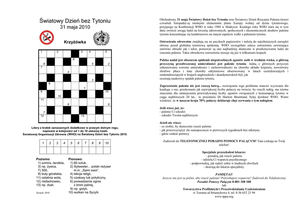 Światowy Dzień bez Tytoniu 31 maja 2010 KrzyŜówka 1 2 3 4 OstrzeŜenia zdrowotne znajdują się na paczkach papierosów i naleŜą do najsilniejszych narzędzi obrony przed globalną tytoniową epidemią. WHO szczególnie zaleca ostrzeŜenia zawierające zarówno obrazki jak i tekst, poniewaŜ są one najbardziej skuteczne w przekonywaniu ludzi do rzucenia palenia. Takie obrazkowe ostrzeŜenia stosuje się juŜ w kilkunastu krajach. 5 6 9 5 2 7 4 3 8 1 9 10 10 11 6 Litery z kratek oznaczonych dodatkowo w prawym dolnym rogu, napisane w kolejności od 1 do 10 utworzą hasło Światowej Organizacji Zdrowia (WHO) na Światowy Dzień bez Tytoniu 2010. 3 4 Poziomo: 1) szmira, tandeta, 3) np. Ŝywca, 7) 500, 8) buty góralskie, 11) ostatnia wola, 12) niefachowiec, 13) np. duet. GurzyG, 2010 Zaprzestanie palenia nie jest rzeczą łatwą... rozwiązanie tego problemu stanowi wyzwanie dla kaŜdego z nas, przekonanie jak największej liczby palaczy na świecie, by rzucili nałóg, ma istotne znaczenie dla zmniejszenia przewidywanej liczby zgonów związanych z konsumpcją tytoniu w ciągu najbliŜszych 20 lat... to przesłanie Dr Harlem Bruntland, byłej dyrektor WHO. Warto wiedzieć, Ŝe w naszym kraju 70% palaczy deklaruje chęć zerwania z tym nałogiem. Jeśli wiesz juŜ, Ŝe: - palenie Ci szkodzi - szkodzi Twoim najbliŜszym 13 2 Polska nadal jest obszarem epidemii niepotrzebnych zgonów osób w średnim wieku, a główną przyczyną przedwczesnej umieralności jest palenie tytoniu. Jedną z głównych przyczyn zahamowania wzrostu umieralności i zachorowalności na choroby układu krąŜenia, nowotwory złośliwe płuca i inne choroby odtytoniowe obserwowany w latach sześćdziesiątych i siedemdziesiątych w krajach anglosaskich i skandynawskich był, jak oceniają naukowcy spadek palenia tytoniu. 8 7 12 1 Obchodzony 31 maja Światowy Dzień bez Tytoniu oraz Światowy Dzień Rzucania Palenia (trzeci czwartek listopada) są istotnymi elementami planu Europy wolnej od dymu tytoniowego, przyjętego na Konferencji WHO w roku 1988 w Madrycie. KaŜdego roku WHO stara się w tym dniu zwrócić uwagę ludzi na kwestię zdrowotnych, społecznych i ekonomicznych skutków palenia tytoniu koncentrując się kaŜdorazowo na innym aspekcie walki z paleniem tytoniu. 5 6 7 8 9 10 Pionowo: 1) 60 sztuk, 2) Sylwester... polski reŜyser m.in. „Sami swoi”, 4) lekcja religii, 5) czołowy lub potyliczny, 6) prowadzenie ognia z broni palnej, 9) np. gotyk, 10) wulkan na Sycylii. JeŜeli nie wiesz: - co zrobić, by skutecznie rzucić palenie - jak przezwycięŜyć złe samopoczucie w pierwszych tygodniach bez nikotyny - gdzie szukać pomocy Zadzwoń do TELEFONICZNEJ PORADNI POMOCY PALĄCYM! Tam czekają na Twój telefon! Specjalnie przeszkoleni lekarze: - poradzą, jak rzucić palenie - udzielą Ci wsparcia psychicznego - podpowiedzą, jak radzić sobie w trudnych chwilach - skierują do lekarza specjalisty. PAMIĘTAJ! Jeszcze nie jest za późno, aby rzucić palenie! Potrzebujesz wsparcia? Zadzwoń do Telefonicznej Poradni Pomocy Palącym 0-801 108 108 lub Towarzystwa Profilaktyki i Przeciwdziałania UzaleŜnieniom w Toruniu ul.Strumykowa 4, tel. 0 56 652 23 94 www.tppu.org