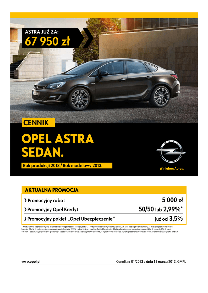 ASTRA JUŻ ZA: 67 950 zł Cennik OPEL ASTRA SEDAN. Rok produkcji 2013 / Rok modelowy 2013. AKTUALNA PROMOCJA Promocyjny rabat Promocyjny Opel Kredyt Promocyjny pakiet „Opel Ubezpieczenie” 5 000 zł 50/50 lub 2,99%* już od 3,5% * Kredyt 2,99% - reprezentatywny przykład dla nowego modelu; cena pojazdu 47 139 zł; wysokość wpłaty własnej wynosi 0 zł; czas obowiązywania umowy 24 miesiące; całkowita kwota kredytu: 50 416 zł; zmienna stopa oprocentowania kredytu: 2,99%; całkowity koszt kredytu: 8 633zł (obejmuje: składkę ubezpieczenia komunikacyjnego 1 886 zł, prowizję 756 zł; koszt odsetek 1 585 zł; przystąpienie do grupowego ubezpieczenia na życie 2 521 zł); RRSO wynosi 18,51%; całkowita kwota do zapłaty przez konsumenta: 59 049zł; kwota miesięcznej raty: 2 167 zł. www.opel.pl Cennik nr 01/2013 z dnia 11 marca 2013, GMPL Cennik – Opel Astra Sedan Rok produkcji 2013, rok modelowy 2013 Ceny promocyjne Business Executive 1.6 Twinport 115 KM M5 67 950 73 250 1.6 Twinport 115 KM A6 72 950 78 250 1.4 Turbo 140 KM* M6 72 950 78 250 1.4 Turbo 140 KM A6 77 950 83 250 1.6 Turbo 180 KM M6 77 950 83 250 1.6 Turbo 180 KM A6 82 950 88 250 1.7 CDTI 110 KM* M6 78 350 83 650 1.7 CDTI 130 KM* M6 80 750 86 050 Ceny promocyjne nie łączą się z innymi promocjami niż Opel Kredyt. Dokładny opis całej oferty promocyjnej znajduje się na stronie www.opel.pl w sekcji promocje lub dostępny jest u Autoryzowanego Dystrybutora marki Opel. Ceny promocyjne dotyczą klientów indywidualnych. Klientów flotowych w sprawie zapytań ofertowych prosimy o kontakt z wybranym Autoryzowanym Dystrybutorem marki Opel. Ceny katalogowe Business Executive 1.6 Twinport 115 KM M5 72 950 78 250 1.6 Twinport 115 KM A6 77 950 83 250 1.4 Turbo 140 KM* M6 77 950 83 250 1.4 Turbo 140 KM A6 82 950 88 250 1.6 Turbo 180 KM M6 82 950 88 250 1.6 Turbo 180 KM A6 87 950 93 250 1.7 CDTI 110 KM* M6 83 350 88 650 1.7 CDTI 130 KM* M6 85 750 91 050 * silnik dostępny z systemem Start/Stop – dopłata 1200 zł Cennik Opla Astry Sedan, rok produkcji 2013, rok modelowy 2013, nr 01/2013 z dnia 11 marca 2013 1/4 Wyposażenie standardowe Tapicerka materiałowa, czarna Układ stabilizacji toru jazdy ESP z TCS i ABS Przednie, boczne oraz kurtynowe poduszki powietrzne kierowcy i pasażera Klimatyzacja sterowana ręcznie Elektrycznie sterowane przednie szyby Elektrycznie sterowane i podgrzewane lusterka zewnętrzne w kolorze nadwozia Światła do jazdy dziennej w technologii LED Fotel kierowcy z regulacją wysokości Tylne siedzenia dzielone w proporcji 40/60 Kolumna kierownicy regulowana w pionie i poziomie Konsola centralna z przesuwanym podłokietnikiem i zamykanym schowkiem Zaczepy Isofix w oparciach tylnych zewnętrznych siedzeń Aktywne zagłówki foteli przednich Radioodtwarzacz CD/MP3 400 z 6 głośnikami Kierownica pokryta skórą Przyciski sterowania na kierownicy Komputer pokładowy Tempomat z ogranicznikiem prędkości Czujniki parkowania, tył Felgi strukturalne 17", stalowe Tapicerka materiałowa z elementami ze sztucznej skóry, czarna, szaro-czarna lub brązowa (dostępność zależna od koloru nadwozia) Klimatyzacja sterowana elektronicznie dwustrefowa Czujniki parkowania, przód i tył Elektrycznie sterowane tylne szyby Reflektory przeciwmgielne Felgi aluminiowe 17" Pakiet Oświetlenia Wnętrza. Lampki do czytania z tyłu. Podświetlane lusterka w osłonach przeciwsłonecznych. Chromowane zewnętrzne listwy dookoła okien bocznych Złącze USB dla urządzeń zewnętrznych Portal Bluetooth® telefonu komórkowego. Zawiera: Pakiet Oświetlenia Wnętrza. Układ wspomagania ruszania pod górę (w Business standard tylko ze skrzynią A6) Business Executive FX3 AJG +AYC C67 AEF/AXG DWE T3S AH3 A64 N37 DBU AHN AJF UZZ/UYN N34 UC3 U68 K33 UD7 PWT S S S S S S S S S S S S S S S S S S S S ― S S ― S S S S S S S S S S S S S S ― ― TADA/TAJK/TAFS ― S CJ2 UD5 AER T3U RTN/PGQ/ RCN/PXS 1 500/P 700 1 000/P 850/P S S S S 1 400 S TSP 450/P S MDE KTA UPH KB5 ― 500/P 1 100/P P/S S S S S Business Executive DWF T43 CF5 1 950 600 700 3 100 1 950 600/P 700 3 100 A8Z 4 800 4800/P 3 000 1 600 TAJI Wyposażenie dodatkowe NADWOZIE Lakier metaliczny / perłowy / opalizujący Elektrycznie składane lusterka boczne Tylny spojler na pokrywie bagażnika Okno dachowe Reflektory bi-ksenonowe AFL ze spryskiwaczami, automatycznym sterowaniem światłami drogowymi. Zawierają: Pakiet Dobrej Widoczności. Felgi aluminiowe 18" (dostępne w wybranych wersjach) Felgi aluminiowe 19" (dostępne w wybranych wersjach) Zapasowe kolo dojazdowe, stalowe 16" Pełnowymiarowe kolo zapasowe, stalowe 16" (niedostępne z felgami 18 i 19”) Zawieszenie FlexRide (dostępne z wybranymi silnikami) WNĘTRZE Tapicerka materiałowa czarno-beżowa (dostępność zależna od koloru nadwozia) Tapicerka materiałowa, czarna, z ergonomicznymi sportowymi fotelami przednimi Tapicerka skórzana perforowana z elementami ze sztucznej skóry, czarna lub brązowa, z ergonomicznymi i podgrzewanymi przednimi fotelami sportowymi, podłokietnikiem tylnym z otworem na długie przedmioty Podgrzewane przednie fotele Podgrzewanie kierownicy. Zawiera: podgrzewane fotele przednie Pakiet dla palących (popielniczka i zapalniczka) Radioodtwarzacz CD/MP3 600 NAVI z nawigacją 2D i złączem USB. Zawiera: antenę typu „płetwa rekina”, wyświetlacz kolorowy 7”, system audio „Premium” z 7 głośnikami, wyświetlacz graficzny między tarczami wskaźników, komunikaty w języku polskim. Radioodtwarzacz DVD/MP3 900 NAVI z nawigacją 3D i złączem USB. Zawiera: antenę typu „płetwa rekina”, wyświetlacz kolorowy 7”, system audio „Premium” z 7 głośnikami, komunikaty w języku polskim. Zintegrowany portal telefonu komórkowego. Zawiera: antenę typu „płetwa rekina”, Pakiet Oświetlenia Wnętrza. BEZPIECZEŃSTWO I UKŁADY WSPOMAGAJĄCE KIEROWCĘ System antynapadowy z kontrolą zamków drzwi bocznych Alarm. Zawiera: system antynapadowy z kontrolą zamków drzwi AF8