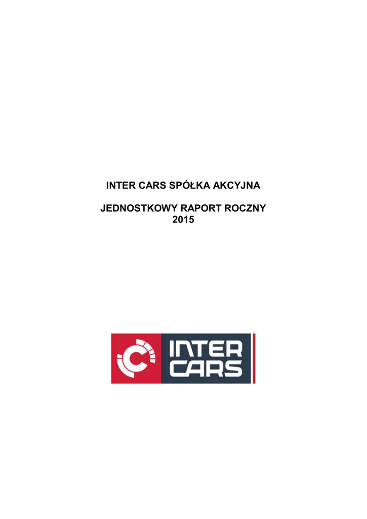 INTER CARS SPÓŁKA AKCYJNA JEDNOSTKOWY RAPORT ROCZNY 2015 RAPORT ROCZNY INTER CARS S.A. ZA ROK 2015 CZĘŚĆ I CZĘŚĆ II PISMO PREZESA ZARZĄDU WYBRANE DANE FINANSOWE ROCZNE JEDNOSTKOWE SPRAWOZDANIE FINANSOWE INTER CARS S.A. OŚWIADCZENIE CZŁONKÓW ZARZĄDU I ZATWIERDZENIE SPRAWOZDANIA FINANSOWEGO CZĘŚĆ III SPRAWOZDANIE ZARZĄDU Z DZIAŁALNOŚCI INTER CARS SA CZĘŚĆ IV OPINIA I RAPORT NIEZALEŻNEGO BIEGŁEGO REWIDENTA Z BADANIA 2 CZĘŚĆ II JEDNOSTKOWY RAPORT ROCZNY ZA OKRES od 1 stycznia do 31 grudnia 2015 roku Wybrane dane finansowe: ........................................................................................................................... 5 Informacje o INTER CARS S.A. .................................................................................................................... 6 1. 2. 3. 4. 5. 6. 7. 8. 9. 10. Przedmiot działalności ...........................................................................................................6 Siedziba ................................................................................................................................6 Dane kontaktowe...................................................................................................................6 Rada Nadzorcza (stan na dzień zatwierdzenia sprawozdania finansowego)...........................6 Zarząd (stan na dzień zatwierdzenia sprawozdania finansowego)..........................................6 Biegły rewident ......................................................................................................................6 Banki (stan na dzień zatwierdzenia sprawozdania finansowego) ............................................7 Spółki zależne i stowarzyszone .............................................................................................7 Notowania na giełdach ..........................................................................................................9 Data zatwierdzenia sprawozdania finansowego do publikacji .................................................9 ROCZNE JEDNOSTKOWE SPRAWOZDANIE Z SYTUACJI FINANSOWEJ ................................................ 10 ROCZNE JEDNOSTKOWE SPRAWOZDANIE Z CAŁKOWITYCH DOCHODÓW ......................................... 11 ROCZNE JEDNOSTKOWE SPRAWOZDANIE ZE ZMIAN W KAPITALE WŁASNYM ................................... 12 ROCZNE JEDNOSTKOWE SPRAWOZDANIE ZE ZMIAN W KAPITALE WŁASNYM (cd) ........................... 13 ROCZNE JEDNOSTKOWE SPRAWOZDANIE Z PRZEPŁYWÓW PIENIĘŻNYCH........................................ 14 Informacje objaśniające do rocznego jednostkowego sprawozdania finansowego................................. 15 1. 2. 2.1. 2.2. 2.3. 2.4. 2.5. 3. 3.1. 3.2. 4. 5. 6. 7. 8. 9. 10. 11. 12. 13. 14. 15. 16. 17. 18. 19. 20. 21. 22. 23. 24. 25. 26. 27. 28. 29. 30. 31. 32. Podstawa sporządzania rocznego jednostkowego sprawozdania finansowego .................... 15 Wpływ zmian standardów i interpretacji MSSF na jednostkowe sprawozdanie finansowe Spółki ...........................................................................................................................................15 Obowiązujące zmiany standardów i interpretacji MSSF .......................................................15 Standardy i Interpretacje MSSF opublikowane i zatwierdzone przez Unię Europejską, jeszcze nieobowiązujące ..................................................................................................................15 Standardy i Interpretacje przyjęte przez Radę Międzynarodowych Standardów Rachunkowości (IASB), oczekujące na zatwierdzenie przez UE....................................................................16 Podstawa wyceny................................................................................................................17 Waluta funkcjonalna i prezentacyjna ....................................................................................17 Opis stosowanych zasad rachunkowości .............................................................................17 Zmiany w polityce rachunkowości ........................................................................................17 Opis ważniejszych stosowanych zasad rachunkowości ........................................................ 17 Informacje na temat segmentów działalności .......................................................................25 Informacje uzupełniające .....................................................................................................25 Rzeczowe aktywa trwałe .....................................................................................................25 Wartości niematerialne ........................................................................................................27 Nieruchomości inwestycyjne ................................................................................................29 Inwestycje w jednostkach podporządkowanych ...................................................................29 Podatek odroczony..............................................................................................................33 Zapasy ................................................................................................................................34 Należności z tytułu dostaw i usług oraz pozostałe należności............................................... 34 Środki pieniężne i ekwiwalenty środków pieniężnych ........................................................... 36 Kapitał zakładowy i kapitał zapasowy ze sprzedaży akcji powyżej ich wartości nominalnej ... 36 Zysk netto na 1 akcję...........................................................................................................36 Zobowiązania z tytułu kredytów, pożyczek oraz innych instrumentów dłużnych .................... 37 Zobowiązania z tytułu dostaw i usług oraz pozostałe zob