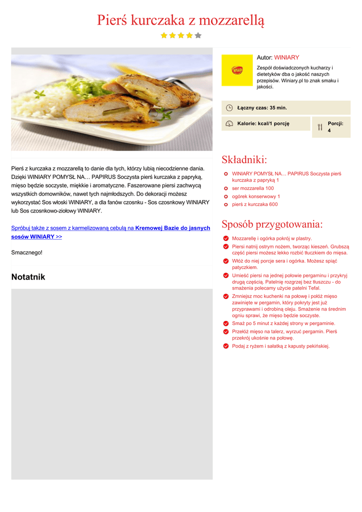 Pierś kurczaka z mozzarellą Autor: WINIARY Zespół doświadczonych kucharzy i dietetyków dba o jakość naszych przepisów. Winiary.pl to znak smaku i jakości. Łączny czas: 35 min. Kalorie: kcal/1 porcję Porcji: 4 Składniki: Pierś z kurczaka z mozzarellą to danie dla tych, którzy lubią niecodzienne dania. Dzięki WINIARY POMYSŁ NA… PAPIRUS Soczysta pierś kurczaka z papryką, mięso będzie soczyste, miękkie i aromatyczne. Faszerowane piersi zachwycą wszystkich domowników, nawet tych najmłodszych. Do dekoracji możesz wykorzystać Sos włoski WINIARY, a dla fanów czosnku Sos czosnkowy WINIARY WINIARY POMYSŁ NA… PAPIRUS Soczysta pierś kurczaka z papryką 1 ser mozzarella 100 ogórek konserwowy 1 pierś z kurczaka 600 lub Sos czosnkowoziołowy WINIARY. Spróbuj także z sosem z karmelizowaną cebulą na Kremowej Bazie do jasnych Sposób przygotowania: sosów WINIARY >> Mozzarellę i ogórka pokrój w plastry. Smacznego! Piersi natnij ostrym nożem, tworząc kieszeń. Grubszą część piersi możesz lekko rozbić tłuczkiem do mięsa. Włóż do niej porcje sera i ogórka. Możesz spiąć patyczkiem. Notatnik Umieść piersi na jednej połowie pergaminu i przykryj drugą częścią. Patelnię rozgrzej bez tłuszczu do smażenia polecamy użycie patelni Tefal. Zmniejsz moc kuchenki na połowę i połóż mięso zawinięte w pergamin, który pokryty jest już przyprawami i odrobiną oleju. Smażenie na średnim ogniu sprawi, że mięso będzie soczyste. Smaż po 5 minut z każdej strony w pergaminie. Przełóż mięso na talerz, wyrzuć pergamin. Pierś przekrój ukośnie na połowę. Podaj z ryżem i sałatką z kapusty pekińskiej.