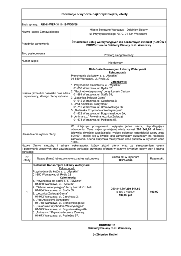 Informacje o wyborze najkorzystniejszej oferty Znak sprawy: UD-III-WZP-3411-19-WOŚ/08 Nazwa i adres Zamawiającego Przedmiot zamówienia Miasto Stołeczne Warszawa - Dzielnicy Bielany ul. Przybyszewskiego 70/72, 01-824 Warszawa Świadczenie usług weterynaryjnych dla bezdomnych zwierząt (KOTÓW I PSÓW) z terenu Dzielnicy Bielany m.st. Warszawy Tryb postępowania Przetarg nieograniczony Numer części Nie dotyczy Bielańskie Konsorcjum Lekarzy Weterynarii Pełnomocnik Przychodnia dla kotów s. c. „Myszkin” 01-850 Warszawa, ul. Rydla 32 Członkowie: 1. Przychodnia dla kotów s. c. .”Myszkin” 01-850 Warszawa, ul. Rydla 32; 2. ”Gabinet weterynaryjny” Jerzy Leszek Czubak Nazwa (firma) lub nazwisko oraz adres 01-884 Warszawa, ul. Staffa 59; wykonawcy, którego ofertę wybrano 3. „Lecznica Zwierząt Gama” 01-912 Warszawa, ul. Czechowa 2; 4. „Pod Anielskimi Skrzydłami” 01-716 Warszawa, ul. Broniewskiego 56; 5. „Bielańska Przychodnia Weterynaryjna” 01-923 Warszawa, ul. Bogusławskiego 6A; 6. „Anima s.c.” Prywatna lecznica Zwierząt 01-673 Warszawa, ul. Podleśna 57. W niniejszym postępowaniu wpłynęła jedna oferta, niepodlegająca odrzuceniu. Cena najkorzystniejszej oferty wynosi 260 844,60 zł brutto (słownie: dwieście sześćdziesiąt tysięcy osiemset czterdzieści cztery złote Uzasadnienie wyboru oferty 60/100) i mieści się w kwocie jaką zamawiający przeznaczył na realizację zamówienia. Oferta otrzymała maksymalna ilość punktów w kryterium cena 100%. Nazwy (firmy), siedziby i adresy wykonawców, którzy złoŜyli oferty wraz ze streszczeniem oceny i porównania złoŜonych ofert zawierającym punktację przyznaną ofertom w kaŜdym kryterium oceny ofert i łączną punktację Nr oferty 1 Nazwa (firma) lub nazwisko oraz adres wykonawcy Bielańskie Konsorcjum Lekarzy Weterynarii Pełnomocnik Przychodnia dla kotów s. c. „Myszkin” 01-850 Warszawa, ul. Rydla 32 Członkowie: 1. Przychodnia dla kotów s. c. .”Myszkin” 01-850 Warszawa, ul. Rydla 32; 2. ”Gabinet weterynaryjny” Jerzy Leszek Czubak 01-884 Warszawa, ul. Staffa 59; 3. „Lecznica Zwierząt Gama” 01-912 Warszawa, ul. Czechowa 2; 4. „Pod Anielskimi Skrzydłami” 01-718 Warszawa, ul. Broniewskiego 56; 5. „Bielańska Przychodnia Weterynaryjna” 01-923 Warszawa, ul. Bogusławskiego 6A; 6. „Anima s.c.” Prywatna lecznica Zwierząt 01-673 Warszawa, ul. Podleśna 57. Liczba pkt w kryterium 100% cena 260 844,60/ 260 844,60 x 100 x 100%= 100,00 pkt BURMISTRZ Dzielnicy Bielany m.st. Warszawy (-) Zbigniew Dubiel Razem pkt. 100,00