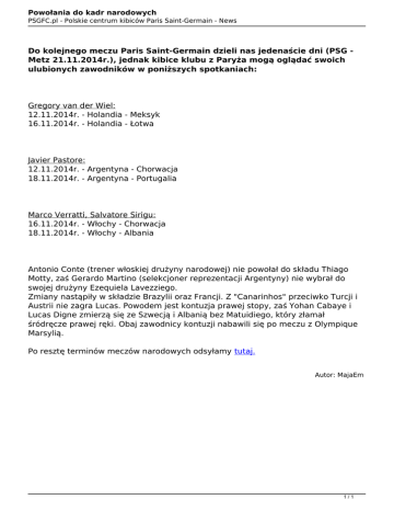 Powołania do kadr narodowych PSGFC.pl - Polskie centrum kibiców Paris Saint-Germain - News Do kolejnego meczu Paris Saint-Germain dzieli nas jedenaście dni (PSG Metz 21.11.2014r.), jednak kibice klubu z Paryża mogą oglądać swoich ulubionych zawodników w poniższych spotkaniach: Gregory van der Wiel: 12.11.2014r. - Holandia - Meksyk 16.11.2014r. - Holandia - Łotwa Javier Pastore: 12.11.2014r. - Argentyna - Chorwacja 18.11.2014r. - Argentyna - Portugalia Marco Verratti, Salvatore Sirigu: 16.11.2014r. - Włochy - Chorwacja 18.11.2014r. - Włochy - Albania Antonio Conte (trener włoskiej drużyny narodowej) nie powołał do składu Thiago Motty, zaś Gerardo Martino (selekcjoner reprezentacji Argentyny) nie wybrał do swojej drużyny Ezequiela Lavezziego. Zmiany nastąpiły w składzie Brazylii oraz Francji. Z "Canarinhos" przeciwko Turcji i Austrii nie zagra Lucas. Powodem jest kontuzja prawej stopy, zaś Yohan Cabaye i Lucas Digne zmierzą się ze Szwecją i Albanią bez Matuidiego, który złamał śródręcze prawej ręki. Obaj zawodnicy kontuzji nabawili się po meczu z Olympique Marsylią. Po resztę terminów meczów narodowych odsyłamy tutaj. Autor: MajaEm 1/1 Powered by TCPDF (www.tcpdf.org)