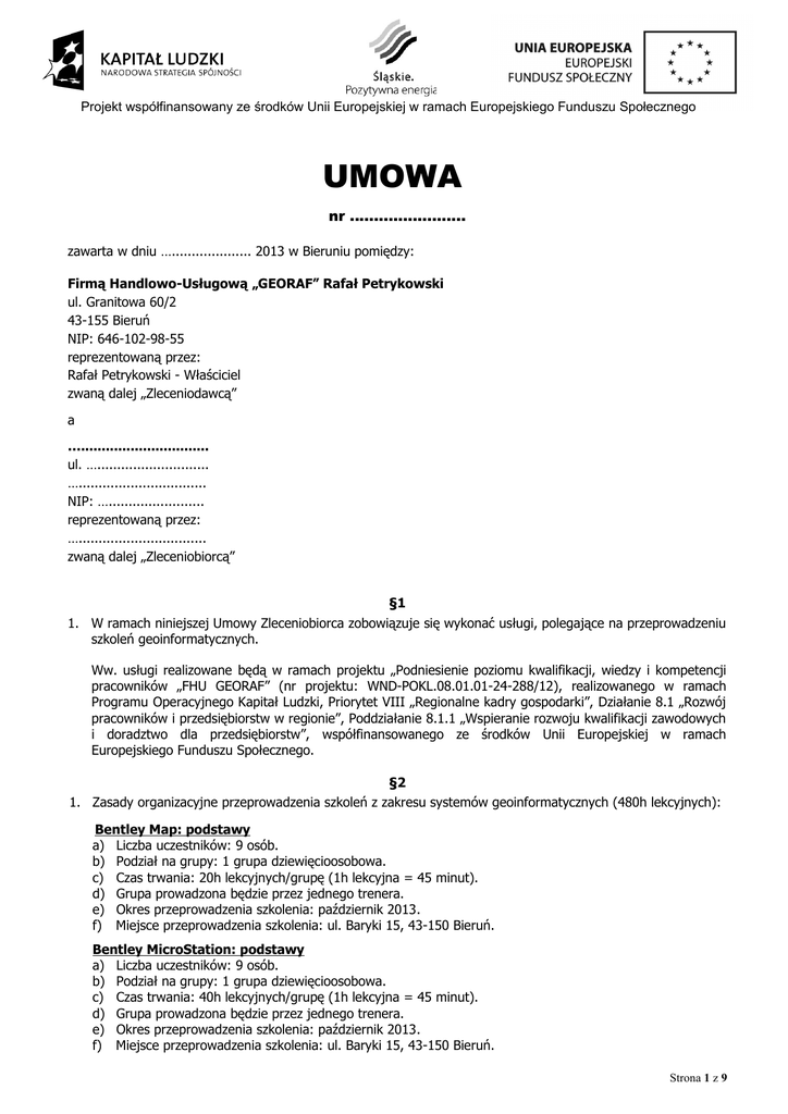 Projekt współfinansowany ze środków Unii Europejskiej w ramach Europejskiego Funduszu Społecznego UMOWA nr …..................... zawarta w dniu ….................... 2013 w Bieruniu pomiędzy: Firmą Handlowo-Usługową „GEORAF” Rafał Petrykowski ul. Granitowa 60/2 43-155 Bieruń NIP: 646-102-98-55 reprezentowaną przez: Rafał Petrykowski - Właściciel zwaną dalej „Zleceniodawcą” a …............................... ul. …............................ …................................ NIP: …........................ reprezentowaną przez: …................................ zwaną dalej „Zleceniobiorcą” §1 1. W ramach niniejszej Umowy Zleceniobiorca zobowiązuje się wykonać usługi, polegające na przeprowadzeniu szkoleń geoinformatycznych. Ww. usługi realizowane będą w ramach projektu „Podniesienie poziomu kwalifikacji, wiedzy i kompetencji pracowników „FHU GEORAF” (nr projektu: WND-POKL.08.01.01-24-288/12), realizowanego w ramach Programu Operacyjnego Kapitał Ludzki, Priorytet VIII „Regionalne kadry gospodarki”, Działanie 8.1 „Rozwój pracowników i przedsiębiorstw w regionie”, Poddziałanie 8.1.1 „Wspieranie rozwoju kwalifikacji zawodowych i doradztwo dla przedsiębiorstw”, współfinansowanego ze środków Unii Europejskiej w ramach Europejskiego Funduszu Społecznego. §2 1. Zasady organizacyjne przeprowadzenia szkoleń z zakresu systemów geoinformatycznych (480h lekcyjnych): Bentley Map: podstawy a) Liczba uczestników: 9 osób. b) Podział na grupy: 1 grupa dziewięcioosobowa. c) Czas trwania: 20h lekcyjnych/grupę (1h lekcyjna = 45 minut). d) Grupa prowadzona będzie przez jednego trenera. e) Okres przeprowadzenia szkolenia: październik 2013. f) Miejsce przeprowadzenia szkolenia: ul. Baryki 15, 43-150 Bieruń. Bentley MicroStation: podstawy a) Liczba uczestników: 9 osób. b) Podział na grupy: 1 grupa dziewięcioosobowa. c) Czas trwania: 40h lekcyjnych/grupę (1h lekcyjna = 45 minut). d) Grupa prowadzona będzie przez jednego trenera. e) Okres przeprowadzenia szkolenia: październik 2013. f) Miejsce przeprowadzenia szkolenia: ul. Baryki 15, 43-150 Bieruń. Strona 1 z 9 Bentley MicroStation: zaawansowany a) Liczba uczestników: 9 osób. b) Podział na grupy: 1 grupa dziewięcioosobowa. c) Czas trwania: 30h lekcyjnych/grupę (1h lekcyjna = 45 minut). d) Grupa prowadzona będzie przez jednego trenera. e) Okres przeprowadzenia szkolenia: październik 2013. f) Miejsce przeprowadzenia szkolenia: ul. Baryki 15, 43-150 Bieruń. Bentley MicroStation: for Cad Managers a) Liczba uczestników: 9 osób. b) Podział na grupy: 1 grupa dziewięcioosobowa. c) Czas trwania: 40h lekcyjnych/grupę (1h lekcyjna = 45 minut). d) Grupa prowadzona będzie przez jednego trenera. e) Okres przeprowadzenia szkolenia: listopad 2013. f) Miejsce przeprowadzenia szkolenia: ul. Baryki 15, 43-150 Bieruń. Bentley MicroStation: Essentials a) Liczba uczestników: 9 osób. b) Podział na grupy: 1 grupa dziewięcioosobowa. c) Czas trwania: 40h lekcyjnych/grupę (1h lekcyjna = 45 minut). d) Grupa prowadzona będzie przez jednego trenera. e) Okres przeprowadzenia szkolenia: listopad 2013. f) Miejsce przeprowadzenia szkolenia: ul. Baryki 15, 43-150 Bieruń. Bentley MicroStation: PowerDraft a) Liczba uczestników: 9 osób. b) Podział na grupy: 1 grupa dziewięcioosobowa. c) Czas trwania: 20h lekcyjnych/grupę (1h lekcyjna = 45 minut). d) Grupa prowadzona będzie przez jednego trenera. e) Okres przeprowadzenia szkolenia: grudzień 2013. f) Miejsce przeprowadzenia szkolenia: ul. Baryki 15, 43-150 Bieruń. Bentley MicroStation: MK Power a) Liczba uczestników: 9 osób. b) Podział na grupy: 1 grupa dziewięcioosobowa. c) Czas trwania: 30h lekcyjnych/grupę (1h lekcyjna = 45 minut). d) Grupa prowadzona będzie przez jednego trenera. e) Okres przeprowadzenia szkolenia: grudzień 2013. f) Miejsce przeprowadzenia szkolenia: ul. Baryki 15, 43-150 Bieruń. Bentley InRoads: podstawy a) Liczba uczestników: 9 osób. b) Podział na grupy: 1 grupa dziewięcioosobowa. c) Czas trwania: 30h lekcyjnych/grupę (1h lekcyjna = 45 minut). d) Grupa prowadzona będzie przez jednego trenera. e) Okres przeprowadzenia szkolenia: grudzień 2013. f) Miejsce przeprowadzenia szkolenia: ul. Baryki 15, 43-150 Bieruń. Bentley InRoads: zaawansowany a) Liczba uczestników: 9 osób. b) Podział na grupy: 1 grupa dziewięcioosobowa. c) Czas trwania: 30h lekcyjnych/grupę (1h lekcyjna = 45 minut). d) Grupa prowadzona będzie przez jednego trenera. e) Okres przeprowadzenia szkolenia: styczeń 2014. f) Miejsce przeprowadzenia szkolenia: ul. Baryki 15, 43-150 Bieruń. Bentley Power Civil: modelowanie terenów zalewowych a) Liczba uczestników: 9 osób. b) Podział na grupy: 1 grupa dziewięcioosobowa. c) Czas trwania: 40h lekcyjnych/grupę (1h lekcyjna = 45 minut). d) Grupa prowadzona będzie przez jednego trenera. e) Okres przeprowadzenia szkolenia: styczeń 2014. f) Miejsce przeprowadzenia szkolenia: ul. Baryki 15, 43-150 Bieruń. Strona 2 z 9 Bentley Power Civil: import danych pomiarowych, analiza sieci pomiarowych a) Liczba uczestników: 9 osób. b) Podział na grupy: 1 grupa dziewięcioosobowa. c) Czas trwania: 40h lekcyjnych/grupę (1h lekcyjna = 45 minut). d) Grupa prowadzona będzie przez jednego trenera. e) Okres przeprowadzenia szkolenia: styczeń 2014, luty 2014. f) Miejsce przeprowadzenia szkolenia: ul. Baryki 15, 43-150 Bieruń. Bentley Power Civil: linie nieciągłości, analiza: zlewni, eskpozycji a) Liczba uczestników: 9 osób. b) Podział na grupy: 1 grupa dziewięcioosobowa. c) Czas trwania: 40h lekcyjnych/grupę (1h lekcyjna = 45 minut). d) Grupa prowadzona będzie przez jednego trenera. e) Okres przeprowadzenia szkolenia: luty 2014. f) Miejsce przeprowadzenia szkolenia: ul. Baryki 15, 43-150 Bieruń. Geospatial Administrator a) Liczba uczestników: 9 osób. b) Podział na grupy: 1 grupa dziewięcioosobowa. c) Czas trwania: 20h lekcyjnych/grupę (1h lekcyjna = 45 minut). d) Grup