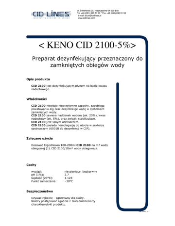 ul. Świerkowa 20, Niepruszewo 64-320 Buk Tel +48 (061) 896 81 90 * Fax +48 (061) 896 81 93 e-mail: [email protected] www.cidlines.com ` < KENO CID 2100-5%> Preparat dezynfekujący przeznaczony do zamkniętych obiegów wody Opis produktu CID 2100 jest dezynfekującym płynem na bazie kwasu nadoctowego. Właściwości CID 2100 niweluje nieprzyjemne zapachy, zapobiega powstawaniu alg oraz dezynfekuje wodę w systemach zamkniętych wody. CID 2100 zawiera nadtlenek wodoru (ok. 20%), kwas nadoctowy (ok. 5%), oraz związki stabilizujące. CID 2100 jest silnym utleniaczem. CID 2100 posiada homologację do użycia w sektorze spożywczym (6001B do dezynfekcji w CIP). Zalecane użycie Dozować tygodniowo 100-200ml CID 2100 na m³ wody obiegowej (1L CID 2100/10m³ wody obiegowej). Cechy wygląd: pH (1%): Gęstość (20°C): Punkt zamarzania: nie pieniący, bezbarwny 3.7 1.123 –30°C Bezpieczeństwo Używać rękawic - agresywny dla skóry. Należy postępować zgodnie z zaleceniami karty charakterystyki produktu. Technical data Sheet: CID 2100 Cid Lines Version: B