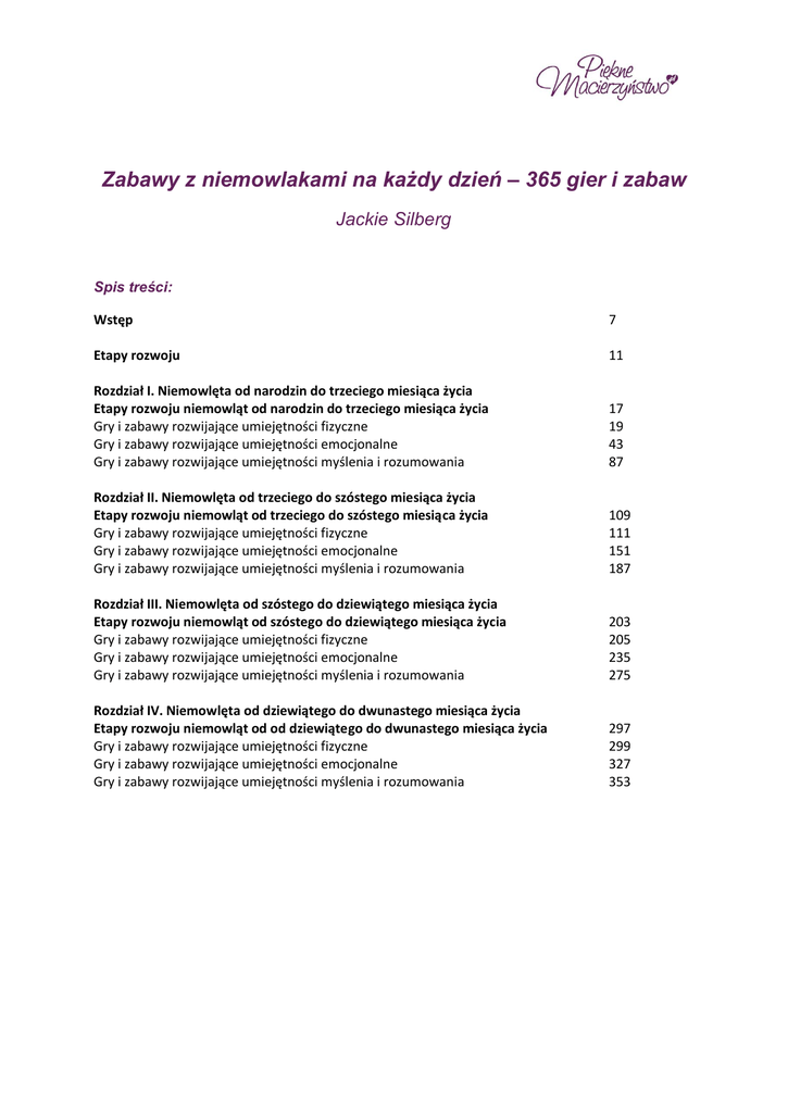 Zabawy z niemowlakami na każdy dzień – 365 gier i zabaw Jackie Silberg Spis treści: Wstęp 7 Etapy rozwoju 11 Rozdział I. Niemowlęta od narodzin do trzeciego miesiąca życia Etapy rozwoju niemowląt od narodzin do trzeciego miesiąca życia Gry i zabawy rozwijające umiejętności fizyczne Gry i zabawy rozwijające umiejętności emocjonalne Gry i zabawy rozwijające umiejętności myślenia i rozumowania 17 19 43 87 Rozdział II. Niemowlęta od trzeciego do szóstego miesiąca życia Etapy rozwoju niemowląt od trzeciego do szóstego miesiąca życia Gry i zabawy rozwijające umiejętności fizyczne Gry i zabawy rozwijające umiejętności emocjonalne Gry i zabawy rozwijające umiejętności myślenia i rozumowania 109 111 151 187 Rozdział III. Niemowlęta od szóstego do dziewiątego miesiąca życia Etapy rozwoju niemowląt od szóstego do dziewiątego miesiąca życia Gry i zabawy rozwijające umiejętności fizyczne Gry i zabawy rozwijające umiejętności emocjonalne Gry i zabawy rozwijające umiejętności myślenia i rozumowania 203 205 235 275 Rozdział IV. Niemowlęta od dziewiątego do dwunastego miesiąca życia Etapy rozwoju niemowląt od od dziewiątego do dwunastego miesiąca życia Gry i zabawy rozwijające umiejętności fizyczne Gry i zabawy rozwijające umiejętności emocjonalne Gry i zabawy rozwijające umiejętności myślenia i rozumowania 297 299 327 353