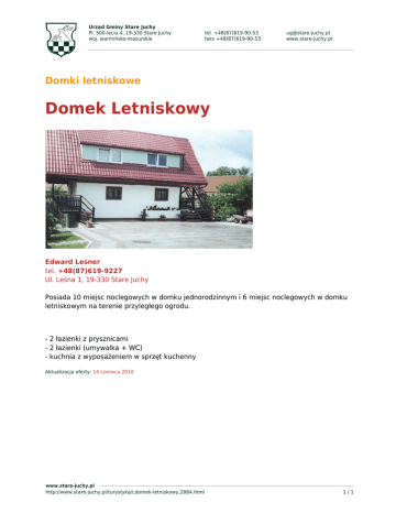 Urząd Gminy Stare Juchy Pl. 500-lecia 4, 19-330 Stare Juchy woj. warmińsko-mazurskie tel. +48(87)619-90-53 faks +48(87)619-90-53 [email protected] www.stare-juchy.pl Domki letniskowe Domek Letniskowy Edward Lesner tel. +48(87)619-9227 Ul. Leśna 1, 19-330 Stare Juchy Posiada 10 miejsc noclegowych w domku jednorodzinnym i 6 miejsc noclegowych w domku letniskowym na terenie przyległego ogrodu. - 2 łazienki z prysznicami - 2 łazienki (umywalka + WC) - kuchnia z wyposażeniem w sprzęt kuchenny Aktualizacja oferty: 14 czerwca 2010 www.stare-juchy.pl http://www.stare-juchy.pl/turystyka/i,domek-letniskowy,2884.html 1/1