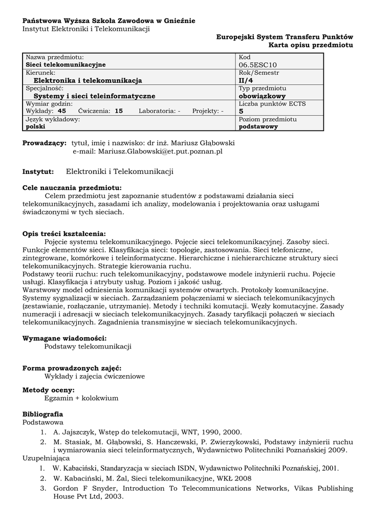 Państwowa Wyższa Szkoła Zawodowa w Gnieźnie Instytut Elektroniki i Telekomunikacji Europejski System Transferu Punktów Karta opisu przedmiotu Nazwa przedmiotu: Sieci telekomunikacyjne Kierunek: Kod 06.5ESC10 Rok/Semestr Elektronika i telekomunikacja II/4 Specjalność: Typ przedmiotu Systemy i sieci teleinformatyczne Wymiar godzin: Wykłady: 45 Ćwiczenia: 15 Język wykładowy: polski obowiązkowy Liczba punktów ECTS Laboratoria: - Projekty: - 5 Poziom przedmiotu podstawowy Prowadzący: tytuł, imię i nazwisko: dr inż. Mariusz Głąbowski e-mail: [email protected] Instytut: Elektroniki i Telekomunikacji Cele nauczania przedmiotu: Celem przedmiotu jest zapoznanie studentów z podstawami działania sieci telekomunikacyjnych, zasadami ich analizy, modelowania i projektowania oraz usługami świadczonymi w tych sieciach. Opis treści kształcenia: Pojęcie systemu telekomunikacyjnego. Pojęcie sieci telekomunikacyjnej. Zasoby sieci. Funkcje elementów sieci. Klasyfikacja sieci: topologie, zastosowania. Sieci telefoniczne, zintegrowane, komórkowe i teleinformatyczne. Hierarchiczne i niehierarchiczne struktury sieci telekomunikacyjnych. Strategie kierowania ruchu. Podstawy teorii ruchu: ruch telekomunikacyjny, podstawowe modele inżynierii ruchu. Pojęcie usługi. Klasyfikacja i atrybuty usług. Poziom i jakość usług. Warstwowy model odniesienia komunikacji systemów otwartych. Protokoły komunikacyjne. Systemy sygnalizacji w sieciach. Zarządzaniem połączeniami w sieciach telekomunikacyjnych (zestawianie, rozłączanie, utrzymanie). Metody i techniki komutacji. Węzły komutacyjne. Zasady numeracji i adresacji w sieciach telekomunikacyjnych. Zasady taryfikacji połączeń w sieciach telekomunikacyjnych. Zagadnienia transmisyjne w sieciach telekomunikacyjnych. Wymagane wiadomości: Podstawy telekomunikacji Forma prowadzonych zajęć: Wykłady i zajęcia ćwiczeniowe Metody oceny: Egzamin + kolokwium Bibliografia Podstawowa 1. A. Jajszczyk, Wstęp do telekomutacji, WNT, 1990, 2000. 2. M. Stasiak, M. Głąbowski, S. Hanczewski, P. Zwierzykowski, Podstawy inżynierii ruchu i wymiarowania sieci teleinformatycznych, Wydawnictwo Politechniki Poznańskiej 2009. Uzupełniająca 1. W. Kabaciński, Standaryzacja w sieciach ISDN, Wydawnictwo Politechniki Poznańskiej, 2001. 2. W. Kabaciński, M. Żal, Sieci telekomunikacyjne, WKŁ 2008 3. Gordon F Snyder, Introduction To Telecommunications Networks, Vikas Publishing House Pvt Ltd, 2003.