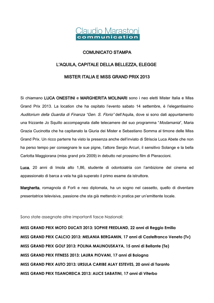 COMUNICATO STAMPA L’AQUILA, CAPITALE DELLA BELLEZZA, ELEGGE MISTER ITALIA E MISS GRAND PRIX 2013 Si chiamano LUCA ONESTINI e MARGHERITA MOLINARI sono i neo eletti Mister Italia e Miss Grand Prix 2013. La location che ha ospitato l’evento sabato 14 settembre, è l’elegantissimo Auditorium della Guardia di Finanza “Gen. S. Florio” dell’Aquila, dove si sono dati appuntamento una frizzante Jo Squillo accompagnata dalle telecamere del suo programma “Modamania”, Maria Grazia Cucinotta che ha capitanato la Giuria dei Mister e Sebastiano Somma al timone delle Miss Grand Prix. Un ricco parterre ha visto la presenza anche dell’inviato di Striscia Luca Abete che non ha perso tempo per consegnare le sue pigne, l’attore Sergio Arcuri, il sensitivo Solange e la bella Carlotta Maggiorana (miss grand prix 2009) in debutto nel prossimo film di Pieraccioni. Luca, 20 anni di Imola alto 1,86, studente di odontoiatria con l’ambizione del cinema ed appassionato di barca a vela ha già superato il primo esame da istruttore. Margherita, romagnola di Forlì e neo diplomata, ha un sogno nel cassetto, quello di diventare presentatrice televisiva, passione che sta già mettendo in pratica per un’emittente locale. Sono state assegnate altre importanti fasce Nazionali: MISS GRAND PRIX MOTO DUCATI 2013: SOPHIE FREDLAND, 22 anni di Reggio Emilia MISS GRAND PRIX CALCIO 2013: MELANIA BERGAMIN, 17 anni di Castelfranco Veneto (Tv) MISS GRAND PRIX GOLF 2013: POLINA MALINOUSKAYA, 15 anni di Bellante (Te) MISS GRAND PRIX FITNESS 2013: LAURA PIOVANI, 17 anni di Bologna MISS GRAND PRIX AUTO 2013: URSULA CARIBE ALAY ESTEVES, 20 anni di Taranto MISS GRAND PRIX TISANOREICA 2013: ALICE SABATINI, 17 anni di Viterbo IL MODELLO D’ITALIA 2013: MARCO FANTINI, 21 anni di Carpi (Mo) L’UOMO IDEALE D’ITALIA 2013: MARCO CIUCCI, 30 anni di Roma IL VOLTO + BELLO D’ITALIA 2013: SIMONE AMATO, 23 anni di Tivoli (Rm) UN BELLO PER IL CINEMA 2013: GIOVANNI AIELLO, 31 anni di Catania MISTER TALENTO 2013: DANIELE VECCHIONI, 28 anni di Civitanova Marche (Mc) MISTER TISANOREICA 2013: DANIELE VECCHIONI, 28 anni di Civitanova Marche (Mc) ORGANIZZAZIONE NAZIONALE: V.le Guido Duo, 5 – 42124 Reggio Emilia www.ilpiubelloditalia.it – www.missgrandprix.com tel. 0522-920785