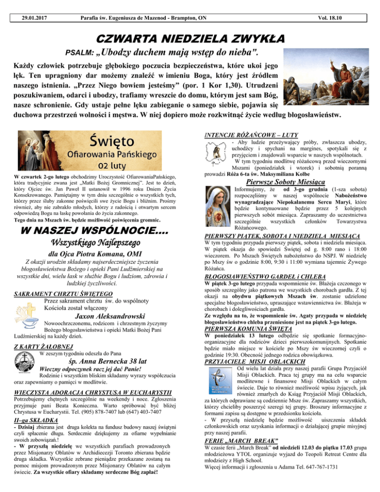Parafia św. Eugeniusza de Mazenod - Brampton, ON 29.01.2017 Vol. 18.10 CZWARTA NIEDZIELA ZWYKŁA PSALM: „Ubodzy duchem mają wstęp do nieba”. Każdy człowiek potrzebuje głębokiego poczucia bezpieczeństwa, które ukoi jego lęk. Ten upragniony dar możemy znaleźć w imieniu Boga, który jest źródłem naszego istnienia. „Przez Niego bowiem jesteśmy” (por. 1 Kor 1,30). Utrudzeni poszukiwaniem, odarci i ubodzy, trafiamy wreszcie do domu, którym jest sam Bóg, nasze schronienie. Gdy ustaje pełne lęku zabieganie o samego siebie, pojawia się duchowa przestrzeń wolności i męstwa. W niej dopiero może rozkwitnąć życie według błogosławieństw. INTENCJE RÓŻAŃCOWE – LUTY W czwartek 2-go lutego obchodzimy Uroczystość OfiarowaniaPańskiego, która tradycyjnie zwana jest „Matki Bożej Gromnicznej”. Jest to dzień, który Ojciec św. Jan Paweł II ustanowił w 1996 roku Dniem Życia Konsekrowanego. Pamiętajmy w tym dniu szczególnie o wszystkich tych, którzy przez śluby zakonne poświęcili swe życie Bogu i bliźnim. Prośmy również, aby nie zabrakło młodych, którzy z radością i otwartym sercem odpowiedzą Bogu na łaskę powołania do życia zakonnego. Tego dnia na Mszach św. będzie możliwość poświęcenia gromnic . W NASZEJ WSPÓLNOCIE.... Wszystkiego Najlepszego dla Ojca Piotra Komana, OMI Z okazji urodzin składamy najserdeczniejsze życzenia błogosławieństwa Bożego i opieki Pani Ludźmierskiej na wszystkie dni, wielu łask w służbie Bogu i ludziom, zdrowia i ludzkiej życzliwości. SAKRAMENT CHRZTU ŚWIĘTEGO Przez sakrament chrztu św. do wspólnoty Kościoła został włączony Jaxon Aleksandrowski Nowoochrzczonemu, rodzicom i chrzestnym życzymy Bożego błogosławieństwa i opieki Matki Bożej Pani Ludźmierskiej na każdy dzień. Z KARTY ŻAŁOBNEJ W zeszym tygodniu odeszła do Pana śp. Anna Bernecka 38 lat Wieczny odpoczynek racz jej dać Panie! Rodzinie i wszystkim bliskim składamy wyrazy współczucia oraz zapewniamy o pamięci w modlitwie. WIECZYSTA ADORACJA CHRYSTUSA W EUCHARYSTII Potrzebujemy chętnych szczególnie na weekendy i noce. Zgłoszenia przyjmuje pani Beata Konieczna. Warto spróbować być bliżej Chrystusa w Eucharystii. Tel. (905) 878-7407 lub (647) 403-7407 II–ga SKŁADKA - Dzisiaj zbierana jest druga kolekta na fundusz budowy naszej świątyni czyli spłacenie długu. Serdecznie dziękujemy za ofiarne wypełnianie swoich zobowiązań.! - W przyszłą niedzielę we wszystkich parafiach prowadzonych przez Misjonarzy Oblatów w Archidiecezji Toronto zbierana będzie druga składka. Wszystkie zebrane pieniądze przekazane zostaną na pomoc misjom prowadzonym przez Misjonarzy Oblatów na całym świecie. Za wszystkie ofiary składamy serdeczne Bóg zapłać! - Aby ludzie przeżywający próby, zwłaszcza ubodzy, uchodźcy i spychani na margines, spotykali się z przyjęciem i znajdowali wsparcie w naszych wspólnotach. W tym tygodniu modlitwę różańcową przed wieczornymi Mszami (poniedziałek i wtorek) i sobotnią poranną prowadzi Róża 6-ta św. Maksymiliana Kolbe Pierwsze Soboty Miesiąca Informujemy, że od 3-go grudnia (1-sza sobota) rozpoczęliśmy w naszej wspólnocie Nabożeństwo wynagradzające Niepokalanemu Sercu Maryi, które będzie kontynuowane będzie przez 5 kolejnych pierwszych sobót miesiąca. Zapraszamy do uczestnictwa szczególnie wszystkich członków Towarzystwa Różańcowego. PIERWSZY PIĄTEK, SOBOTA I NIEDZIELA MIESIĄCA W tym tygodniu przypada pierwszy piątek, sobota i niedziela miesiąca. W piątek okazja do spowiedzi Świętej od g. 8:00 rano i 18:00 wieczorem. Po Mszach Świętych nabożeństwo do NSPJ. W niedzielę po Mszy św o godzinie 8:00, 9:30 i 11:00 wymiana tajemnic Żywego Różańca. BŁOGOSłAWIEŃSTWO GARDEŁ i CHLEBA W piątek 3-go lutego przypada wspomnienie św. Błażeja czczonego w sposób szczególny jako patrona we wszystkich chorobach gardła. Z tej okazji na obydwu piątkowych Mszach św. zostanie udzielone specjalne błogosławieństwo, upraszające wstawiennictwa św. Błażeja w chorobach i dolegliwościach gardła. Ze względu na to, że wspomnienie św. Agaty przypada w niedzielę błogosławieństwo chleba przeniesione jest na piątek 3-go lutego. PIERWSZA KOMUNIA ŚWIĘTA W poniedziałek 13 lutego odbędzie się spotkanie formacyjnoorganizacyjne dla rodziców dzieci pierwszokomunijnych. Spotkanie będzie miało miejsce w kościele po Mszy św wieczornej czyli o godzinie 19:30. Obecność jednego rodzica obowiązkowa. PRZYJACIELE MISJI OBLACKICH Od wielu lat działa przy naszej parafii Grupa Przyjaciół Misji Oblackich. Praca tej grupy ma na celu wsparcie modlitewne i finansowe Misji Oblackich w całym świecie. Daje to również możliwość wpisu żyjących, jak również zmarłych do Ksiąg Przyjaciół Misji Oblackich, za których odprawiane są codziennie Msze św. Zapraszamy wszystkich, którzy chcieliby poszerzyć szeregi tej grupy. Broszury informacyjne z formami zapisu są dostępne w przedsionku kościoła. - W przyszłą niedzielę będzie możliwość uiszczenia składek członkowskich oraz uzyskania informacji o działającej grupie misyjnej przy naszej parafii. FERIE „MARCH BREAK” W czasie ferii „March Break” od niedzieli 12.03 do piątku 17.03 grupa młodzieżowa YTOL organizuje wyjazd do Teopoli Retreat Centre dla młodzieży z High School. Więcej informacji i zgłoszenia u Adama Tel. 647-767-1731 KOPERTKI NA ROK 2017 Przypominamy o odbiorze kopertek na rok 2017 jeszcze tylko dzisiaj są dostępne w Sali Parafialnej. SPRZĄTANIE KOŚCIOŁA ODBYWA SIĘ W PIĄTKI UWAGA! Jesteśmy w trakcie tworzenia nowych grup pomagających sprzątać nasz kościół. Bardzo prosimy naszych parafian, którzy mogą i chcą poświęcić trochę swojego czasu po piątkowej Mszy św. wieczornej o zgłaszanie się do Aleksandry Kaszkur: 647-830-8364. Bóg zapłać za Waszą pomoc! Piątek 03-go lutego Żywy Różaniec – Róża 9, 10, 12, 13, 14