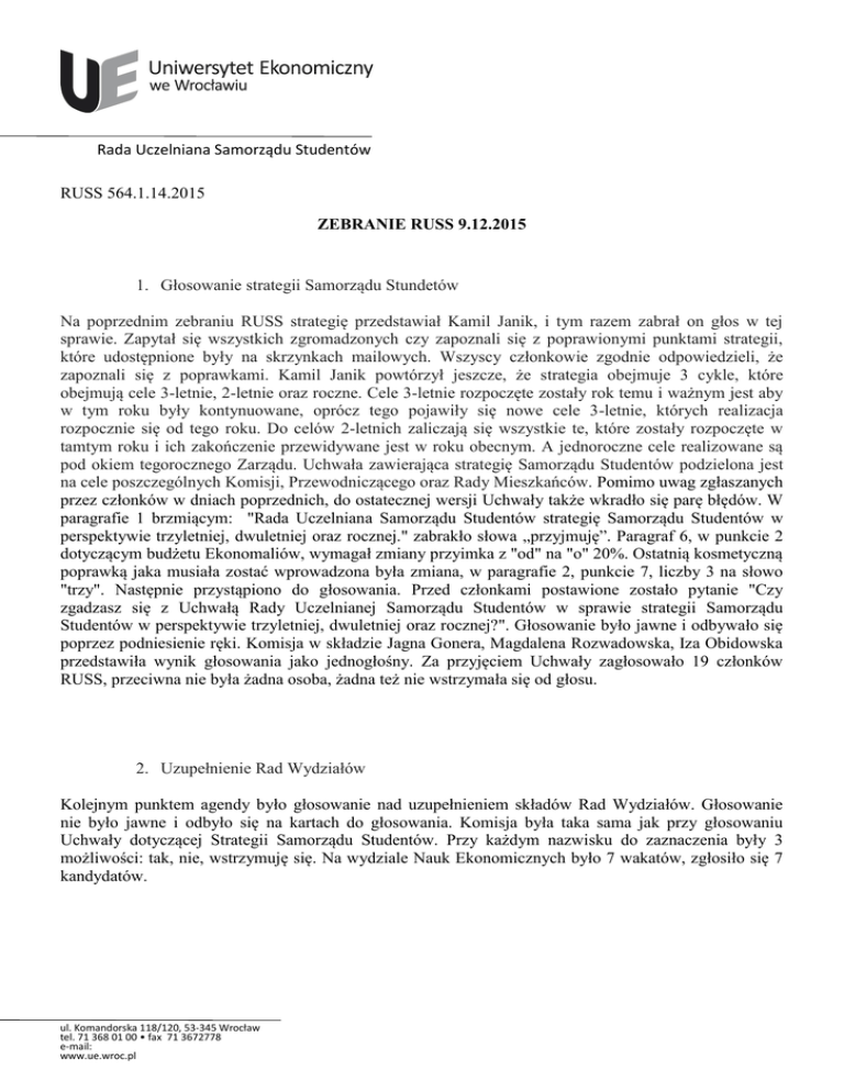 Rada Uczelniana Samorządu Studentów RUSS 564.1.14.2015 ZEBRANIE RUSS 9.12.2015 1. Głosowanie strategii Samorządu Stundetów Na poprzednim zebraniu RUSS strategię przedstawiał Kamil Janik, i tym razem zabrał on głos w tej sprawie. Zapytał się wszystkich zgromadzonych czy zapoznali się z poprawionymi punktami strategii, które udostępnione były na skrzynkach mailowych. Wszyscy członkowie zgodnie odpowiedzieli, że zapoznali się z poprawkami. Kamil Janik powtórzył jeszcze, że strategia obejmuje 3 cykle, które obejmują cele 3-letnie, 2-letnie oraz roczne. Cele 3-letnie rozpoczęte zostały rok temu i ważnym jest aby w tym roku były kontynuowane, oprócz tego pojawiły się nowe cele 3-letnie, których realizacja rozpocznie się od tego roku. Do celów 2-letnich zaliczają się wszystkie te, które zostały rozpoczęte w tamtym roku i ich zakończenie przewidywane jest w roku obecnym. A jednoroczne cele realizowane są pod okiem tegorocznego Zarządu. Uchwała zawierająca strategię Samorządu Studentów podzielona jest na cele poszczególnych Komisji, Przewodniczącego oraz Rady Mieszkańców. Pomimo uwag zgłaszanych przez członków w dniach poprzednich, do ostatecznej wersji Uchwały także wkradło się parę błędów. W paragrafie 1 brzmiącym: "Rada Uczelniana Samorządu Studentów strategię Samorządu Studentów w perspektywie trzyletniej, dwuletniej oraz rocznej." zabrakło słowa „przyjmuję”. Paragraf 6, w punkcie 2 dotyczącym budżetu Ekonomaliów, wymagał zmiany przyimka z "od" na "o" 20%. Ostatnią kosmetyczną poprawką jaka musiała zostać wprowadzona była zmiana, w paragrafie 2, punkcie 7, liczby 3 na słowo "trzy". Następnie przystąpiono do głosowania. Przed członkami postawione zostało pytanie "Czy zgadzasz się z Uchwałą Rady Uczelnianej Samorządu Studentów w sprawie strategii Samorządu Studentów w perspektywie trzyletniej, dwuletniej oraz rocznej?". Głosowanie było jawne i odbywało się poprzez podniesienie ręki. Komisja w składzie Jagna Gonera, Magdalena Rozwadowska, Iza Obidowska przedstawiła wynik głosowania jako jednogłośny. Za przyjęciem Uchwały zagłosowało 19 członków RUSS, przeciwna nie była żadna osoba, żadna też nie wstrzymała się od głosu. 2. Uzupełnienie Rad Wydziałów Kolejnym punktem agendy było głosowanie nad uzupełnieniem składów Rad Wydziałów. Głosowanie nie było jawne i odbyło się na kartach do głosowania. Komisja była taka sama jak przy głosowaniu Uchwały dotyczącej Strategii Samorządu Studentów. Przy każdym nazwisku do zaznaczenia były 3 możliwości: tak, nie, wstrzymuję się. Na wydziale Nauk Ekonomicznych było 7 wakatów, zgłosiło się 7 kandydatów. ul. Komandorska 118/120, 53-345 Wrocław tel. 71 368 01 00 • fax 71 3672778 e-mail: www.ue.wroc.pl Rada Uczelniana Samorządu Studentów Głosowanie na kandydatów przedstawiło się następująco: NAZWISKO I IMIĘ TAK WSTRZYMUJE SIĘ NIE 1. Hoffmann Piotr 18 0 0 2. Majerska Karolina 18 0 0 3. Nowicka Maria 18 0 0 4. Sikorski Piotr 18 0 0 5. Skoczek Klaudia 18 0 0 6. Veremchuk Yurii 17 0 1 7. Wurszt Kacper 18 0 0 W głosowaniu udział wzięło 19 członków RUSS, jeden głos został unieważniony. Na wydziale Zarządzania, Informatyki i Finansów dostępnych było 8 wakatów i taka sama też była liczba kandydatów. Głosowanie na tym wydziale przedstawiło się następująco: NAZWISKO I IMIĘ TAK WSTRZYMUJE SIĘ NIE 1. Fijał Monika 18 0 0 2. Gauza Joanna 18 0 0 3. Jurczyk Jakub 18 0 0 4. Kasprzyk Jakub 18 0 0 5. Lasota Magdalena 18 0 0 6. Łącka Joanna 18 0 0 7. Madera Aleksandra 18 0 0 8. Ziarno Dominik 18 0 0 W głosowaniu udział wzięło 19 członków RUSS, w tym wypadku także jeden głos został unieważniony. ul. Komandorska 118/120, 53-345 Wrocław tel. 71 368 01 00 • fax 71 3672778 e-mail: www.ue.wroc.pl Rada Uczelniana Samorządu Studentów Ostatnim głosowaniem było głosowanie na skład Rady Wydziału Inżynieryjno-Ekonomicznego. Liczba wakatów i kandydatów wynosiła 4. Głosowanie przedstawiło się następująco: NAZWISKO I IMIĘ TAK WSTRZYMUJE SIĘ NIE 1. Bińczyk Mariusz 18 0 1 2. Latosiński Marcin 18 0 1 3. Migdał Justyna 18 0 1 4. Rzeźnik Kamil 18 0 1 W głosowaniu udział wzięło 19 członków RUSS. 3. Głosowanie nad statutem IKSS Kolejnym punktem agendy było głosowanie statutu Informacji Kulturalno-Sportowej Studentów. Statut ten został przyjęty przez RUSS pod koniec ubiegłego roku, zatem głosowanie to jest tylko formalnością. Marcin Mistoń przypomniał, że jedyna zmiana w statucie to rozszerzenie zarządu o dwie osoby oraz poprawione błędy literowe. Głosowanie jest jawne i odbywa się poprzez uniesienie ręki. Głosy liczyła komisja w składzie: Monika Fijał, Magdalena Lasota, Bartosz Starzak. W głosowaniu udział brało 19 członków Rady Uczelnianej. Za przyjęciem było 19 głosów, przeciw - zero, wstrzymało się także zero. Statut został przyjęty przez Radę Uczelnianą Samorządu Studentów w sposób jednogłośny. 4. Rzecznik ds. kontaktów z mediami Następnie Maciej Miś złożył gratulacje dla nowego Rzecznika ds. Kontaktów z mediami, którym został Łukasz Niemczuk. Do gratulacji przyłączyli się wszyscy członkowie RUSS. Przy okazji gratulacje otrzymał także Jan Sawoniuk, koordynator Ekonomaliów 2016, i cały jego nowo wybrany zarząd projektowy. Prawie wszystkie stanowiska zarządu zostały już obsadzone. Jan ogłosił, że przedłużona została aplikacja na stanowisko ds. Kontaktów Zewnętrznych i gorąco zachęca do aplikowania. W najbliższym czasie rozesłane będą aplikacje na team Ekonomaliów'16, a na samym końcu aplikacje na sztab kryzysowy i wolontariat. Pozostając w duchu gratulacji, te także otrzymał koordynator UE Party Tomasz Zmarzły i jego cały team projektowy. 5. Głosowanie w sprawie powołania nowego Rzecznika Praw Studenta Ostatnim poza Wolnymi Wnioskami punktem agendy było podsumowanie w sprawie Rzecznika P