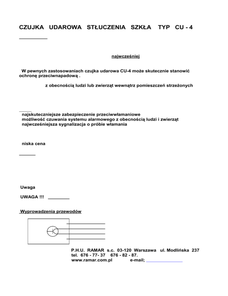 -------------------------------------------------------------------------------------------------------------------------------------------- CZUJKA UDAROWA STŁUCZENIA SZKŁA TYP CU - 4 -------------------------------------------------------------------------------------------------------------------------------------------- Zastosowanie Czujka udarowa CU - 4 służy do selektywnego wykrywania fal dźwiękowych powstających przy stłuczeniu szkła. Stosuje się do ochrony powierzchni szklanych. Zastosowanie w systemach alarmowych przeciwwłamaniowych daje najskuteczniejsze zabezpieczenie gdyż sygnalizuje o włamaniu najwcześniej . Czujka udarowa zadziała przy zbiciu szyby a często przy próbach bicia szyby , gdy intruz jest jeszcze poza strefą strzeżoną . W pewnych zastosowaniach czujka udarowa CU-4 może skutecznie stanowić ochronę przeciwnapadową . Zastosowanie czujek CU - 4 w systemie alarmowym pozwala na czuwanie systemu alarmowego z obecnością ludzi lub zwierząt wewnątrz pomieszczeń strzeżonych . Czujka Cu - 4 jest odporna na wibracje tafli szklanej wywołanej drżeniem okien np.; od przejeżdżających pojazdów . Nie zalecamy stosowanie czujek na okna wystawowe. Zalety - najskuteczniejsze zabezpieczenie przeciwwłamaniowe - możliwość czuwania systemu alarmowego z obecnością ludzi i zwierząt. - najwcześniejsza sygnalizacja o próbie włamania - wodoodporna obudowa, - łatwa instalacja, - mały pobór prądu - 2,5 mA, - niska cena -...................... Montaż Każda czujka CU-4 może chronić taflę szklaną dookólnie o promieniu około 1,5m. Najczęściej montaż polega na przyklejeniu czujki np. klejem silikonowym do powierzchni szklanej w narożniku okna , gdzie zbiegają się zawiasy , w odległości 2 - 6 cm. od krańców szyby , zależnie od wielkości tafli szklanej. Czujki można łączyć w jeden obwód dozorowy szeregowo. Czujka udarowa w obwodzie dozorowym posiada kryterium NC ( otwarty kolektor ). Uwaga ! Należy pamiętać że w szereg z obwodem alarmowym w czujce NC należy włączyć oporność obciążenia - najczęściej podyktowaną przez centralę alarmową . UWAGA !!! Nie należy wyjść alarmowych czujki C-E podłączać bezpośrednio do zasilania( bez obciążenia ) gdyż spowoduje to zniszczenie obwodu wyjściowego czujki i utratę gwarancji . W czasie transportu chronić przed silnymi udarami. Wyprowadzenia przewodów ; żółty /czerwony zielony / żółty czarny biały / niebieski --------------------- Zasilanie czujki + Obwód dozorowy - C - kolektor Obwód dozorowy - E - emiter Zasilanie czujki - Wyłączny Dystrybutor ; P.H.U. RAMAR s.c. 03-120 Warszawa ul. Modlińska 237 tel. 676 - 77- 37 676 - 82 - 87. www.ramar.com.pl e-mail; [email protected] R= obc. C E żółty /czerwony ------ Zasilanie czujki + zielony / żółty ------ Obwód dozorowy - C - kolektor czarny ------ Obwód dozorowy - E - emiter biały / niebieski ------ Zasilanie czujki żółty /czerwony zielony / żółty czarny biały / niebieski --------------------- Zasilanie czujki + Obwód dozorowy - C - kolektor Obwód dozorowy - E - emiter Zasilanie czujki - żółty /czerwony zielony / żółty czarny biały / niebieski --------------------- Zasilanie czujki + Obwód dozorowy - C - kolektor Obwód dozorowy - E - emiter Zasilanie czujki - żółty /czerwony zielony / żółty czarny biały / niebieski --------------------- Zasilanie czujki + Obwód dozorowy - C - kolektor Obwód dozorowy - E - emiter Zasilanie czujki - żółty /czerwony zielony / żółty czarny biały / niebieski --------------------- Zasilanie czujki + Obwód dozorowy - C - kolektor Obwód dozorowy - E - emiter Zasilanie czujki - żółty /czerwony zielony / żółty czarny biały / niebieski --------------------- Zasilanie czujki + Obwód dozorowy - C - kolektor Obwód dozorowy - E - emiter Zasilanie czujki - żółty /czerwony zielony / żółty czarny biały / niebieski --------------------- Zasilanie czujki + Obwód dozorowy - C - kolektor Obwód dozorowy - E - emiter Zasilanie czujki -