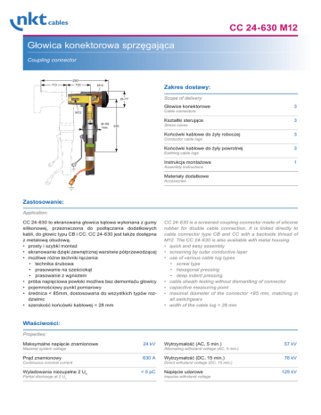 CC 24-630 M12 Głowica konektorowa sprzęgająca Coupling connector 110 ~290 100 Zakres dostawy: M12 Scope of delivery: Ø~77 Głowice konektorowe 3 Kształtki sterujące 3 Końcówki kablowe do żyły roboczej 3 Końcówki kablowe do żyły powrotnej 3 Instrukcja montażowa 1 Cable connectors M12 d Ø~69 max. Stress cones 245 Conductor cable lugs Earthing cable lugs Assembly instructions Materiały dodatkowe Accessories Zastosowanie: Application: CC 24-630 to ekranowana głowica kątowa wykonana z gumy silikonowej, przeznaczona do podłączania dodatkowych kabli, do głowic typu CB i CC. CC 24-630 jest także dostępna z metalową obudową. • prosty i szybki montaż • ekranowanie dzięki zewnętrznej warstwie półprzewodzącej • możliwe różne techniki łączenia • technika śrubowa • prasowanie na sześciokąt • prasowanie z wgniotem • próba napięciowa powłoki możliwa bez demontażu głowicy • pojemnościowy punkt pomiarowy • średnica < 85mm, dostosowana do wszystkich typów rozdzielnic • szerokość końcówki kablowej = 28 mm CC 24-630 is a screened coupling connector made of silicone rubber for double cable connection. It is linked directly to cable connector type CB and CC with a backside thread of M12. The CC 24-630 is also available with metal housing. • quick and easy assembly • screening by outer conductive layer • use of various cable lug types • screw type • hexagonal pressing • deep indent pressing • cable sheath testing without dismantling of connector • capacitive measuring point • maximal diameter of the connector <85 mm, matching in all switchgears • width of the cable lug = 28 mm Właściwości: Properties: Maksymalne napięcie znamionowe 24 kV Wytrzymałość (AC, 5 min.) 57 kV Prąd znamionowy 630 A Wytrzymałość (DC, 15 min.) 76 kV Maximal system voltage Continuous nominal current Wyładowania niezupełne 2 U0 Partial discharge at 2 U0 < 5 pC Alternating withstand voltage (AC, 5 min.) Direct withstand voltage (DC, 15 min.) Napięcie udarowe Impulse withstand voltage 125 kV CC 24-630 M12 Istotne dane techniczne przy zamawianiu osprzętu dla kabli 6/10(12) kV: Technical details for order for 6/10(12) kV cables: CC 24-630 w zestawie z końcówkami prasowanymi dla żyły głównej i żyły powrotnej CC 24-630 incl. crimp type cable lugs for conductor and screening wires Przekrój żyły roboczej Cross-section mm² Wielkość kształtki sterującej pole Size of stress cone Ø Zakres rozciągliwości na izolacji żyły głównej (d) Ø of core insulation (d) mm Nr referencyjny Ref. No. Al Cu 25 26 353 51 26 353 01 35 26 353 52 26 353 02 50 26 353 53 26 353 03 26 353 54 26 353 04 95 26 353 65 26 353 15 120 26 353 66 26 353 16 150 26 353 67 26 353 17 185 26 353 58 26 353 08 26 353 59 26 353 09 300 26 353 60 26 353 10 95 26 351 35 26 351 75 120 26 351 36 26 351 76 150 26 351 37 26 351 77 26 351 38 26 351 78 240 26 351 39 26 351 79 300 26 351 40 26 351 80 70 240 185 TYP 02 TYP 03 TYP 23 12.7 - 25.0 21.2 - 34.6 17.0 - 32.6 CC 24-630 w zestawie z końcówkami śrubowymi dla żyły głównej i żyły powrotnej CC 24-630 incl. screw type cable lugs for conductor and screening wires Przekrój żyły roboczej Cross-section mm² Wielkość kształtki sterującej pole Size of stress cone Ø Zakres rozciągliwości na izolacji żyły głównej (d) Ø of core insulation (d) mm Nr referencyjny Ref. No. 25 - 95 TYP 02 12.7 - 25.0 26 353 25 95 - 240 TYP 23 17.0 - 32.6 26 353 26/26 353 36 185 - 240 185 - 300 300 Al 300 Cu RMV 26 353 27/26 353 37 TYP 03 21.2 - 34.6 26 353 47 26 353 28 26 353 29 CC 24-630 M12 Istotne dane techniczne przy zamawianiu osprzętu dla kabli 12/20(24) kV: Technical details for order for 12/20(24) kV cables: CC 24-630 w zestawie z końcówkami prasowanymi dla żyły głównej i żyły powrotnej CC 24-630 incl. crimp type cable lugs for conductor and screening wires Przekrój żyły roboczej Cross-section mm² Wielkość kształtki sterującej pole Size of stress cone Ø Zakres rozciągliwości na izolacji żyły głównej (d) Ø of core insulation (d) mm Nr referencyjny Ref. No. Al Cu 25 26 353 51 26 353 01 35 26 353 52 26 353 02 26 353 53 26 353 03 70 26 353 54 26 353 04 95 26 353 55 26 353 05 120 26 353 56 26 353 06 26 353 57 26 353 07 26 353 58 26 353 08 240 26 353 59 26 353 09 300 26 353 60 26 353 10 25 26 351 31 26 351 71 35 26 351 32 26 351 72 50 26 351 33 26 351 73 70 26 351 34 26 351 74 26 351 35 26 351 75 120 26 351 36 26 351 76 150 26 351 37 26 351 77 185 26 351 38 26 351 78 240 26 351 39 26 351 79 50 150 185 95 TYP 02 TYP 03 TYP 23 12.7 - 25.0 21.2 - 34.6 17.0 - 32.6 CC 24-630 w zestawie z końcówkami śrubowymi dla żyły głównej i żyły powrotnej CC 24-630 incl. screw type cable lugs for conductor and screening wires Przekrój żyły roboczej Cross-section mm² Wielkość kształtki sterującej pole Size of stress cone Ø Zakres rozciągliwości na izolacji żyły głównej (d) Ø of core insulation (d) mm Nr referencyjny Ref. No. 25 - 95 TYP 02 12.7 - 25.0 26 353 25 95 - 240 95 - 300 300 Al 300 Cu RMV 26 353 27/26 353 37 TYP 03 21.2 - 34.6 26 353 47 26 353 28 26 353 29 Dane te zostały przygotowane wyłącznie w celach informacyjnych i nie zawierają żadnych, prawnie wiążących deklaracji czy gwarancji. Zobowiązania umowne wchodzą w życie dopiero po pisemnie podpisanej umowie, opisując szczegółowo warunki. nkt cables nie bierze odpowiedzialności za poprawność informacji zawartych w niniejszym dokumencie. Dane nie powinny być przekazywane osobom trzecim oraz rozpowszechniane. Wszelkie prawa autorskie pozostają własnością nkt cables i są zastrzeżone. This data was prepared for informational purposes only and does not contain any representations, legally binding declarations or guarantees. Contractual obligations shall only come into effect after a written contract, detailing the terms and conditions, has been signed. A liability of nkt cables for the correctness of the information co
