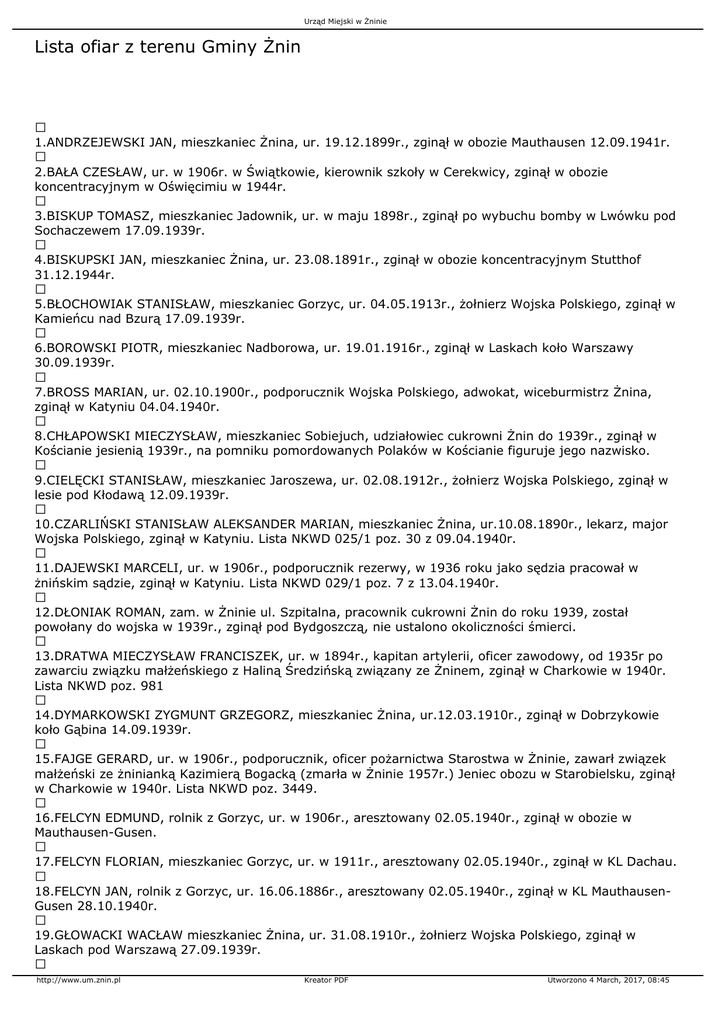 Urząd Miejski w Żninie Lista ofiar z terenu Gminy Żnin 1.ANDRZEJEWSKI JAN, mieszkaniec Żnina, ur. 19.12.1899r., zginął w obozie Mauthausen 12.09.1941r. 2.BAŁA CZESŁAW, ur. w 1906r. w Świątkowie, kierownik szkoły w Cerekwicy, zginął w obozie koncentracyjnym w Oświęcimiu w 1944r. 3.BISKUP TOMASZ, mieszkaniec Jadownik, ur. w maju 1898r., zginął po wybuchu bomby w Lwówku pod Sochaczewem 17.09.1939r. 4.BISKUPSKI JAN, mieszkaniec Żnina, ur. 23.08.1891r., zginął w obozie koncentracyjnym Stutthof 31.12.1944r. 5.BŁOCHOWIAK STANISŁAW, mieszkaniec Gorzyc, ur. 04.05.1913r., żołnierz Wojska Polskiego, zginął w Kamieńcu nad Bzurą 17.09.1939r. 6.BOROWSKI PIOTR, mieszkaniec Nadborowa, ur. 19.01.1916r., zginął w Laskach koło Warszawy 30.09.1939r. 7.BROSS MARIAN, ur. 02.10.1900r., podporucznik Wojska Polskiego, adwokat, wiceburmistrz Żnina, zginął w Katyniu 04.04.1940r. 8.CHŁAPOWSKI MIECZYSŁAW, mieszkaniec Sobiejuch, udziałowiec cukrowni Żnin do 1939r., zginął w Kościanie jesienią 1939r., na pomniku pomordowanych Polaków w Kościanie figuruje jego nazwisko. 9.CIELĘCKI STANISŁAW, mieszkaniec Jaroszewa, ur. 02.08.1912r., żołnierz Wojska Polskiego, zginął w lesie pod Kłodawą 12.09.1939r. 10.CZARLIŃSKI STANISŁAW ALEKSANDER MARIAN, mieszkaniec Żnina, ur.10.08.1890r., lekarz, major Wojska Polskiego, zginął w Katyniu. Lista NKWD 025/1 poz. 30 z 09.04.1940r. 11.DAJEWSKI MARCELI, ur. w 1906r., podporucznik rezerwy, w 1936 roku jako sędzia pracował w żnińskim sądzie, zginął w Katyniu. Lista NKWD 029/1 poz. 7 z 13.04.1940r. 12.DŁONIAK ROMAN, zam. w Żninie ul. Szpitalna, pracownik cukrowni Żnin do roku 1939, został powołany do wojska w 1939r., zginął pod Bydgoszczą, nie ustalono okoliczności śmierci. 13.DRATWA MIECZYSŁAW FRANCISZEK, ur. w 1894r., kapitan artylerii, oficer zawodowy, od 1935r po zawarciu związku małżeńskiego z Haliną Średzińską związany ze Żninem, zginął w Charkowie w 1940r. Lista NKWD poz. 981 14.DYMARKOWSKI ZYGMUNT GRZEGORZ, mieszkaniec Żnina, ur.12.03.1910r., zginął w Dobrzykowie koło Gąbina 14.09.1939r. 15.FAJGE GERARD, ur. w 1906r., podporucznik, oficer pożarnictwa Starostwa w Żninie, zawarł związek małżeński ze żninianką Kazimierą Bogacką (zmarła w Żninie 1957r.) Jeniec obozu w Starobielsku, zginął w Charkowie w 1940r. Lista NKWD poz. 3449. 16.FELCYN EDMUND, rolnik z Gorzyc, ur. w 1906r., aresztowany 02.05.1940r., zginął w obozie w Mauthausen-Gusen. 17.FELCYN FLORIAN, mieszkaniec Gorzyc, ur. w 1911r., aresztowany 02.05.1940r., zginął w KL Dachau. 18.FELCYN JAN, rolnik z Gorzyc, ur. 16.06.1886r., aresztowany 02.05.1940r., zginął w KL MauthausenGusen 28.10.1940r. 19.GŁOWACKI WACŁAW mieszkaniec Żnina, ur. 31.08.1910r., żołnierz Wojska Polskiego, zginął w Laskach pod Warszawą 27.09.1939r. http://www.um.znin.pl Kreator PDF Utworzono 4 March, 2017, 08:45 Urząd Miejski w Żninie 20.GÓRSKI EDMUND, mieszkaniec Żnin – Góra, ur. 03.07.1911r., żołnierz Wojska Polskiego, zginął pod Bzurą na skutek odniesionych ran 19.09.1939r. 21.GRABOWSKI WINCENTY, mieszkaniec Wójcina, ur. 08.01.1908r., zginął na przedmieściach Kutna 16.09.1939r 22.GRAJEK JÓZEF, mieszkaniec Dochanowa, 17.02.1879r, zmarł w obozie koncentracyjnym Dachau 26.02.1942r. 23.HAŁAS JÓZEF, mieszkaniec Góry, ur. 09.12.1909r., żołnierz Wojska Polskiego, zginął w potyczce pod Włocławkiem 13.09.1939r. 24.HAŁAS STANISŁAW, ur. 04.11.1921r., zamieszkały w Wenecji, uczeń rybacki, zginął w lesie pod Balczewem 18.12.1939r. 25.JANKOWSKI WALERIAN, ur. 11.04.1909r., nauczyciel w Żninie, sierżant podchorąży, brał udział w kampanii wrześniowej, zginął w Mielcu 06.08.1944r. 26.JASIŃSKI KAZIMIERZ, mieszkaniec Góry, ur. 19.10.1903r., żołnierz Wojska Polskiego, zginął w Laskach pod Warszawą 27.09.1939r. 27.JECHALIK STEFAN, ur. w Czarnkowie, mieszkał w Żninie, młody nauczyciel szkoły powszechnej w Żninie, zginął w Wylatowie koło Mogilna postrzelony przez Niemców. 28.KANTARSKI JAN, mieszkaniec Żnina, ur. 09.03.1908r., zmarł w miejscowości Kie-Russe 26.09.1944r. 29.KATAFIASZ LUDOMIR, mieszkaniec Jaroszewa, ur. w 1912r., podporucznik rezerwy, ziemianin, zginął w Katyniu 16.04.1940r. Lista NKWD 035/4 poz. 37 z 16.04.1940r. 30.KOŁODZIEJCZAK WACŁAW, mieszkaniec Jaroszewa, ur. w 1897r., kapitan rezerwy, ziemianin, zginął w Katyniu w 02.04.1940r. Lista NKWD 02/2 poz. 99 z 2.04.1940r. 31.KOZIEŁEK ZYGMUNT, mieszkaniec Podobowic, ur. 16.01.1911r., żołnierz Wojska Polskiego, zmarł w szpitalu w Legionowie 13.10.1939r. 32.KRUSZKA FRANCISZEK, mieszkaniec Dochanowa, ur. 30.11.1879r. w Sulinowie, zgon w obozie Dachau 09.12.1940r. 33.KRZEWIŃSKI MICHAŁ, mieszkaniec Żnina, ur. 18.09.1909r., rozstrzelany w Żninie 18.01.1940r. 34.KUNIKOWSKI LUDWIK, mieszkaniec Sielca, ur.01.06.1913r., zginął w obozie karnym w Inowrocławiu 01.12.1940r. 35.LIGIERSKI EDWARD, mieszkaniec Góry, ur.21.03.1914r., zginął w lesie w Balczewie rozstrzelany przez Niemców 36.LISIAK HENRYK, KAZIMIERZ, ur. w 1911r. w Koźlątkowie, podporucznik Wojska Polskiego, nauczyciel i kierownik szkoły w Sarbinowie I, poległy w kampanii wrześniowej pod Łaniętami 16.09.1939r. 37.MACIEJEWSKI BENEDYKT, uczeń II klasy LO, podchorąży Armii Krajowej, pseudonim „Sygnet”, zginął w Powstaniu Warszawskim 1.08.1944r. 38.MACIEJEWSKI DAMAZY, uczestnik ruchu oporu, zginął w Powstaniu Warszawskim w 1944r. 39.MACIEJEWSKI FRANCISZEK, mieszkaniec Brzyskorzystwi, ur. 25.07.1906r., zginął w lesie pod Balczewem 18.12.1939r. 40.MACIEJEWSKI HENRYK, podporucznik, żołnierz Armii Krajowej, pseudonim „Lech”, absolwent LO, zginął w czasie Powstania Warszawskiego pod gruzami szpitala jako ranny żołnierz. http://www.um.znin.pl Kreator PDF Utworzono 4 March, 2017, 08:45 Urząd Miejski w Żninie 41.MALAK WACŁAW JÓZEF, mieszkaniec Januszkowa, ur. 27.01.1910r., major Wojska Polskiego, zginął podczas lotu operacyjnego nad Holandią 02.05.1