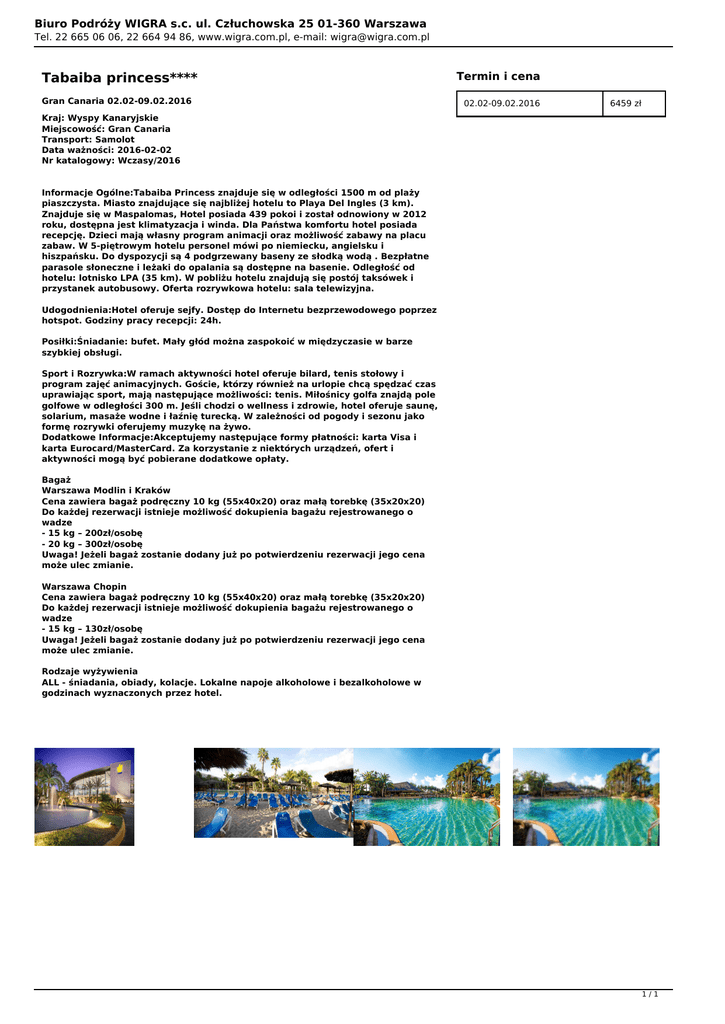 Biuro Podróży WIGRA s.c. ul. Człuchowska 25 01-360 Warszawa Tel. 22 665 06 06, 22 664 94 86, www.wigra.com.pl, e-mail: [email protected] Tabaiba princess**** Gran Canaria 02.02-09.02.2016 Termin i cena 02.02-09.02.2016 6459 zł Kraj: Wyspy Kanaryjskie Miejscowość: Gran Canaria Transport: Samolot Data ważności: 2016-02-02 Nr katalogowy: Wczasy/2016 Informacje Ogólne:Tabaiba Princess znajduje się w odległości 1500 m od plaży piaszczysta. Miasto znajdujące się najbliżej hotelu to Playa Del Ingles (3 km). Znajduje się w Maspalomas, Hotel posiada 439 pokoi i został odnowiony w 2012 roku, dostępna jest klimatyzacja i winda. Dla Państwa komfortu hotel posiada recepcję. Dzieci mają własny program animacji oraz możliwość zabawy na placu zabaw. W 5-piętrowym hotelu personel mówi po niemiecku, angielsku i hiszpańsku. Do dyspozycji są 4 podgrzewany baseny ze słodką wodą . Bezpłatne parasole słoneczne i leżaki do opalania są dostępne na basenie. Odległość od hotelu: lotnisko LPA (35 km). W pobliżu hotelu znajdują się postój taksówek i przystanek autobusowy. Oferta rozrywkowa hotelu: sala telewizyjna. Udogodnienia:Hotel oferuje sejfy. Dostęp do Internetu bezprzewodowego poprzez hotspot. Godziny pracy recepcji: 24h. Posiłki:Śniadanie: bufet. Mały głód można zaspokoić w międzyczasie w barze szybkiej obsługi. Sport i Rozrywka:W ramach aktywności hotel oferuje bilard, tenis stołowy i program zajęć animacyjnych. Goście, którzy również na urlopie chcą spędzać czas uprawiając sport, mają następujące możliwości: tenis. Miłośnicy golfa znajdą pole golfowe w odległości 300 m. Jeśli chodzi o wellness i zdrowie, hotel oferuje saunę, solarium, masaże wodne i łaźnię turecką. W zależności od pogody i sezonu jako formę rozrywki oferujemy muzykę na żywo. Dodatkowe Informacje:Akceptujemy następujące formy płatności: karta Visa i karta Eurocard/MasterCard. Za korzystanie z niektórych urządzeń, ofert i aktywności mogą być pobierane dodatkowe opłaty. Bagaż Warszawa Modlin i Kraków Cena zawiera bagaż podręczny 10 kg (55x40x20) oraz małą torebkę (35x20x20) Do każdej rezerwacji istnieje możliwość dokupienia bagażu rejestrowanego o wadze - 15 kg – 200zł/osobę - 20 kg – 300zł/osobę Uwaga! Jeżeli bagaż zostanie dodany już po potwierdzeniu rezerwacji jego cena może ulec zmianie. Warszawa Chopin Cena zawiera bagaż podręczny 10 kg (55x40x20) oraz małą torebkę (35x20x20) Do każdej rezerwacji istnieje możliwość dokupienia bagażu rejestrowanego o wadze - 15 kg – 130zł/osobę Uwaga! Jeżeli bagaż zostanie dodany już po potwierdzeniu rezerwacji jego cena może ulec zmianie. Rodzaje wyżywienia ALL - śniadania, obiady, kolacje. Lokalne napoje alkoholowe i bezalkoholowe w godzinach wyznaczonych przez hotel. 1/1 Powered by TCPDF (www.tcpdf.org)