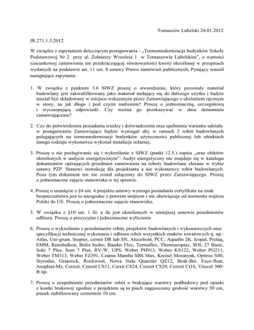 Tomaszów Lubelski 24.01.2012 IR.271.1.5.2012 W związku z zapytaniem dotyczącym postępowania - „Termomodernizacja budynków Szkoły Podstawowej Nr 2 przy ul. Żołnierzy Września 1 w Tomaszowie Lubelskim”, o wartości szacunkowej zamówienia nie przekraczającej równowartości kwoty określonej w przepisach wydanych na podstawie art. 11 ust. 8 ustawy Prawo zamówień publicznych, Pytający wnosił następujące zapytania: 1. W związku z punktem 3.6 SIWZ proszę o stwierdzenie, który pozostały materiał budowlany jest zakwalifikowany jako materiał nadający się do dalszego użytku i będzie musiał być składowany w miejscu wskazanym przez Zamawiającego z ułożeniem ręcznym w stosy, na jak długo i pod czyim nadzorem? Proszę o jednoznaczną, szczegółową i wyczerpującą odpowiedź. Czy można go przekazywać w dniu demontażu zamawiającemu? 2. Czy do potwierdzenia posiadania wiedzy i doświadczenia oraz spełnienia warunku udziału w postępowaniu Zamawiający będzie wymagał aby w ramach 2 robót budowlanych polegających na termomodernizacji budynków użyteczności publicznej lub obiektach innego rodzaju wykonawca wykonał instalacje solarnej. 3. Proszę o nie posługiwanie się i wykreślenie z SIWZ (punkt 12.5.) zapisu „oraz efektów określonych w audycie energetycznym”. Audyt energetyczny nie znajduje się w katalogu dokumentów opisujących przedmiot zamówienia na roboty budowlane zlecane w trybie ustawy PZP. Stanowi instrukcję dla projektanta a nie wykonawcy robót budowlanych. Poza tym dokument ten nie został załączony do SIWZ przez Zamawiającego. Proszę o jednoznaczne zajęcie stanowiska w tej sprawie. 4. Proszę o usunięcie z §4 ust. 4 projektu umowy wymogu posiadania certyfikatu na znak bezpieczeństwa jest to niezgodne z prawem unijnym i nie obowiązuje od momentu wejścia Polski do UE. Proszę o jednoznaczne zajęcie stanowiska. 5. W związku z §10 ust. 1 lit. a ile jest określonych w niniejszej umowie przedmiotów odbioru. Proszę o precyzyjne i jednoznaczne wyliczenie 6. Proszę o wykreślenie z przedmiarów robót, projektów budowlanych i wykonawczych oraz specyfikacji technicznej wykonania i odbioru robót wszystkich znaków towarowych tj. np.: Atlas, Uni-grunt, Stopter, cermit DR lub SN, Alucobont, PCC, Aquafin 2K, Icopal, Prelaq, EMM, Renobalkon, Bolix hydro, Bauder Flex, Termaflex, Thermacoptac, SOL 27 Basic, Soki 7 Plus, Som 7 Plus, RV-W, UPS, Weber PH913, Weber KS122, Weber PG211, Weber TM313, Weber FZ391, Czarna Mamba SBS Max, Kreisel Mozatynk, Optiroc S40, Styrodur, Granrock, Rockwool, Nowa Nala Quarzite QZ12, Bruk-Bet. Esco-fluat, Asoplast-Mz, Ceresit, Ceresit CS11, Cersit CS24, Ceresit CS29, Ceresit Ct16, Vitocel 300B itp. 7. Proszę o uzupełnienie przedmiarów robót o brakujące warstwy podbudowy pod opaski z kostki brukowej zgodnie z projektem są to piach zagęszczony grubość warstwy 50 cm, piasek stabilizowany cementem 10 cm. 8. Proszę o uzupełnienie przedmiarów robót o wyrównanie nierówności ścian za pomocą zaprawy wyrównawczo murarskiej zgodnie z projektem. 9. Proszę o uzupełnienie przedmiarów robót o uszczelnienie styków styropianu ze stolarką ślusarką i obróbkami blacharskimi przy pomocy trwale elastycznej masy, listew i sznurów dylatacyjnych zgodnie z projektem. 10.Proszę o jednoznaczną i precyzyjną odpowiedź czy należy wykonać izolację z wełny mineralnej z granulatu o grubości 18 czy 16 cm? 11.W pozycji 231 przedmiaru robót na roboty budowlane Zamawiający określił, że termioizolacja stropodachu niewentylowanego ma być wykonana z płyt styropianowych nieznanej grubości natomiast w projekcie zamawiający do izolacji stropodachów niewentylowanych pod bezpośrednie krycie papą narzucił płyty z wełny mineralnej o gęstości objętościowej co najmniej 40 kg/m3 i naprężeniu ściskającym przy 10% odkształceniu względny 20o Kpa. Proszę o jednoznaczną odpowiedź jak izolowanych stropodach płaski niewentylowany?. Czy twardym styropianem jeżeli tak to jakim? Czy styropianem laminowanym papą jeżeli tak to jakim? Czy twardą wełną mineralną (na pewno o gęstości objętościowej powyżej 80 kg/m3) jeżeli tak to jaką? JAKIEJ GRUBOCI? 12. Proszę o uzupełnienie przedmiarów robót o izokliny zgodnie z projektem. Zamawiający odpowiada: Ad.1. Materiałem takim będzie stolarka okienna, drzwiowa, itp. Będzie on przekazany zamawiającemu po kompleksowym demontażu. Ad.2. Zamawiający nie wymaga aby w ramach 2 robót budowlanych polegających na termomodernizacji budynków użyteczności publicznej lub obiektach innego rodzaju Wykonawca wykonywał instalację solarną. Ad.3. Zamawiający zamieszczając zapis ... „oraz efektów określonych w audycie energetycznym”, traktuje to jako zapis dodatkowy - niezobowiązujący. Ad.4. Zamawiający w §4 ust. 4 usuwa zapis …” na znak bezpieczeństwa, deklarację zgodności lub certyfikat zgodności z Polską Normą lub aprobatą techniczną”, zastępując go zapisem „certyfikaty i atesty”. Ad.5. Kara umowna za nieterminowe wykonanie będzie naliczana za niewykonanie całości zamówienia w terminie podanym w SIWZ. Ad.6. Podane znaki towarowe należy traktować jako przykładowe - wg. zapisu - pkt. 12.5. SIWZ. Ad.7. Warstwy podbudowy ujęte są w przedmiarach. W poz. 25, 87, 141, 196, 256, 323 należy przyjąć krotność 2. Ad.8. Przedmiar zawierają pozycję z przygotowaniem podłoża. Ad.9. Masy, listwy i sznury uwzględniają materiały pomocnicze – analogicznie w odnoszących się do nich pozycjach. Ad.10.Docelowa grubość warstwy izolacyjnej zawarta jest w opisie technicznym i ma wynosić 16 cm. Ad.11. Odpowiedz na powyższe zapytanie została udzielona w dniu 23.01.2012r. Ad.12. Uwzględnione są w ramach materiałów pomocniczych do poz. 231.