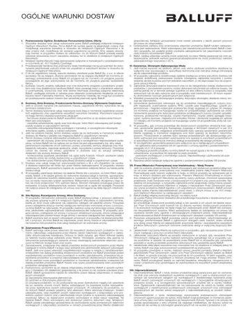 OGÓLNE WARUNKI DOSTAW I. Postanowienia Ogólne, Dodatkowe Porozumienia Ustne, Oferty 1. Wszystkie dostawy oraz usługi wykonywane przez Balluff podlegają wyłącznie niniejszym Ogólnym Warunkom Dostaw. Firma Balluff nie wyraża zgody na jakąkolwiek zmianę i/lub modyfikację warunków transakcji w stosunku do niniejszych Ogólnych Warunków o ile taka zmiana i/lub modyfikacja nie zostanie uzgodniona na piśmie. W/w zasady obowiązują również w przypadku dostaw do odbiorców, co do których Balluff posiada wiedzę odnośnie stosowania innych warunków dostawy niż te określone w niniejszych Ogólnych Warunkach. 2. Niniejsze Ogólne Warunki mają zastosowanie wyłącznie w transakcjach z przedsiębiorcami w rozumieniu art. 43.1 Kodeksu Cywilnego. 3. Przedstawiciele handlowi oraz pracownicy działu handlowego nie są upoważnieni do dokonywania jakichkolwiek ustnych zmian lub uzupełnień w warunkach dostaw w stosunku do niniejszych Ogólnych Warunków. 4. O ile nie uzgodniono inaczej, warunki dostawy określone przez Balluff Sp. z o.o. w ofercie sprzedaży nie są wiążące. Złożone zamówienia nie są wiążące dla Balluff do momentu pisemnego potwierdzenia przez Balluff ich przyjęcia lub do momentu ich przyjęcia poprzez przystąpienie do jego wykonywania lub do momentu ich przyjęcia poprzez wystawienie faktury. 5. Ilustracje, rysunki, projekty, kalkulacje oraz inne dokumenty związane z produktami, projektami oraz inną działalnością handlową Balluff, które zawierają treści o charakterze własności przemysłowej, know-how oraz inne istotne informacje pozostają wyłączna własnością Balluff i podlegają ochronie w zakresie praw własności przemysłowej niezależnie od przekazania takich materiałów Klientowi. Wyżej wymienione materiały nie mogą być powielane ani przekazywane osobom trzecim bez uprzedniej pisemnej zgody Balluff. II. Dostawy, Data Dostawy, Przekroczenie Terminu Dostawy, Wykonanie Częściowe 1. Jeśli w umowie wyraźnie nie zastrzeżono inaczej, uzgodnione terminy wykonania nie są terminami ostatecznymi. 2. Termin dostawy/wykonania usługi rozpoczyna swój bieg w momencie wyjaśnienia wszystkich wątpliwości oraz uzgodnienia wszystkich warunków transakcji. Warunkami rozpoczęcia biegu terminu dostawy/wykonania usługi jest: - terminowe dostarczenie do Balluff wszystkich dokumentów co do dostarczenia których Klient jest zobowiązany - wszystkie zatwierdzenia, zgody oraz inne decyzje, które Klient zobowiązany jest podjąć, zostały wydane w odpowiednim terminie - wszystkie zobowiązania Klienta wynikające z transakcji, w szczególności obowiązek dokonania zapłaty, zostały w całości wykonane. 3. Jeśli nie ustalono inaczej, termin dostawy uważa się za zachowany w momencie wysłania dostawy do Klienta z siedziby lub magazynu Balluff w uzgodnionym terminie. 4. Termin dostawy zostanie odpowiednio przedłużony o okres uzasadniony: - zaistnieniem siły wyższej, przez którą rozumie się w szczególności nieprzewidziane wydar zenia, na które Balluff nie ma wpływu ani za które nie jest odpowiedzialny (np. akty władz państwowych niezależnie od ich ważności, pożary, powodzie, wichury, eksplozje oraz inne katastrofy naturalne, niepokoje społeczne, strajki, korzystanie z prawa lockoutu). Powyższe odnosi się również do okresu opóźnienia w dostawie oraz do sytuacji dotknięcia działaniem siły wyższej dostawcy Balluff. - koniecznością uzyskania zatwierdzeń lub zgód osób trzecich, których uzyskanie należy do Klienta i które nie zostały dostarczone w uzgodnionym czasie - nie dostarczeniem przez Klienta specyfikacji produktu/usługi w uzgodnionym czasie. 5. Dostawy oraz usługi mogą być wykonywane partiami o ile z ich charakteru nie wynika, iż dostawa częściowa nie może być przez Klienta zaakceptowana. W przypadku dostaw częściowych, Balluff upoważniony będzie do wystawienia odrębnej faktury za każdą partię towaru/usługi. 6. W przypadku opóźnienia dostawy na żądania Klienta lub z przyczyn, za które Klient odpowiada, Balluff, o ile będzie gotowy do wykonania dostawy/usługi w terminie, upoważniony będzie do naliczenia kosztów składowania w wysokości nie niższej niż 0,5% wartości faktury za każdy rozpoczęty tydzień opóźnienia. Maksymalna wysokość obciążenia z tego tytułu nie może przekroczyć 10% wartości faktury. Stronom transakcji przysługuje prawo do wykazania, iż koszty składowania były wyższe, niższe lub w ogóle nie wystąpiły. Powyższe nie wyłącza prawa do odstąpienia od umowy oraz domagania się dalej idących odszkodowań. III. Siła Wyższa, Rozwiązanie Umowy, Wina Dostawcy 1. W przypadku niemożności wykonania przez Balluff dostawy/usługi, z przyczyn zaistnienia siły wyższej opisanej w pkt II.4 niniejszych Ogólnych Warunków w odpowiednim terminie, każda ze stron może całkowicie lub częściowo odstąpić od zawartej umowy. Powyższe prawo odstąpienia dotyczy również następczej niemożności wykonania umowy z przyczyn, za które Balluff nie odpowiada. W przypadku realizacji wyżej wymienionego prawa odstąpienia, jakakolwiek odpowiedzialność odszkodowawcza jest wyłączona. W przypadku podjęcia zamiaru odstąpienia od umowy z przyczyn określonych powyżej, strona odstępująca zobowiązana jest poinformować druga stronę o zamiarze odstąpienia bez zbędnej zwłoki. 2. Balluff zwolniony jest ze swoich zobowiązań umownych w przypadku nie dostarczenia Balluff, z przyczyn, za które Balluff nie odpowiada, przez strony trzecie w odpowiednim terminie towarów i/lub produktów i/lub usług niezbędnych do wykonania umowy. IV. Zastrzeżenie Prawa Własności 1. Balluff zastrzega sobie prawo własności do wszystkich dostarczonych produktów do momentu całkowitego uregulowania przez Klienta całości należności wynikających z całokształtu dotychczasowej współpracy. Dotyczy to także sytuacji, gdy Klient dokonał zapłaty za niektór