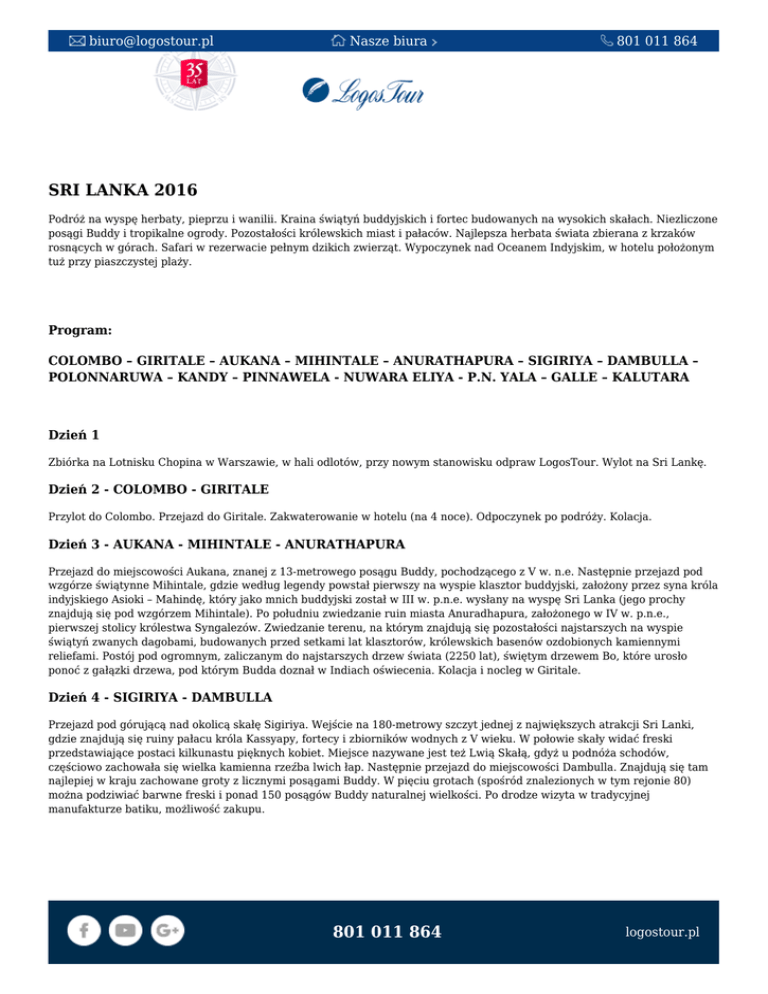 [email protected] Nasze biura 801 011 864 SRI LANKA 2016 Podróż na wyspę herbaty, pieprzu i wanilii. Kraina świątyń buddyjskich i fortec budowanych na wysokich skałach. Niezliczone posągi Buddy i tropikalne ogrody. Pozostałości królewskich miast i pałaców. Najlepsza herbata świata zbierana z krzaków rosnących w górach. Safari w rezerwacie pełnym dzikich zwierząt. Wypoczynek nad Oceanem Indyjskim, w hotelu położonym tuż przy piaszczystej plaży. Program: COLOMBO – GIRITALE – AUKANA – MIHINTALE – ANURATHAPURA – SIGIRIYA – DAMBULLA – POLONNARUWA – KANDY – PINNAWELA - NUWARA ELIYA - P.N. YALA – GALLE – KALUTARA Dzień 1 Zbiórka na Lotnisku Chopina w Warszawie, w hali odlotów, przy nowym stanowisku odpraw LogosTour. Wylot na Sri Lankę. Dzień 2 - COLOMBO - GIRITALE Przylot do Colombo. Przejazd do Giritale. Zakwaterowanie w hotelu (na 4 noce). Odpoczynek po podróży. Kolacja. Dzień 3 - AUKANA - MIHINTALE - ANURATHAPURA Przejazd do miejscowości Aukana, znanej z 13-metrowego posągu Buddy, pochodzącego z V w. n.e. Następnie przejazd pod wzgórze świątynne Mihintale, gdzie według legendy powstał pierwszy na wyspie klasztor buddyjski, założony przez syna króla indyjskiego Asioki – Mahindę, który jako mnich buddyjski został w III w. p.n.e. wysłany na wyspę Sri Lanka (jego prochy znajdują się pod wzgórzem Mihintale). Po południu zwiedzanie ruin miasta Anuradhapura, założonego w IV w. p.n.e., pierwszej stolicy królestwa Syngalezów. Zwiedzanie terenu, na którym znajdują się pozostałości najstarszych na wyspie świątyń zwanych dagobami, budowanych przed setkami lat klasztorów, królewskich basenów ozdobionych kamiennymi reliefami. Postój pod ogromnym, zaliczanym do najstarszych drzew świata (2250 lat), świętym drzewem Bo, które urosło ponoć z gałązki drzewa, pod którym Budda doznał w Indiach oświecenia. Kolacja i nocleg w Giritale. Dzień 4 - SIGIRIYA - DAMBULLA Przejazd pod górującą nad okolicą skałę Sigiriya. Wejście na 180-metrowy szczyt jednej z największych atrakcji Sri Lanki, gdzie znajdują się ruiny pałacu króla Kassyapy, fortecy i zbiorników wodnych z V wieku. W połowie skały widać freski przedstawiające postaci kilkunastu pięknych kobiet. Miejsce nazywane jest też Lwią Skałą, gdyż u podnóża schodów, częściowo zachowała się wielka kamienna rzeźba lwich łap. Następnie przejazd do miejscowości Dambulla. Znajdują się tam najlepiej w kraju zachowane groty z licznymi posągami Buddy. W pięciu grotach (spośród znalezionych w tym rejonie 80) można podziwiać barwne freski i ponad 150 posągów Buddy naturalnej wielkości. Po drodze wizyta w tradycyjnej manufakturze batiku, możliwość zakupu. 801 011 864 logostour.pl [email protected] Nasze biura 801 011 864 Dzień 5 - POLONNARUWA Przejazd do Polonnaruwa. Po drodze wizyta w pracowni rzeźbiarskiej i pokaz wytwarzania masek oraz rzeźb. Zwiedzanie pozostałości stolicy Syngalezów założonej w XI wieku, m.in. fragmenty imponujących budowli – pałacu królewskiego, klasztorów i licznych świątyń buddyjskich. Najciekawszym obiektem jest świątynia Gal Vihara z czterema wielkimi posągami Buddy wykutymi w skalnej ścianie. Po południu – dla chętnych fakultatywna przejażdżka na słoniu (cena ok. 25 USD). Dzień 6 - KANDY Przejazd do Kandy. Po drodze postój w okolicy Matale i spacer przez ogród przypraw, gdzie rosną m.in. drzewa cynamonowe, pieprzowe, wanilia. Następnie zwiedzanie położonego w skalnych grotach klasztoru Aluvihara z niezwykłymi freskami. Przyjazd do położonej wśród gór stolicy dawnego królestwa Kandy (1469-1815), będącego w latach 1815-1848 pod panowaniem brytyjskich kolonizatorów, obecnie drugiego co do wielkości miasta Sri Lanki. Zwiedzanie Świątyni Zęba, w której przechowuje się najważniejszą relikwię kraju – ząb Buddy. Wieczorem atrakcyjny pokaz tańców i folkloru wyspy. Kolacja. Dzień 7 - PINNAWELA - KANDY Wycieczka do schroniska dla słoni w Pinnawela. Pokaz karmienia małych słoniątek, a następnie widok na kąpiel całego stada w pobliskiej rzece. Po południu zwiedzanie Kandy – przejazd przez miasto, spacer po bazarze, zakupy. Dzień 8 - KANDY - NUWARA ELIYA Przejazd do wspaniałego królewskiego ogrodu botanicznego Peradeniya. Spacer alejami królewskich palm i gigantycznych drzew strefy tropikalnej. Następnie przejazd malowniczą trasą przez góry do Nuwara Eliya – ulubionej niegdyś przez Anglików górskiej miejscowości wypoczynkowej. Po drodze podziwianie widoków na góry i plantacje krzewów herbacianych. Postój w manufakturze herbaty – degustacja różnych gatunków i okazja do zakupu. Przyjazd do Nuwara Eliya. Dzień 9 - PARK NARODOWY YALA Przejazd przez góry na południe. Po drodze malowniczy wodospad Ravana Ella. Po przyjeździe do Parku Narodowego Yala, safari samochodami terenowymi. W parku żyje prawie 130 gatunków ptaków, m.in. kormorany, pawie, bażanty oraz liczne gatunki czapli. Nie brak także dzikich słoni, dzikich bawołów, małp, krokodyli. Czasem można się natknąć także na lamparta. Nocleg w okolicach parku. Dzień 10 - GALLE - KALUTARA Przejazd nad słoneczne wybrzeże Oceanu Indyjskiego. Zwiedzanie otoczonego murami obronnymi Galle. Miasto było zajęte w XVI w. przez Portugalczyków, a 200 lat później – przez Holendrów. Kupcy holenderscy pozostawili po sobie mury obronne, kilka zabytkowych budynków oraz niepowtarzalny klimat starej kolonii. Przejazd do hotelu w Kalutara. Zakwaterowanie (na 5 nocy). Dzień 11-14 - KALUTARA Wypoczynek w Kalutara. Na terenie hotelu jest m.in. odkryty basen, tropikalny ogród, 2 restauracje i spa. W wolnym czasie można się wybrać na indywidualną wycieczkę, np. spacer po okolicy lub wzdłuż plaży, wyjazd lokalnym transportem do Alutgama i safari łodzią po rzece lub przejazd autobusem/pociągiem na przedmieście Colombo, do zabytkowego hotelu Mount Lavinia (dodatkow