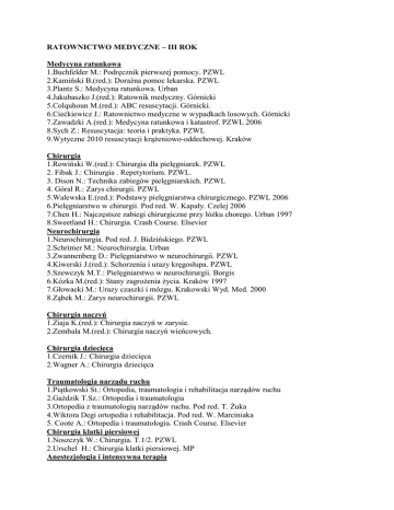 RATOWNICTWO MEDYCZNE – III ROK Medycyna ratunkowa 1.Buchfelder M.: Podręcznik pierwszej pomocy. PZWL 2.Kamiński B.(red.): Doraźna pomoc lekarska. PZWL 3.Plantz S.: Medycyna ratunkowa. Urban 4.Jakubaszko J.(red.): Ratownik medyczny. Górnicki 5.Colquhoun M.(red.): ABC resuscytacji. Górnicki. 6.Ciećkiewicz J.: Ratownictwo medyczne w wypadkach losowych. Górnicki 7.Zawadzki A.(red.): Medycyna ratunkowa i katastrof. PZWL 2006 8.Sych Z.: Resuscytacja: teoria i praktyka. PZWL 9.Wytyczne 2010 resuscytacji krążeniowo-oddechowej. Kraków Chirurgia 1.Rowiński W.(red.): Chirurgia dla pielęgniarek. PZWL 2. Fibak J.: Chirurgia . Repetytorium. PZWL. 3. Dison N.: Technika zabiegów pielęgniarskich. PZWL 4. Góral R.: Zarys chirurgii. PZWL 5.Walewska E.(red.): Podstawy pielęgniarstwa chirurgicznego. PZWL 2006 6.Pielęgniarstwo w chirurgii. Pod red. W. Kapały. Czelej 2006 7.Chen H.: Najczęstsze zabiegi chirurgiczne przy łóżku chorego. Urban 1997 8.Sweetland H.: Chirurgia. Crash Course. Elsevier Neurochirurgia 1.Neurochirurgia. Pod red. J. Bidzińskiego. PZWL 2.Schrimer M.: Neurochirurgia. Urban 3.Zwannenberg D.: Pielęgniarstwo w neurochirurgii. PZWL 4.Kiwerski J.(red.): Schorzenia i urazy kręgosłupa. PZWL 5.Szewczyk M.T.: Pielęgniarstwo w neurochirurgii. Borgis 6.Kózka M.(red.): Stany zagrożenia życia. Kraków 1997 7.Głowacki M.: Urazy czaszki i mózgu. Krakowski Wyd. Med. 2000 8.Ząbek M.: Zarys neurochirurgii. PZWL Chirurgia naczyń 1.Ziaja K.(red.): Chirurgia naczyń w zarysie. 2.Zembala M.(red.): Chirurgia naczyń wieńcowych. Chirurgia dziecięca 1.Czernik J.: Chirurgia dziecięca 2.Wagner A.: Chirurgia dziecięca Traumatologia narządu ruchu 1.Piątkowski St.: Ortopedia, traumatologia i rehabilitacja narządów ruchu 2.Gaździk T.Sz.: Ortopedia i traumatologia 3.Ortopedia z traumatologią narządów ruchu. Pod red. T. Żuka 4.Wiktora Degi ortopedia i rehabilitacja. Pod red. W. Marciniaka 5. Coote A.: Ortopedia i traumatologia. Crash Course. Elsevier Chirurgia klatki piersiowej 1.Noszczyk W.: Chirurgia. T.1/2. PZWL 2.Urschel H.: Chirurgia klatki piersiowej. MP Anestezjologia i intensywna terapia 1.Boulton T.B.: Anestezjologia dla studentów medycyny. PZWL 2.Stany zagrożenia życia. Pod red. A. Siemiątkowskiego. Libra 3.Stany zagrożenia życia. Wybrane standardy dla pielęgniarek. Pod red. M. Kózki. WUJ 4.Anestezjologia i intensywna terapia. Pod red. B. Kamińskiego. PZWL 5.Jakubaszko J.: ABC resuscytacji. Górnicki Wyd. Medyczne 6.Buchfelder M.A.: Podręcznik pierwszej pomocy. PZWL 7.Kamińska-Pakuła M.(red.): Ostre stany zagrożenia życia w chorobach wewnętrznych 8.Weinert M.: Anestezjologia. Crash Course. Elsevier Medycyna sądowa 1.Jakliński A.: Medycyna sądowa 2.Raszeja S.: Medycyna sądowa 3.DiMaio V.J.M.: Medycyna sądowa Psychiatria 1.Cameron A.: Psychiatria. Crash Course. Elsevier 2.Psychiatria –repetytorium pod red. A. Bilikiewicza 3.Jarema M.: Psychiatria. PZWL 4.Jarosz M.: Podstawy psychiatrii Położnictwo i ginekologia 1.Opala T.(red.): Ginekologia. Podr. dla położnych, pielęgniarek i fizjot. PZWL 2.Położnicwo. Podr. dla położnych i pielęgniarek. Pod red. G.H. Bręborowicza. PZWL 3. Troszyński M.: Ćwiczenia położnicze. PZWL 4. Pielęgniarstwo we współczesnym położnictwie i ginekologii. Czelej. 5. Cekański A.: Wybrane zagadnienia z położnictwa i ginekologii. ŚAM. 6.Pisarski T.: Położnictwo i ginekologia. PZWL. 7.Panay E.: Położnictwo i ginekologia. Crash Course. Elsevier Urologia 1.Urologia. Pod red. J. Leńko. PZWL 2.Urologia. Pod red. A. Borkowskiego.PZWL Laryngologia 1.Otorynolaryngologia. Pod red. B.J. Latkowskiego 2.Boeninghaus H.G.: Otorynolaryngologia. Springer PWN 1997 3.Janczewski G.: Konsultacje otolaryngologiczne 4.Otolaryngologia. Pod red. St. Iwankiewicza 5.Ćwiczenia z otolaryngologii. Pod red. St. Iwankiewicza 6.Viktor A.: Otolaryngologia. Crash Course. Elsevier Okulistyka 1.Podstawy okulistyki. Pod red. M.H. Niżankowskiej 2.Kański J.: Okulistyka kliniczna 3.James B.: Kompendium okulistyki Stany nagłe w neonatologii 1.Szczapa J.(red.): Neonatologia. PZWL 2.Łozińska D.(red.): Neonatologia. PZWL 3.Thomas R.(red.): Neonatologia. Urban Radiologia w medycynie ratunkowej 1.Radiologia. Pod red. Sz. L. Zgliczyńskiego. 2.Pruszyński B.(red.): Radiologia-diagnostyka obrazowa: Rtg, TK, USG, MR. PZWL 3. Bickle I.C.: Diagnostyka obrazowa . Seria Crash Course. Elsevier 4.Ultrasonografia układu ruchu. Elsevier Organizacje i zarządzanie w ochronie zdrowia 1.Włodarczyk C.W.: Systemy zdrowotne. WUJ 2.Czupryna A.(red.).: Zdrowie publiczne. Wybrane zagadnienia. T. 1. Versalius 3.Golinowska S.: Opieka zdrowotna w Polsce po reformie. Wyd. Case 4.Ryć K.(red.): Ochrona zdrowia na świecie. Kluwer 5.Nojszewska E.: System ochrony zdrowia w Polsce. Kluwer 6.Głowacka M.D: Zarządzanie zakładem opieki zdrowotnej. Termedia 7. Shortell S.M., Kaluzny A.D.: Podstawy zarządzania opieką zdrowotną.Vesalius 8. Kautsch M., Whitfield M., Klich J. (red.): Zarządzanie w opiece zdrowotnej. WUJ Edukacja zdrowotna 1.Andruszkiewicz (red.): Promocja zdrowia. Czelej 2.Lwow F.(red.): Promocja zdrowia. Urban 3.Woynarowska B.(red.): Teoretyczne podstawy edukacji zdrowotnej. KOWEZ W-wa 4.Charońska E.: Zarys wybranych problemów edukacji zdrowotnej. CEM 5.Karski J.B.: Praktyka i teoria promocji zdrowia. CeDeWu 6.Karski J.B.: Postępy promocji zdrowia. CeDeWu 2007 Ubezpieczenie społeczne i zdrowotne 1.Jończyk J.: Prawo zabezpieczenia społecznego. Zakamycze 2.Szpor G.: System ubezpieczeń społecznych. LexisNexis 3.Dzienisiuk D.: Zabezpieczenia społeczne w Unii Europejskiej. Centrum Doradztwa i Infor. 4.Krowicka A.: Opieka zdrowotna po wejściu do Unii Europejskiej. CeDeWu 5.Czechowska A.: Ubezpieczenia zdrowotne . Drągowski 2004