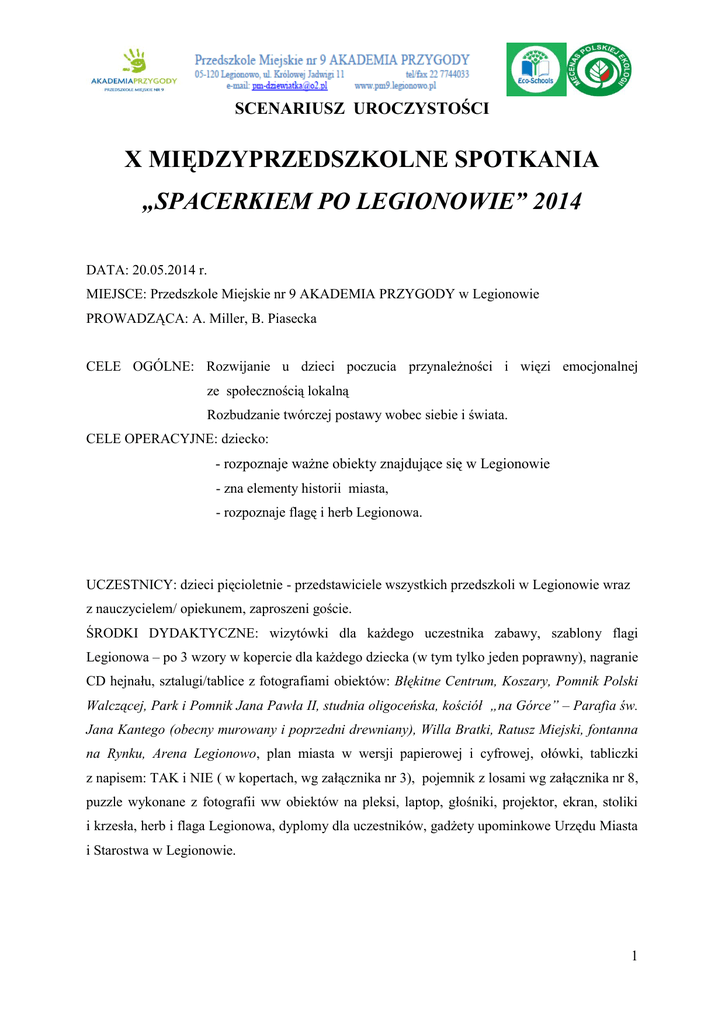 SCENARIUSZ UROCZYSTOŚCI X MIĘDZYPRZEDSZKOLNE SPOTKANIA „SPACERKIEM PO LEGIONOWIE” 2014 DATA: 20.05.2014 r. MIEJSCE: Przedszkole Miejskie nr 9 AKADEMIA PRZYGODY w Legionowie PROWADZĄCA: A. Miller, B. Piasecka CELE OGÓLNE: Rozwijanie u dzieci poczucia przynależności i więzi emocjonalnej ze społecznością lokalną Rozbudzanie twórczej postawy wobec siebie i świata. CELE OPERACYJNE: dziecko: - rozpoznaje ważne obiekty znajdujące się w Legionowie - zna elementy historii miasta, - rozpoznaje flagę i herb Legionowa. UCZESTNICY: dzieci pięcioletnie - przedstawiciele wszystkich przedszkoli w Legionowie wraz z nauczycielem/ opiekunem, zaproszeni goście. ŚRODKI DYDAKTYCZNE: wizytówki dla każdego uczestnika zabawy, szablony flagi Legionowa – po 3 wzory w kopercie dla każdego dziecka (w tym tylko jeden poprawny), nagranie CD hejnału, sztalugi/tablice z fotografiami obiektów: Błękitne Centrum, Koszary, Pomnik Polski Walczącej, Park i Pomnik Jana Pawła II, studnia oligoceńska, kościół „na Górce” – Parafia św. Jana Kantego (obecny murowany i poprzedni drewniany), Willa Bratki, Ratusz Miejski, fontanna na Rynku, Arena Legionowo, plan miasta w wersji papierowej i cyfrowej, ołówki, tabliczki z napisem: TAK i NIE ( w kopertach, wg załącznika nr 3), pojemnik z losami wg załącznika nr 8, puzzle wykonane z fotografii ww obiektów na pleksi, laptop, głośniki, projektor, ekran, stoliki i krzesła, herb i flaga Legionowa, dyplomy dla uczestników, gadżety upominkowe Urzędu Miasta i Starostwa w Legionowie. 1 PRZEBIEG SPOTKANIA: 1. Powitanie gości: - Prezydent Miasta Legionowo – p. Roman Smogorzewski dyrektor Muzeum Historycznego – p. Jacek Szczepański, p. Anna Kaca – autorka m.in. wierszy o Legionowie p. Zofia Błaszczak – były nauczyciel Przedszkola – inicjatorka i wieloletnia prowadząca „Spacerek” uczestników: - dzieci z legionowskich przedszkoli wraz z nauczycielkami. 2. Powitanie dzieci zabawą „Iskierka przyjaźni” 3. Zadanie pierwsze: Dzieci otrzymują trzy flagi w kopercie. Dwie z nich pokolorowane są błędnie. Polecenie: wybierz prawidłową flagę Legionowa. Flagę naszego miasta dzieci podnoszą do góry, Dyrektor Muzeum Historycznego, dr Jacek Szczepański przedstawia zarys historii powstania naszej flagi i herbu oraz ich symboliczne znaczenie ( materiały, załącznik nr 1.). 4. Zadanie drugie: Wysłuchanie hejnału Czy wiecie, co to jest hejnał?, czy znacie jakiś hejnał? ( np. krakowski) Hejnał Legionowa skomponowany został przez dyrektora Miejskiego Ośrodka Kultury w Legionowie Zenona Durkę. Obecnie pan Z. Durka reprezentuje naszą społeczność w Sejmie RP. Wysłuchamy go w wykonaniu p. Zenona Cendrowicza – na trąbce. Nagranie – załącznik nr 2 5. Zadanie trzecie: – Quiz wiedzy o Legionowie „TAK – NIE” do tekstów p. Anny Kaca ( załącznik nr 3) Nauczycielka odczytuje poszczególne zdania, uczestnicy odpowiadają wznosząc do góry plakietki z napisem: TAK lub NIE ( załącznik nr 4) 6. Zadanie czwarte: „Spacer po mieście” przy dźwiękach piosenki „Jedzie pociąg”. W sali rozmieszczone sztalugi z fotografiami obiektów, dzieci „spacerują zatrzymując się za prośbę nauczycielki przed fotografią jednego z obiektów. Przystanki: - Błękitne Centrum, - Koszary w Kozłówce 2 - Park Jana Pawła II z obeliskiem i pomnikiem Papieża ( informacja – Z. Błaszczak) - Studnia oligoceńska, rynek i park (kilka słów o rynku i parku), - fontanna na rynku, - Kościół na Górce (obecny murowany oraz poprzedni, drewniany), - Willa Bratki, (krótka rozmowa dzieci z dyrektorem Muzeum Historycznego, dr. Jackiem Szczepańskim) - Pomnik Polski Walczącej. - Ratusz Miejski, - Arena Legionowo Przy każdym kolejnym obiekcie krótka informacja osoby prowadzącej nt. „zwiedzanych miejsc” ( załącznik nr 5) - Instytut Aerologii – Alina i Czasław Centkiewiczowie –krótki filmik z wyprawy polarnej ( załącznik nr 6) 7. Zadanie piąte: Puzzle przedstawiające „zwiedzane obiekty” - układanie przy stolikach. 8. Zadanie szóste: Wirtualny spacer po Ratuszu – Prezydent R. Smogorzewski „oprowadza” po budynku przedstawiając funkcję Urzędu Miasta – prezentacja 3D ( laptop, projektor, ekran) ( załącznik nr 7) 9. Zadanie siódme: Labirynt Uczestnicy uzupełniają kartę pracy wg polecenia ( załącznik nr 8) Zagadki – edukacyjna gra komputerowa. (losy, komputer, projektor, ekran) Dzieci wyciągają losy z poleceniami: „odgadnij zagadkę 1(…)” lub „kliknij na rozwiązanie zagadki 1 (...)”( załącznik nr 9) Gra komputerowa „Zagadki” - zgodnie z instrukcją ( załącznik nr 10) 10. Zadanie dla uczestników i nauczycieli – na planie Legionowa znajdźcie wspólnie i oznaczcie przedszkole, które reprezentujecie: dziecko podaje numer i nazwę przedszkola oraz adres, nauczyciel odszukuje położenie na planie miasta). 11. Recytacja wierszy Anny Kacy- prezentacja w wykonaniu dzieci z Przedszkola Miejskiego nr 9 AKADEMIA PRZYGODY - piosenka „Miejsce na ziemi” śpiewają dzieci z grupy V - wiersz „Spacerkiem po…” czyta p. Anna Kaca - wiersz „Znaczek na mapie” – recytacja dzieci - wiersz ”Wycieczka”- recytacja dzieci 12. Podsumowanie konkursu, wręczenie dyplomów i upominków, wspólne zdjęcie. 13. Poczęstunek dla uczestników. 3 Wykaz załączników: Załącznik nr 1 - Załącznik nr 2 - Załącznik nr 3 Załącznik nr 4 Załącznik nr 5 Załącznik nr 6 - Załącznik nr 7 - Załącznik nr 8 Załącznik nr 9 Załącznik nr 10 - Flaga i herb Legionowa z opisem ( na podst. materiałów ze strony www.legionowo.pl ) Hejnał Miasta Legionowo – nagranie ( źródło: Urząd Miasta Legionowo) Quiz „TAK – NIE” / tekst ( autor: Anna Kaca) TAK – NIE / tabliczki do quizu informacje o obiektach Legionowa ( autor: Zofia Błaszczak) fragment relacji filmowej z wyprawy na Wyspę Niedźwiedzią (źródło: Muzeum Historyczne w Legionowie) wirtualna wycieczka po