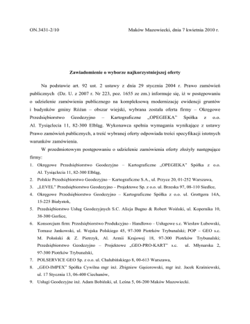 ON.3431-2/10 Maków Mazowiecki, dnia 7 kwietnia 2010 r. Zawiadomienie o wyborze najkorzystniejszej oferty Na podstawie art. 92 ust. 2 ustawy z dnia 29 stycznia 2004 r. Prawo zamówień publicznych (Dz. U. z 2007 r. Nr 223, poz. 1655 ze zm.) informuje się, iż w postępowaniu o udzielenie zamówienia publicznego na kompleksową modernizację ewidencji gruntów i budynków gminy Różan – obszar wiejski, wybrana została oferta firmy – Okręgowe Przedsiębiorstwo Geodezyjno – Kartograficzne „OPEGIEKA” Spółka z o.o. Al. Tysiąclecia 11, 82-300 Elbląg. Wykonawca spełnia wymagania wynikające z ustawy Prawo zamówień publicznych, a treść wybranej oferty odpowiada treści specyfikacji istotnych warunków zamówienia. W przedmiotowym postępowaniu o udzielenie zamówienia oferty złożyły następujące firmy: 1. Okręgowe Przedsiębiorstwo Geodezyjno – Kartograficzne „OPEGIEKA” Spółka z o.o. Al. Tysiąclecia 11, 82-300 Elbląg, 2. Polskie Przedsiębiorstwo Geodezyjno – Kartograficzne S.A., ul. Przyce 20, 01-252 Warszawa, 3. „LEVEL” Przedsiębiorstwo Geodezyjno – Projektowe Sp. z o.o. ul. Brzeska 97, 08-110 Siedlce, 4. Okręgowe Przedsiębiorstwo Geodezyjno – Kartograficzne Spółka z o.o. ul. Grottgera 14A, 15-225 Białystok, 5. Przedsiębiorstwo Usług Geodezyjnych S.C. Alicja Bugno & Robert Woiński, ul. Kopernika 10, 38-300 Gorlice, 6. Konsorcjum firm: Przedsiębiorstwo Produkcyjno - Handlowo – Usługowe s.c. Wiesław Łubowski, Tomasz Jankowski, ul. Wojska Polskiego 45, 97-300 Piotrków Trybunalski; POP – GEO s.c. M. Połoński & Z. Pietrzyk, Al. Armii Krajowej 18, 97-300 Piotrków Trybunalski; Przedsiębiorstwo Geodezyjno – Projektowe „GEO-PRO-KART” s.c. ul. Młynarska 2, 97-300 Piotrków Trybunalski, 7. POLSERVICE GEO Sp. z o.o. ul. Chałubińskiego 8, 00-613 Warszawa, 8. „GEO-IMPEX” Spółka Cywilna mgr inż. Zbigniew Gąsiorowski, mgr inż. Jacek Kraśniewski, ul. 17 Stycznia 13, 06-400 Ciechanów, 9. Usługi Geodezyjne inż. Adam Bobiński, ul. Leśna 5, 06-200 Maków Mazowiecki. W oparciu o kryterium oceny ofert – cena 100 % - dokonano streszczenia oceny i porównania złożonych ofert i przyznano ofertom następującą ilość punktów: 1. Okręgowe Przedsiębiorstwo Geodezyjno – Kartograficzne „OPEGIEKA” Spółka z o.o. Al. Tysiąclecia 11, 82-300 Elbląg – 100 pkt, 2. Polskie Przedsiębiorstwo Geodezyjno – Kartograficzne S.A., ul. Przyce 20, 01-252 Warszawa – 42,11 pkt, 3. „LEVEL” Przedsiębiorstwo Geodezyjno – Projektowe Sp. z o.o. ul. Brzeska 97, 08-110 Siedlce – 57,86 pkt, 4. Okręgowe Przedsiębiorstwo Geodezyjno – Kartograficzne Spółka z o.o. ul. Grottgera 14A, 15-225 Białystok – 44,82 pkt, 5. Przedsiębiorstwo Usług Geodezyjnych S.C. Alicja Bugno & Robert Woiński, ul. Kopernika 10, 38-300 Gorlice – 51,78 pkt, 6. Konsorcjum firm: Przedsiębiorstwo Produkcyjno - Handlowo – Usługowe s.c. Wiesław Łubowski, Tomasz Jankowski, ul. Wojska Polskiego 45, 97-300 Piotrków Trybunalski; POP – GEO s.c. M. Połoński & Z. Pietrzyk, Al. Armii Krajowej 18, 97-300 Piotrków Trybunalski; Przedsiębiorstwo Geodezyjno – Projektowe „GEO-PRO-KART” s.c. ul. Młynarska 2, 97-300 Piotrków Trybunalski – 29,30 pkt, 7. POLSERVICE GEO Sp. z o.o. ul. Chałubińskiego 8, 00-613 Warszawa – 26,07 pkt, 8. „GEO-IMPEX” Spółka Cywilna mgr inż. Zbigniew Gąsiorowski, mgr inż. Jacek Kraśniewski, ul. 17 Stycznia 13, 06-400 Ciechanów – 38,57 pkt, 9. Usługi Geodezyjne inż. Adam Bobiński, ul. Leśna 5, 06-200 Maków Mazowiecki – 43,50 pkt. Wicestarosta /-/ Janusz Gójski