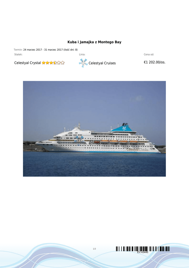 Kuba i Jamajka z Montego Bay Termin: 24 marzec 2017 - 31 marzec 2017 (ilość dni: 8) Statek: Celestyal Crystal Linia: Cena od: Celestyal Cruises €1 202.00/os. 1/3 EV:43440 TRASA REJSU Data Port Wpłynięcie Wypłynięcie piątek 24.03.2017 Montego Bay --:-- 20:00 sobota 25.03.2017 Santiago de Cuba 08:00 16:00 dzień 3 niedziela 26.03.2017 Dzień na morzu --:-- --:-- dzień 4 poniedziałek 27.03.2017 Hawana 09:30 --:-- wtorek 28.03.2017 Hawana --:-- 17:00 środa 29.03.2017 Punta Frances, Isla de la Juventud 13:00 18:00 07:00 15:00 08:00 --:-- dzień 1 dzień 2 dzień 5 dzień 6 Legenda Jamajka Kuba Kuba Kuba Kuba dzień 7 dzień 8 czwartek 30.03.2017 Cienfuegos piątek 31.03.2017 Montego Bay Kuba Jamajka CENNIK Cena katalogowa Kabina wewnętrzna od €1 202.00 Kabina zewnętrzna z oknem od €1 454.00 Suite (apartament) od €1 855.00 Kabina jednoosobowa na zapytanie 3, 4 i 5 osoba dorosła w kabinie od €972.00 dziecko od 2 do 12 lat jako 3, 4 i 5 osoba w kabinie od €641.00 dziecko od 0 do 2 lat jako 3, 4 i 5 osoba w kabinie €149.00 Cena promocyjna 2/3 EV:43440 Opłaty portowe w cenie Uwaga! Ceny za osobę w kabinie dwuosobowej. Cena zawiera: zakwaterowanie w kabinie wybranej kategorii; wyżywienie - 3 główne posiłki, podwieczorek; pakiet napojów all inclusive Blue (dorośli), White (dzieci); dwie wycieczki Havana City Tour i Panorami Santiago de Cuba; opłaty portowe; napiwki; napoje serwowane do śniadania i w bufetach samoobsługowych; serwis bagażowy podczas wejścia i zejścia ze statku; serwis kabinowy; korzystanie ze wszystkich urządzeń sportowo - rekreacyjnych znajdujących się na pokładzie statku (basen, jacuzzi, sala fitness, itp.); udział we wszystkich imprezach organizowanych na statku (przedstawienia w teatrze, koncerty, programy animacyjne itp.). Cena nie zawiera: kosztów dojazdu do portu; ewentualnych noclegów w hotelu przed/po rejsie i transferów; wycieczek fakultatywnych w trakcie rejsu (poza uwzględnionymi w cenie); korzystania z barów, mini baru w kabinie oraz napojów zamawianych w restauracji*; korzystania z punktów usługowych (fryzjer, pralnia, fotograf, salon piękności i odnowy biologicznej, internet) i wydatków osobistych; ubezpieczenia KL, NNW i bagaż, Karty Turysty (ok. 23EUR/os. - do nabycia w konsulacie kubańskim w Warszawie, opłaty wylotowej z Kuby ok. 25CUC/os. płatnej na miejscu. Uwagi: Przeloty na Kubę i Jamajkę obsługiwane są m. in. przez linie KLM i Air France - koszt przelotu to ok. 3500 - 4500PLN w zależności od terminu. 3/3 EV:43440