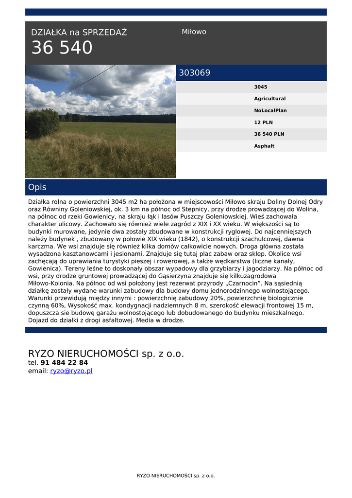 DZIAŁKA na SPRZEDAŻ Miłowo 36 540 303069 3045 Agricultural NoLocalPlan 12 PLN 36 540 PLN Asphalt Opis Działka rolna o powierzchni 3045 m2 ha położona w miejscowości Miłowo skraju Doliny Dolnej Odry oraz Równiny Goleniowskiej, ok. 3 km na północ od Stepnicy, przy drodze prowadzącej do Wolina, na północ od rzeki Gowienicy, na skraju łąk i lasów Puszczy Goleniowskiej. Wieś zachowała charakter ulicowy. Zachowało się również wiele zagród z XIX i XX wieku. W większości są to budynki murowane, jedynie dwa zostały zbudowane w konstrukcji ryglowej. Do najcenniejszych należy budynek , zbudowany w połowie XIX wieku (1842), o konstrukcji szachulcowej, dawna karczma. We wsi znajduje się również kilka domów całkowicie nowych. Droga główna została wysadzona kasztanowcami i jesionami. Znajduje się tutaj plac zabaw oraz sklep. Okolice wsi zachęcają do uprawiania turystyki pieszej i rowerowej, a także wędkarstwa (liczne kanały, Gowienica). Tereny leśne to doskonały obszar wypadowy dla grzybiarzy i jagodziarzy. Na północ od wsi, przy drodze gruntowej prowadzącej do Gąsierzyna znajduje się kilkuzagrodowa Miłowo-Kolonia. Na północ od wsi położony jest rezerwat przyrody „Czarnocin”. Na sąsiednią działkę zostały wydane warunki zabudowy dla budowy domu jednorodzinnego wolnostojącego. Warunki przewidują między innymi : powierzchnię zabudowy 20%, powierzchnię biologicznie czynną 60%, Wysokość max. kondygnacji nadziemnych 8 m, szerokość elewacji frontowej 15 m, dopuszcza sie budowę garażu wolnostojącego lub dobudowanego do budynku mieszkalnego. Dojazd do działki z drogi asfaltowej. Media w drodze. RYZO NIERUCHOMOŚCI sp. z o.o. tel. 91 484 22 84 email: [email protected] RYZO NIERUCHOMOŚCI sp. z o.o. Powered by TCPDF (www.tcpdf.org)