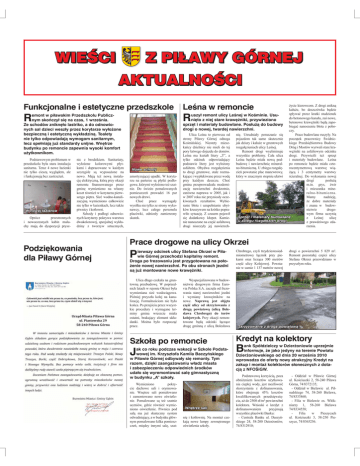 WIEŚCI Z PIŁAWY GÓRNEJ AKTUALNOŚCI Funkcjonalne i estetyczne przedszkole R emont w piławskim Przedszkolu Publicznym skończył się na czas, 1 września. Ze schodów zniknęło lastriko, a do odnowionych sal dzieci weszły przez korytarze wyłożone bezpieczną i estetyczną wykładziną. Toalety nie tylko odpowiadają wymogom sanitarnym, lecz spełniają już standardy unijne. Wnętrze budynku po remoncie zapewnia wysoki komfort użytkownikom. Podstawowym problemem w przedszkolu była stara instalacja sanitarna. Teraz 4 nowe łazienki nie tylko cieszą wyglądem, ale i funkcjonują bez zastrzeżeń. W nowej łazience Oprócz przestronnych i nowoczesnych kabin maluchy mają do dyspozycji prysz- nic z brodzikiem. Sanitariaty, wyłożone kolorowymi płytkami i dopracowane w każdym szczególe są wyposażone na nowo. Mają też nową instalację elektryczną, którą przy okazji remontu finansowanego przez gminę wymieniono na własny koszt również w korytarzu pierwszego piętra. Sieć wodno-kanalizacyjną wymieniono całkowicie nie tylko w łazienkach, lecz także piwnicy i kotłowni. Schody i podłogi odnowionych korytarzy pokrywa warstwa dwukolorowej, specjalnej wykładziny z tworzyw sztucznych, Podziękowania dla Piławy Górnej Nowe schody amortyzującej upadki. W korytarzu na parterze są płytki podłogowe, którymi wyłożono też szatnie. Do świeżo pomalowanych pomieszczeń prowadzi 16 par nowych drzwi. Choć prace wymagały wysiłku nie tylko ze strony wykonawcy, lecz całego personelu placówki, odniosły zamierzony skutek. Leśna w remoncie życie kierowcom. Z drogi znikną kałuże, bo deszczówka będzie spływać przez kratki studzienek uszył remont ulicy Leśnej w Kośminie. Usudo betonowego kanału, zaś nowe, nięto z niej stare krawężniki, przywieziono betonowe krawężniki będą zaposprzęt i materiały budowlane. Posłużą do budowy biegać nanoszeniu błota z pobodrogi o nowej, twardej nawierzchni. czy. nię. Utrudniały poruszanie się Prace budowlane ruszyły. Na Ulica Leśna to pierwsza od pojazdom tak samo skutecznie początek pracownicy Świdnicstrony Piławy Górnej odnoga jak dziury i kałuże w gruntowych kiego Przedsiębiorstwa Budowy Kośmińskiej. Niestety mieszrozgałęzieniach ulicy Leśnej. Dróg i Mostów wyrwali stare krakańcy dzielnicy nie mieli do tej Remont drogi wyeliminuje wężniki na asfaltowym odcinku pory łatwego dojazdu do domów. wszystkie problemy. Cała ulica drogi. Przywieźli też sprzęt Leśna ma kształt litery „T”, a i materiały budowlane. Leśna tylko odcinek odpowiadający Leśna będzie miała nową podpo remoncie będzie miała cztepodstawie litery jest wyłożony budowę i nawierzchnię mineralrocentymetrową warstwę wiąasfaltem. Obydwa rozgałęzienia no-bitumiczną. U zbiegu rozgałężącą i 3 centymetry warstwy to drogi gruntowe, stale rozmazień powstanie plac manewrowy, kające i wypłukiwane przez wodę który w znacznym stopniu ułatwi ścieralnej. Do wykonania nowej przy każdym deszczu. Choć drogi posłużą gmina przeprowadzała modernim.in. grys, żwir zację nawierzchni dwukrotnie, i mieszanka minezarówno naprawa w 2005, jak i ralno-bitumiczna. w 2007 roku nie przyniosły oczeMamy nadzieję, kiwanych rezultatów. Wybieże dobre materiały ranie błota i uzupełnianie ubyti znana w budowków kruszywem na krótko popranictwie drogowiło sytuację. Z czasem pojawił wym firma uczynią Sprzęt i materiały budowlane się dodatkowy kłopot. Kamiez Leśnej ulicę u zbiegu rozgałęzień drogi nie nanoszone na część asfaltową z prawdziwego zdadrogi niszczyły jej nawierzchrzenia. R Prace drogowe na ulicy Okrzei P ierwszy odcinek ulicy Stefana Okrzei w Piławie Górnej przechodzi kapitalny remont. Droga po frezowaniu jest przygotowana na położenie nowej nawierzchni. Po obu stronach jezdni są już montowane nowe krawężniki. Ulica długo czekała na gruntowną przebudowę. W poprzednich latach w rejonie Okrzei była wymieniana sieć wodociągowa. Później przyszła kolej na kanalizację. Formalnościom nie było końca. Po przejściu przez wszystkie procedury i wymagane terminy gmina wreszcie miała ostatni, brakujący element układanki. Można było rozpocząć prace. Wyspecjalizowana w budownictwie drogowym firma Eurovia Polska S.A. zaczęła od frezowania starej nawierzchni jezdni i wymiany krawężników na nowe. Naprawą jest objęta część ulicy od skrzyżowania z drogą powiatową (ulicą Bolesława Chrobrego) do torów kolejowych. Przy okazji remontowane będą odcinki łączące drogę gminną z ulicą Bolesława Szkoła po remoncie J ak co roku podczas wakacji w Szkole Podstawowej im. Krzysztofa Kamila Baczyńskiego w Piławie Górnej odbywały się remonty. Tym razem, dzięki zaangażowaniu władz miasta i zabezpieczeniu odpowiednich środków udało się wyremontować salę gimnastyczną w budynku „A” szkoły. Wymieniono pokrycie dachowe sali i orynnowanie. Wnętrze sali pomalowano i zamontowano nowe oświetlenie. Pomalowane są też szatnie uczniów, gdzie również wymieniono oświetlenie. Piwnica pod salą ma już skuteczny system odwadniający, a w budynku głównym pomalowano kilka pomieszczeń, między innymi salę, szat- Wnętrze sali nię i kotłownię. Na montaż czekają nowe lampy zewnętrznego oświetlenia szkoły. Chrobrego, czyli trzydziestosiedmiometrowy łącznik przy piekarni oraz licząca 300 metrów część ulicy Kolejowej. Powstanie w sumie 1 137 metrów nowej drogi o powierzchni 5 829 m². Remont pozostałej części ulicy Stefana Okrzei przewidziano w przyszłym roku. Skrzyżowanie z drogą powiatową Kredyt na kolektory B ank Spółdzielczy w Dzierżoniowie uprzejmie informuje, że jako jedyny na terenie Powiatu Dzierżoniowskiego od dnia 20 września 2010 wprowadza do oferty nowy atrakcyjny Kredyt na zakup i montaż kolektorów słonecznych z dotacją z NFOŚiGW. Podstawową korzyścią, poza obniżeniem kosztów użytkowania ciepłej wody, jest m