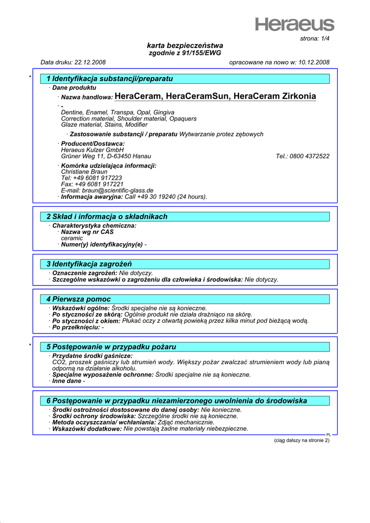 DR strona: 1/4 karta bezpieczeństwa zgodnie z 91/155/EWG Data druku: 22.12.2008 * opracowane na nowo w: 10.12.2008 1 Identyfikacja substancji/preparatu · Dane produktu · Nazwa handlowa: HeraCeram, HeraCeramSun, ·Dentine, Enamel, Transpa, Opal, Gingiva Correction material, Shoulder material, Opaquers Glaze material, Stains, Modifier HeraCeram Zirkonia · Zastosowanie substancji / preparatu Wytwarzanie protez zębowych · Producent/Dostawca: Heraeus Kulzer GmbH Grüner Weg 11, D-63450 Hanau Tel.: 0800 4372522 · Komórka udzielająca informacji: Christiane Braun Tel: +49 6081 917223 Fax: +49 6081 917221 E-mail: [email protected] · Informacja awaryjna: Call +49 30 19240 (24 hours). 2 Skład i informacja o składnikach · Charakterystyka chemiczna: · Nazwa wg nr CAS ceramic · Numer(y) identyfikacyjny(e) - 3 Identyfikacja zagrożeń · Oznaczenie zagrożeń: Nie dotyczy. · Szczególne wskazówki o zagrożeniu dla człowieka i środowiska: Nie dotyczy. 4 Pierwsza pomoc · Wskazówki ogólne: Środki specjalne nie są konieczne. · Po styczności ze skórą: Ogólnie produkt nie działa drażniąco na skórę. · Po styczności z okiem: Płukać oczy z otwartą powieką przez kilka minut pod bieżącą wodą. · Po przełknięciu: * 5 Postępowanie w przypadku pożaru · Przydatne środki gaśnicze: CO2, proszek gaśniczy lub strumień wody. Większy pożar zwalczać strumieniem wody lub pianą odporną na działanie alkoholu. · Specjalne wyposażenie ochronne: Środki specjalne nie są konieczne. · Inne dane - 6 Postępowanie w przypadku niezamierzonego uwolnienia do środowiska · Środki ostrożności dostosowane do danej osoby: Nie konieczne. · Środki ochrony środowiska: Szczególne środki nie są konieczne. · Metoda oczyszczania/ wchłaniania: Zdjąć mechanicznie. · Wskazówki dodatkowe: Nie powstają żadne materiały niebezpieczne. PL (ciąg dalszy na stronie 2) DR strona: 2/4 karta bezpieczeństwa zgodnie z 91/155/EWG Data druku: 22.12.2008 Nazwa handlowa: HeraCeram, opracowane na nowo w: 10.12.2008 HeraCeramSun, HeraCeram Zirkonia (ciąg dalszy od strony 1) 7 Postępowanie z substancją / preparatem* i jej / jego* magazynowanie · Sposób obchodzenia się: · Wskazówki dla bezpiecznego użytkowania: Unikać zapylania · Wskazówki dla ochrony przeciwpożarowej i przeciwwybuchowej: Nie są potrzebne szczególne zabiegi. · Składowanie: · Wymagania w stosunku do pomieszczeń składowych i zbiorników: Brak szczególnych wymagań. · Wskazówki odnośnie wspólnego składowania: Nie konieczne. · Dalsze wskazówki odnośnie warunków składowania: Brak. 8 Kontrola narażenia i środki ochrony indywidualnej · Dodatkowe wskazówki dla wykonania urządzeń technicznych: Brak dalszych danych, patrz punkt 7. · Składniki wraz z kontrolowanymi wartościami granicznymi zależnymi od miejsca pracy: Produkt nie zawiera znaczących ilości materiałów, których wartości graniczne musiałyby być kontrolowane pod kątem warunków miejsca pracy. · Wskazówki dodatkowe: Podstawą były aktualnie obowiązujące wykazy. · Osobiste wyposażenie ochronne: · Ogólne środki ochrony i higieny: Należy przestrzegać zwyczajne środki ostrożności przy obchodzeniu się z chemikaliami. · Ochrona dróg oddechowych: Filtr P1 · Ochrona rąk: Nie konieczne. · Materiał, z którego wykonane są rękawice Wybór odpowiednich rękawic nie zależy tylko od materiału, lecz także od innych cech jakościowych i zmienia się od producenta do producenta. · Czas penetracji dla materiału, z którego wykonane są rękawice Od producenta rękawic należy uzyskać informację na temat dokładnego czasu przebicia i go przestrzegać. · Do długotrwałego kontaktu w miejscach bez zwiększonego zagrożenia uszkodzeniem (np. laboratorium) nadają się rękawice z następującego materiału: Kauczuk naturalny (lateks) · Ochrona oczu: Stosowanie nie jest konieczne · Ochrona ciała: Odzież ochronna lekka 9 Właściwości fizykochemiczne · Ogólne dane · Forma: · Kolor: · Zapach: Proszek Zgodnie z nazwą produktu Bez zapachu · Zmiana stanu · Punkt topnienia/ Zakres topnienia: 900°C · Punkt wrzenia/ Zakres wrzenia: Nie jest określony. · Punkt zapłonu: Nie nadający się do zastosowania. · Niebezpieczeństwo wybuchu: Produkt nie jest grozi wybuchem. · Gęstość w 20°C: 2,5 g/cm3 · Gęstość wstrząsowa w 20°C: 830 kg/m3 (ciąg dalszy na stronie 3) PL DR strona: 3/4 karta bezpieczeństwa zgodnie z 91/155/EWG Data druku: 22.12.2008 Nazwa handlowa: HeraCeram, opracowane na nowo w: 10.12.2008 HeraCeramSun, HeraCeram Zirkonia (ciąg dalszy od strony 2) · Rozpuszczalność w/ mieszalność z · Woda: Nierozpuszczalny. · Zawartość ciał stałych: 100,0 % * 10 Stabilność i reaktywność · Rozkład termiczny/ warunki których należy unikać: Brak rozkładu przy składowaniu i obchodzeniu się zgodnie z przeznaczeniem. · Reakcje niebezpieczne Reakcje niebezpieczne nie są znane. · Niebezpieczne produkty rozkładu: Niebezpieczne produkty rozkładu nie są znane. · Dalsze dane: - 11 Informacje toksykologiczne · Ostra toksyczność: · Pierwotne działanie drażniące: Działanie Gatunek Metoda: · na skórze: Brak działania drażniącego. · w oku: Brak działania drażniącego. · Uczulanie: Žadne działanie uczulające nie jest znane. · Dodatkowe wskazówki toksykologiczne: Zgodnie z naszymi doświadczeniami i posiadanymi przez nas informacjami przy prawidłowym i zgodnym z przeznaczeniem użytkowaniu produktu nie powoduje on żadnych skutków szkodliwych dla zdrowia. Materiał nie musi być oznakowany zgodnie z wykazami Wspólnoty Europejskiej ostatniej wersji. 13 Postępowanie z odpadami · Produkt: · Zalecenie: Mniejsze ilości mogą byc deponowane razem z odpadkami domowymi. · Opakowania nieoczyszczone: · Zalecenie: Opakowanie może zostać po oczyszczeniu lub poddaniu obróbce materiałowej użyte ponownie * 14 Informacje o transporcie · Transport lądowy ADR/RID i GGV