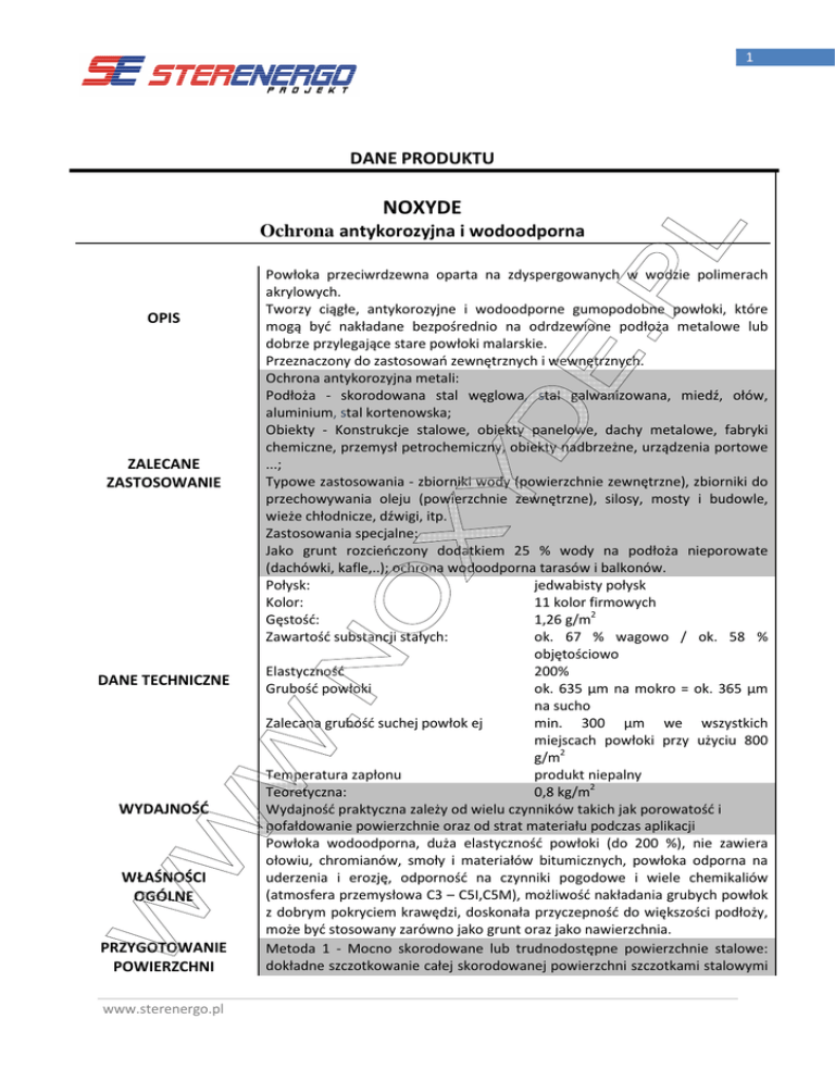 1 DANE PRODUKTU NOXYDE Ochrona antykorozyjna i wodoodporna OPIS ZALECANE ZASTOSOWANIE DANE TECHNICZNE WYDAJNOŚĆ WŁAŚNOŚCI OGÓLNE PRZYGOTOWANIE POWIERZCHNI www.sterenergo.pl Powłoka przeciwrdzewna oparta na zdyspergowanych w wodzie polimerach akrylowych. Tworzy ciągłe, antykorozyjne i wodoodporne gumopodobne powłoki, które mogą być nakładane bezpośrednio na odrdzewione podłoża metalowe lub dobrze przylegające stare powłoki malarskie. Przeznaczony do zastosowań zewnętrznych i wewnętrznych. Ochrona antykorozyjna metali: Podłoża - skorodowana stal węglowa, stal galwanizowana, miedź, ołów, aluminium, stal kortenowska; Obiekty - Konstrukcje stalowe, obiekty panelowe, dachy metalowe, fabryki chemiczne, przemysł petrochemiczny, obiekty nadbrzeżne, urządzenia portowe ...; Typowe zastosowania - zbiorniki wody (powierzchnie zewnętrzne), zbiorniki do przechowywania oleju (powierzchnie zewnętrzne), silosy, mosty i budowle, wieże chłodnicze, dźwigi, itp. Zastosowania specjalne: Jako grunt rozcieńczony dodatkiem 25 % wody na podłoża nieporowate (dachówki, kafle,..); ochrona wodoodporna tarasów i balkonów. Połysk: jedwabisty połysk Kolor: 11 kolor firmowych Gęstość: 1,26 g/m2 Zawartość substancji stałych: ok. 67 % wagowo / ok. 58 % objętościowo Elastyczność 200% Grubość powłoki ok. 635 µm na mokro = ok. 365 µm na sucho Zalecana grubość suchej powłok ej min. 300 µm we wszystkich miejscach powłoki przy użyciu 800 g/m2 Temperatura zapłonu produkt niepalny Teoretyczna: 0,8 kg/m2 Wydajność praktyczna zależy od wielu czynników takich jak porowatość i pofałdowanie powierzchnie oraz od strat materiału podczas aplikacji Powłoka wodoodporna, duża elastyczność powłoki (do 200 %), nie zawiera ołowiu, chromianów, smoły i materiałów bitumicznych, powłoka odporna na uderzenia i erozję, odporność na czynniki pogodowe i wiele chemikaliów (atmosfera przemysłowa C3 – C5I,C5M), możliwość nakładania grubych powłok z dobrym pokryciem krawędzi, doskonała przyczepność do większości podłoży, może być stosowany zarówno jako grunt oraz jako nawierzchnia. Metoda 1 - Mocno skorodowane lub trudnodostępne powierzchnie stalowe: dokładne szczotkowanie całej skorodowanej powierzchni szczotkami stalowymi 2 APLIKACJA NOXYDE WARUNKI APLIKACJI WARUNKI BEZPIECZEŃSTWA WARUNKI PRZECHOWYWANIA UWAGI OGÓLNE do stopnia St 2. Cała powierzchnia powinna być umyta wodą pod ciśnieniem minimum 100 barów z użyciem wirującej dyszki w układzie zamkniętym do stopnia „resztkowej korozji”. NOXYDE nakładać jak najszybciej po wyschnięciu podłoża. Metoda 2 - Trudnodostępne powierzchnie stalowe: dokładne szczotkowanie całej skorodowanej powierzchni szczotkami stalowymi do stopnia St 2. Mokre piaskowanie całej pozostałej powierzchni do stopnia Sa 2. Metoda 3 - Podłoże pokryte dobrze przylegającą powłoką malarską z niewielką korozją: Dokładne szczotkowanie całej skorodowanej powierzchni szczotkami stalowymi do stopnia St 2, po czym mycie istniejącej powłoki wodą pod wysokim ciśnieniem. Pierwsza warstwa NOXYDE w ilości około 400 g/m2, po 24-godzinnym schnięciu nałożenie drugiej warstwy NOXYDE w kontrastowym kolorze w ilości około 400 g/m2. Po wyschnięciu grubość suchej powłoki powinna wynosić minimum 300 µm we wszystkich miejscach. Wszystkie prace muszą być wykonywane przy suchej pogodzie i na suchym podłożu zgodnie z naszymi danymi technicznymi produktu. Należy zachować czas schnięcia między 2 warstwami na poziomie 24 godzin lub inny określony przez doradcę technicznego. Minimalna temperatura otaczającego powietrza i podłoża: + 8 °C. Maksymalna temperatura podłoża: + 55 °C. Wilgotność powietrza maks. 85 %. Otaczający obszar należy zabezpieczyć przed rozpyleniem cząstkami farby. Doszczelnić wszelkie rurki i przewody w czasie aplikacji. Chronić roślinność, zwierzęta i uprawy przed zabrudzeniem ich przez farby. Używać wymaganych w czasie pracy z farbami masek przeciwpyłowych. Zapoznać się z informacjami na pojemniku i na ulotce. Można przechowywać 24 miesiące w oryginalnych pojemnikach w chłodnych, suchych i niemrożonych miejscach Pełne utwardzenie/polimeryzacja NOXYDE trwa 7-14 dni w zależności od temperatury i pogody. W razie potrzeby nałożenia warstwy farby lub emalii nawierzchniowej, należy ją aplikować po minimum 1 pełnym dniu wysychania ostatniej powłoki NOXYDE. Informacje tu zawarte przekazywane są w dobrej wierze. Ponieważ warunki aplikacji są poza naszą kontrolą, SterEnergo Projekt Sp. z o.o. nie może ponosić jakiejkolwiek odpowiedzialności lub obciążeń finansowych, które mogą wynikać z niewłaściwego zastosowania tych produktów. W każdym przypadku należy przestrzegać przepisów ustawowych i ewentualnych praw osób trzecich. W celu zapewnienia najskuteczniejszego wykorzystania naszych produktów zawsze gotowi jesteśmy pomagać naszym klientom w rozwiązaniu szczegółowych problemów związanych z ich stosowaniem. Firma zastrzega sobie prawo modyfikowania danych bez uprzedzenia. www.sterenergo.pl 3 NOXYDE Ochrona antykorozyjna i wodoodporna Wyniki testów Komora wilgotnościowa (DIN 50017) Brak rdzy, brak rozpływającej się rdzy – 40 dni Test Kesternicha (ISO-6989-85) Brak zmian korozyjnych lub degradacji powłoki na próbkach porysowanych i nie porysowanych – 56 dni Komora solna (ISO-7253-84) Brak zmian koloru lub wyglądu po ekspozycji na próbkach porysowanych i nie porysowanych – 56 dni Przyczepność (ISO-2409-72) 3,0 – 6,0 Mpa, czas schnięcia - co najmniej 10 dni Test odporności na promieniowanie słoneczne (ISO-4892-1981/E) ograniczone kredowanie i zmatowienie powłoki, brak korozji podpowłokowej na próbkach porysowanych – 1000 godzin Absorpcja wody (PN-76/C-81521) 5-6 % wagowo, wartość osiąga poziom bliski stałego po 12-16 dniach od zanurzenia; czas wysychania po 56 dniach zanurzenia: 32 godz. Odpornoś