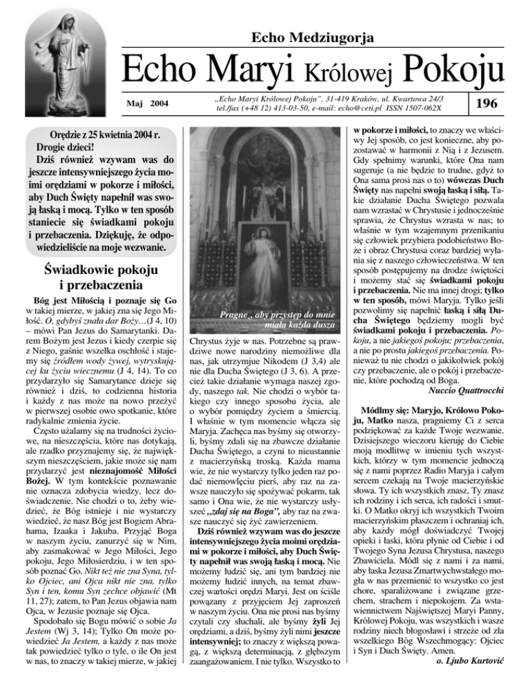 Echo Medziugorja Echo Maryi Królowej Pokoju Maj 2004 „Echo Maryi Królowej Pokoju”, 31-419 Kraków, ul. Kwartowa 24/3 tel./fax (+48 12) 413-03-50, e-mail: [email protected] ISSN 1507-062X Or´dzie z 25 kwietnia 2004 r. Drogie dzieci! DziÊ równie˚ wzywam was do jeszcze intensywniejszego ˚ycia moimi or´dziami w pokorze i mi∏oÊci, aby Duch Âwi´ty nape∏ni∏ was swojà ∏askà i mocà. Tylko w ten sposób staniecie si´ Êwiadkami pokoju i przebaczenia. Dzi´kuj´, ˚e odpowiedzieliÊcie na moje wezwanie. Âwiadkowie pokoju i przebaczenia Bóg jest Mi∏oÊcià i poznaje si´ Go w takiej mierze, w jakiej zna si´ Jego Mi∏oÊç. O, gdybyÊ zna∏a dar Bo˚y…(J 4, 10) – mówi Pan Jezus do Samarytanki. Darem Bo˚ym jest Jezus i kiedy czerpie si´ z Niego, gaÊnie wszelka osch∏oÊç i stajemy si´ ˝ród∏em wody ˚ywej, wytryskujàcej ku ˚yciu wiecznemu (J 4, 14). To co przydarzy∏o si´ Samarytance dzieje si´ równie˚ i dziÊ, to codzienna historia i ka˚dy z nas mo˚e na nowo prze˚yç w pierwszej osobie owo spotkanie, które radykalnie zmienia ˚ycie. Cz´sto u˚alamy si´ na trudnoÊci ˚yciowe, na nieszcz´Êcia, które nas dotykajà, ale rzadko przyznajemy si´, ˚e najwi´kszym nieszcz´Êciem, jakie mo˚e si´ nam przydarzyç jest nieznajomoÊç Mi∏oÊci Bo˚ej. W tym kontekÊcie poznawanie nie oznacza zdobycia wiedzy, lecz doÊwiadczenie. Nie chodzi o to, ˚eby wiedzieç, ˚e Bóg istnieje i nie wystarczy wiedzieç, ˚e nasz Bóg jest Bogiem Abrahama, Izaaka i Jakuba. Przyjàç Boga w naszym ˚yciu, zanurzyç si´ w Nim, aby zasmakowaç w Jego Mi∏oÊci, Jego pokoju, Jego Mi∏osierdziu, i w ten sposób poznaç Go. Nikt te˚ nie zna Syna, tylko Ojciec, ani Ojca nikt nie zna, tylko Syn i ten, komu Syn zechce objawiç (Mt 11, 27); zatem, to Pan Jezus objawia nam Ojca, w Jezusie poznaje si´ Ojca. Spodoba∏o si´ Bogu mówiç o sobie Ja Jestem (Wj 3, 14); Tylko On mo˚e powiedzieç Ja Jestem, a ka˚dy z nas mo˚e tak powiedzieç tylko o tyle, o ile On jest w nas, to znaczy w takiej mierze, w jakiej Pragne˛, aby przyst´p do mnie mia∏a ka˚da dusza Chrystus ˚yje w nas. Potrzebne sà prawdziwe nowe narodziny niemo˚liwe dla nas, jak utrzymjue Nikodem (J 3,4) ale nie dla Ducha Âwi´tego (J 3, 6). A przecie˚ takie dzia∏anie wymaga naszej zgody, naszego tak. Nie chodzi o wybór takiego czy innego sposobu ˚ycia, ale o wybór pomi´dzy ˚yciem a Êmiercià. I w∏aÊnie w tym momencie w∏àcza si´ Maryja. Zach´ca nas byÊmy si´ otworzyli, byÊmy zdali si´ na zbawcze dzia∏anie Ducha Âwi´tego, a czyni to nieustannie z macierzyƒskà troskà. Ka˚da mama wie, ˚e nie wystarczy tylko jeden raz podaç niemowl´ciu pierÊ, aby raz na zawsze nauczy∏o si´ spo˚ywaç pokarm, tak samo i Ona wie, ˚e nie wystarczy us∏yszeç „zdaj si´ na Boga”, aby raz na zwasze nauczyç si´ ˚yç zawierzeniem. DziÊ równie˚ wzywam was do jeszcze intensywniejszego ˚ycia moimi or´dziami w pokorze i mi∏oÊci, aby Duch Âwi´ty nape∏ni∏ was swojà ∏askà i mocà. Nie mo˚emy ∏udziç si´, ani tym bardziej nie mo˚emy ∏udziç innych, na temat zbawczej wartoÊci or´dzi Maryi. Jest on ÊciÊle powàzany z przyj´ciem Jej zaproszeƒ w naszym ˚yciu. Ona nie prosi nas byÊmy czytali czy s∏uchali, ale byÊmy ˚yli Jej or´dziami, a dziÊ, byÊmy ˚yli nimi jeszcze intensywniej; to znaczy z wi´kszà powagà, z wi´kszà determinacjà, z g∏´bszym zaanga˚owaniem. I nie tylko. Wszystko to 196 w pokorze i mi∏oÊci, to znaczy we w∏aÊciwy Jej sposób, co jest konieczne, aby pozostawaç w harmonii z Nià i z Jezusem. Gdy spe∏nimy warunki, które Ona nam sugeruje (a nie b´dzie to trudne, gdy˚ to Ona sama prosi nas o to) wówczas Duch Âwi´ty nas nape∏ni swojà ∏askà i si∏à. Takie dzia∏anie Ducha Âwi´tego pozwala nam wzrastaç w Chrystusie i jednoczeÊnie sprawia, ˚e Chrystus wzrasta w nas; to w∏aÊnie w tym wzajemnym przenikaniu si´ cz∏owiek przybiera podobieƒstwo Bo˚e i obraz Chrystusa coraz bardziej wy∏ania si´ z naszego cz∏owieczeƒstwa. W ten sposób post´pujemy na drodze Êwi´toÊci i mo˚emy staç si´ Êwiadkami pokoju i przebaczenia. Nie ma innej drogi; tylko w ten sposób, mówi Maryja. Tylko jeÊli pozwolimy si´ nape∏niç ∏askà i si∏à Ducha Âwi´tego b´dziemy mogli byç Êwiadkami pokoju i przebaczenia. Pokoju, a nie jakiegoÊ pokoju; przebaczenia, a nie po prostu jakiegoÊ przebaczenia. Poniewa˚ tu nie chodzi o jakikolwiek pokój czy przebaczenie, ale o pokój i przebaczenie, które pochodzà od Boga. Nuccio Quattrocchi Módlmy si´: Maryjo, Królowo Pokoju, Matko nasza, pragniemy Ci z serca podzi´kowaç za ka˚de Twoje wezwanie. Dzisiejszego wieczoru kieruj´ do Ciebie mojà modlitw´ w imieniu tych wszystkich, którzy w tym momencie jednoczà si´ z nami poprzez Radio Maryja i ca∏ym sercem czekajà na Twoje macierzyƒskie s∏owa. Ty ich wszystkich znasz, Ty znasz ich rodziny i ich serca, ich radoÊci i smutki. O Matko okryj ich wszystkich Twoim macierzyƒskim p∏aszczem i ochraniaj ich, aby ka˚dy móg∏ doÊwiadczyç Twojej opieki i ∏aski, która p∏ynie od Ciebie i od Twojego Syna Jezusa Chrystusa, naszego Zbawiciela. Módl si´ z nami i za nami, aby ∏aska Jezusa Zmartwychwsta∏ego mog∏a w nas przemieniç to wszystko co jest chore, sparali˚owane i zwiàzane grzechem, strachem i niepokojem. Za wstawiennictwem NajÊwi´tszej Maryi Panny, Królowej Pokoju, was wszystkich i wasze rodziny niech b∏ogos∏awi i strze˚e od z∏a wszelkiego Bóg Wszechmogàcy: Ojciec i Syn i Duch Âwi´ty. Amen. o. Ljubo Kurtoviç ~2~ Z ˚ycia KoÊcio∏a Ca∏à Rodzin´ Ludzkà Bazylika Matki Bo˚ej Wi´kszej Przemówienie radiowe Ojca Âwi´tego cd Akt Dzi´kczynienia 4. Kiedy dzisiaj w godzinach porannych zgromadziliÊmy si´ w Bazylice Êw. Piotra na Watykanie, wyda∏a nam si´ ta wspania∏a Êwiàtynia ubogim Wieczernikiem jerozolimskim, do którego Chrystus przyszed∏ po swym Zmartwychwstan