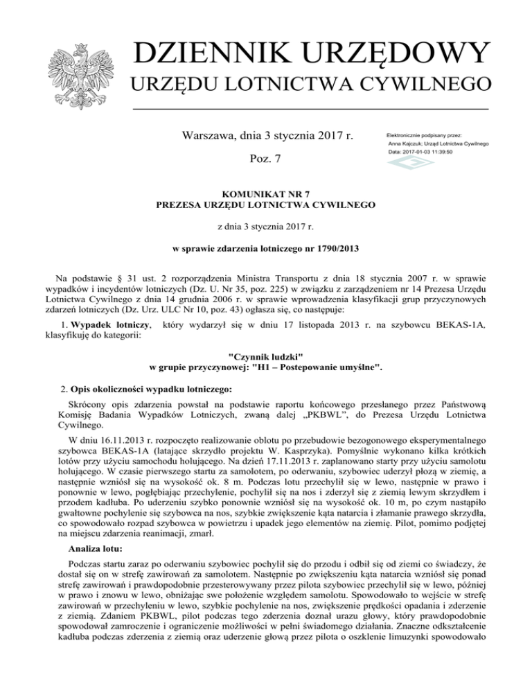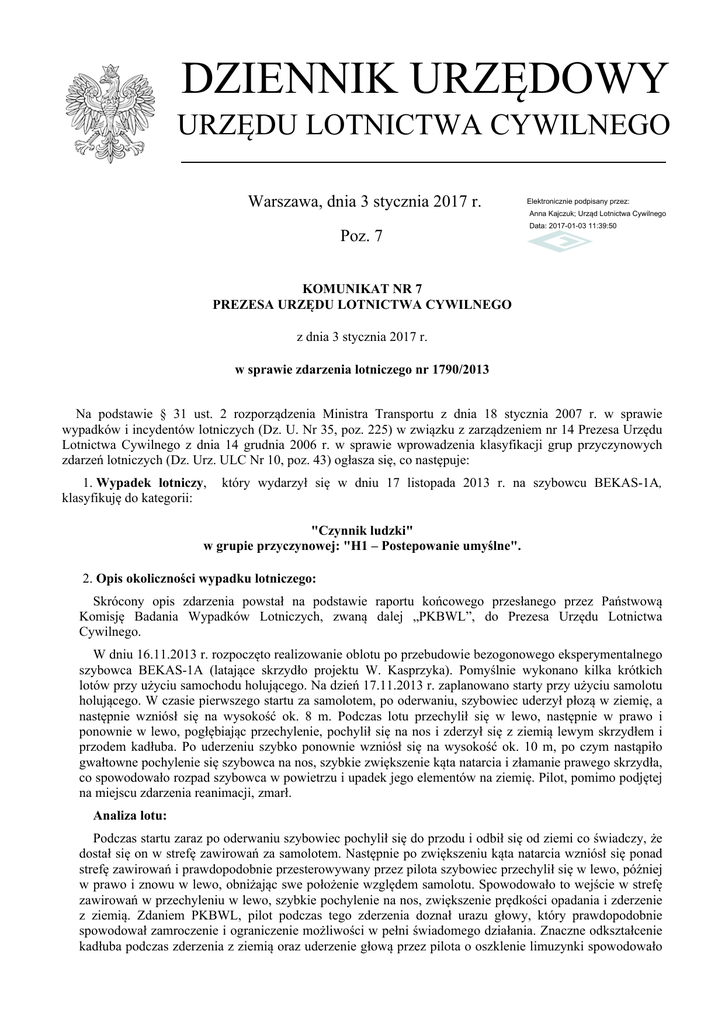 DZIENNIK URZĘDOWY URZĘDU LOTNICTWA CYWILNEGO Warszawa, dnia 3 stycznia 2017 r. Elektronicznie podpisany przez: Anna Kajczuk; Urząd Lotnictwa Cywilnego Poz. 7 Data: 2017-01-03 11:39:50 KOMUNIKAT NR 7 PREZESA URZĘDU LOTNICTWA CYWILNEGO z dnia 3 stycznia 2017 r. w sprawie zdarzenia lotniczego nr 1790/2013 Na podstawie § 31 ust. 2 rozporządzenia Ministra Transportu z dnia 18 stycznia 2007 r. w sprawie wypadków i incydentów lotniczych (Dz. U. Nr 35, poz. 225) w związku z zarządzeniem nr 14 Prezesa Urzędu Lotnictwa Cywilnego z dnia 14 grudnia 2006 r. w sprawie wprowadzenia klasyfikacji grup przyczynowych zdarzeń lotniczych (Dz. Urz. ULC Nr 10, poz. 43) ogłasza się, co następuje: 1. Wypadek lotniczy, klasyfikuję do kategorii: który wydarzył się w dniu 17 listopada 2013 r. na szybowcu BEKAS-1A, "Czynnik ludzki" w grupie przyczynowej: "H1 – Postepowanie umyślne". 2. Opis okoliczności wypadku lotniczego: Skrócony opis zdarzenia powstał na podstawie raportu końcowego przesłanego przez Państwową Komisję Badania Wypadków Lotniczych, zwaną dalej „PKBWL”, do Prezesa Urzędu Lotnictwa Cywilnego. W dniu 16.11.2013 r. rozpoczęto realizowanie oblotu po przebudowie bezogonowego eksperymentalnego szybowca BEKAS-1A (latające skrzydło projektu W. Kasprzyka). Pomyślnie wykonano kilka krótkich lotów przy użyciu samochodu holującego. Na dzień 17.11.2013 r. zaplanowano starty przy użyciu samolotu holującego. W czasie pierwszego startu za samolotem, po oderwaniu, szybowiec uderzył płozą w ziemię, a następnie wzniósł się na wysokość ok. 8 m. Podczas lotu przechylił się w lewo, następnie w prawo i ponownie w lewo, pogłębiając przechylenie, pochylił się na nos i zderzył się z ziemią lewym skrzydłem i przodem kadłuba. Po uderzeniu szybko ponownie wzniósł się na wysokość ok. 10 m, po czym nastąpiło gwałtowne pochylenie się szybowca na nos, szybkie zwiększenie kąta natarcia i złamanie prawego skrzydła, co spowodowało rozpad szybowca w powietrzu i upadek jego elementów na ziemię. Pilot, pomimo podjętej na miejscu zdarzenia reanimacji, zmarł. Analiza lotu: Podczas startu zaraz po oderwaniu szybowiec pochylił się do przodu i odbił się od ziemi co świadczy, że dostał się on w strefę zawirowań za samolotem. Następnie po zwiększeniu kąta natarcia wzniósł się ponad strefę zawirowań i prawdopodobnie przesterowywany przez pilota szybowiec przechylił się w lewo, później w prawo i znowu w lewo, obniżając swe położenie względem samolotu. Spowodowało to wejście w strefę zawirowań w przechyleniu w lewo, szybkie pochylenie na nos, zwiększenie prędkości opadania i zderzenie z ziemią. Zdaniem PKBWL, pilot podczas tego zderzenia doznał urazu głowy, który prawdopodobnie spowodował zamroczenie i ograniczenie możliwości w pełni świadomego działania. Znaczne odkształcenie kadłuba podczas zderzenia z ziemią oraz uderzenie głową przez pilota o oszklenie limuzynki spowodowało Dziennik Urzędowy Urzędu Lotnictwa Cywilnego –2– Poz. 7 jej otwarcie. Zamknięcie limuzynki w powietrzu nie było absolutnie możliwe i jedynym słusznym działaniem było wyczepienie linki holowniczej i lądownie na wprost. Od miejsca uderzenia w ziemię do końca roboczej części lotniska pozostało ok 750 m, co po wyczepieniu na wysokości ok. 2-3 m i otworzeniu hamulca aerodynamicznego prawdopodobnie umożliwiałoby to zatrzymanie się w granicach lotniska. Brak wyczepienia linki holowniczej przez pilota, zdaniem PKBWL, świadczy o niepełnej możliwości podejmowania prawidłowych decyzji po zderzeniu szybowca z ziemią. Wznoszący się samolot holujący znalazł się wysoko ponad szybowcem, co spowodowało, że znacznie zmieniło się położenie liny holowniczej względem szybowca. Siła w linie (bez udziału pilota) obróciła szybowiec wokół osi poprzecznej i zwiększyła kąt natarcia. Szybowiec wznosił się do momentu wlecenia w strefę zawirowań. Nastąpiło gwałtowne pochylenie się, wyjście ze strefy zawirowań i prawdopodobnie jednoczesne oddziaływanie siły w linie i odruchowa reakcja pilota (zapisana przez rejestrator) doprowadziła do bardzo szybkiego zwiększenia kąta natarcia i szybkiego przyrostu siły nośnej do wartości przewyższającej wytrzymałość dźwigara w prawym skrzydle. Obciążenie prawego skrzydła mogło dodatkowo wzrosnąć przy zwiększeniu współczynnika obciążenia, gdyż przy ugięciu skrzydła luźny trymer o znacznej powierzchni i środku masy daleko poza osią obrotu, na skutek działania przyspieszenia w dół i na skutek ruchu skrzydła w górę wychylił się w dół, co zwiększyło siłę na końcówce i zwiększyło moment zginający (dźwigar). Prawdopodobnie to przyczyniło się właśnie do złamania prawego skrzydła. Na podstawie dostępnych informacji PKBWL nie mogła jednoznacznie stwierdzić, czy pilot wiedział o tak nietypowym zachowaniu się szybowca na holu za samolotem, a także czy dyskutował o zachowaniu się szybowca z innymi osobami, w tym z pilotami doświadczalnymi. W przypadku nie posiadania przez pilota wiedzy o takim nietypowym zachowaniu się szybowca w locie na holu za samolotem, jego postępowanie wydaje się uzasadnione, gdyż z reguły w klasycznych szybowcach podczas wahań poprzecznych (tzw. rozbujania) na holu ustatecznienie następowało po wejściu w strugi zaśmigłowe i pilot mógł do tego dążyć. Otworzenie hamulców aerodynamicznych zamontowanych w skrzydłach w szybowcach w układzie klasycznym także powoduje ustatecznienie lotu na holu za samolotem. Zdaniem PKBWL pilot prawdopodobnie świadomie częściowo otworzył hamulce aerodynamiczne na krótko przed uderzeniem w ziemię. Przy założeniu, że pilot był zapoznany z nietypowym zachowaniem się szybowca na holu to wejście w strefę zawirowań za samolotem holującym mogło nastąpić z powodu skupienia uwagi na opanowaniu poprzecznych wahań szybowca oraz potrzeby obserwow