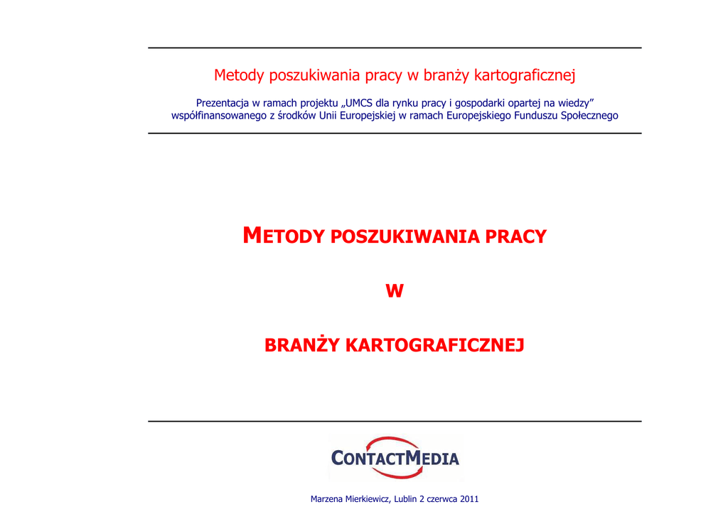 Metody poszukiwania pracy w branŜy kartograficznej Prezentacja w ramach projektu „UMCS dla rynku pracy i gospodarki opartej na wiedzy” współfinansowanego z środków Unii Europejskiej w ramach Europejskiego Funduszu Społecznego METODY POSZUKIWANIA PRACY W BRANśY KARTOGRAFICZNEJ Marzena Mierkiewicz, Lublin 2 czerwca 2011 Metody poszukiwania pracy w branŜy kartograficznej Prezentacja w ramach projektu „UMCS dla rynku pracy i gospodarki opartej na wiedzy” współfinansowanego z środków Unii Europejskiej w ramach Europejskiego Funduszu Społecznego Istnieje wiele sposobów poszukiwania pracy – kaŜdy jest odpowiedni! Jakie metody poszukiwania pracy uznać naleŜy za najbardziej skuteczne? Nie ma na to pytanie jednej i oczywistej odpowiedzi. Wiele zaleŜy od predyspozycji osobnika, lokalnego rynku pracy, specyfiki pracy i upodobań pracodawców. Pracy moŜna poszukać na rynku jawnym, czyli tym, do którego mają dostęp wszyscy oraz na rynku niejawnym, czyli na takim, o którym wiedzą tylko nieliczni… Marzena Mierkiewicz, Lublin 2 czerwca 2011 Metody poszukiwania pracy w branŜy kartograficznej Prezentacja w ramach projektu „UMCS dla rynku pracy i gospodarki opartej na wiedzy” współfinansowanego z środków Unii Europejskiej w ramach Europejskiego Funduszu Społecznego Rynek jawny ogłoszenia prasowe, ogłoszenia internetowe targi pracy urzędy pracy agencje pracy itd. skuteczność poszukania pracy ww. metodami zaledwie 20% Marzena Mierkiewicz, Lublin 2 czerwca 2011 Metody poszukiwania pracy w branŜy kartograficznej Prezentacja w ramach projektu „UMCS dla rynku pracy i gospodarki opartej na wiedzy” współfinansowanego z środków Unii Europejskiej w ramach Europejskiego Funduszu Społecznego Ogłoszenia prasowe – gazety codzienne, czasopisma branŜowe, itp. zamieszczające oferty pracy Targi pracy - trwają przewaŜnie kilka dni, są organizowane przez urzędy pracy, szkoły wyŜsze, fundacje, stowarzyszenia, organizacje pracodawców; wystawcy prezentują na targach swoje firmy, zakres świadczonych usług, moŜliwości, plany rozwoju, wymagania wobec przyszłych pracowników; firmy pozyskują dzięki temu informacje, jakie jest zainteresowanie ich branŜą za strony rynku. Uczestnictwo w targach daje szansę nawiązania nowych kontaktów i bezpośredni kontakt z pracodawcami. Urzędy pracy – prowadzą rejestr oferowanych miejsc pracy na danym obszarze. Wskazane jest nawiązać kontakt z pośrednikiem pracy, przedstawić swoje oczekiwania i poprosić o informację, gdy pojawi się oferta pracy zgodna z naszymi preferencjami. Agencje pośrednictwa pracy – poszukują kandydatów na róŜne stanowiska i dlatego warto pozostawić swoje CV, poniewaŜ moŜe się tak zdarzyć, Ŝe pojawi się oferta zgodna z naszymi preferencjami i zostaniemy poproszeni na rozmowę kwalifikacyjną. Marzena Mierkiewicz, Lublin 2 czerwca 2011 Metody poszukiwania pracy w branŜy kartograficznej Prezentacja w ramach projektu „UMCS dla rynku pracy i gospodarki opartej na wiedzy” współfinansowanego z środków Unii Europejskiej w ramach Europejskiego Funduszu Społecznego Internet – coraz bardziej popularna forma poszukiwania pracowników przez pracodawców. NaleŜy bardzo szczegółowo przeglądać strony internetowe interesujących nas firm, jak równieŜ bardzo często przeglądać portale internetowe zamieszczające ogłoszenia o pracę. Lokalne organizacje społeczne - mogą się równieŜ okazać pomocne w poszukiwaniu pracy Oferty własne - mogą posiadać formę pisemną, telefoniczną, bądź bezpośrednią. Ogłoszenia własne o poszukiwaniu pracy moŜna zamieszczać np. w radiu lokalnym, gazetach ogłoszeniowych, czasopismach branŜowych lub Internecie. Kontakt bezpośredni – skuteczną metodą poszukiwania pracy moŜe okazać się nawiązanie bezpośredniego kontaktu z pracodawcą lub osobą odpowiedzialną za rekrutację w firmie. NaleŜy dowiedzieć się, jakie warunki trzeba spełniać aby ubiegać się o pracę i zgodnie z uzyskanymi wskazówkami napisać swój list motywacyjny wraz z CV. Marzena Mierkiewicz, Lublin 2 czerwca 2011 Metody poszukiwania pracy w branŜy kartograficznej Prezentacja w ramach projektu „UMCS dla rynku pracy i gospodarki opartej na wiedzy” współfinansowanego z środków Unii Europejskiej w ramach Europejskiego Funduszu Społecznego Rynek niejawny nasza rodzina przyjaciele znajomi znajomi znajomych itd. skuteczność poszukiwania pracy aŜ 80% Sieć kontaktów (networking) – rodzina, przyjaciele, znajomi mogą być bardzo cennym źródłem informacji o wolnych miejscach pracy. Dodatkowo ich poparcie moŜe bardzo skutecznie wpłynąć na pracodawcę w podjęciu decyzji o zatrudnieniu Marzena Mierkiewicz, Lublin 2 czerwca 2011 Metody poszukiwania pracy w branŜy kartograficznej Prezentacja w ramach projektu „UMCS dla rynku pracy i gospodarki opartej na wiedzy” współfinansowanego z środków Unii Europejskiej w ramach Europejskiego Funduszu Społecznego Najlepsze efekty w poszukiwaniu pracy daje stosowanie wszystkich wyŜej omówionych metod. Szukanie pracy wymaga czasu i naleŜy szukanie pracy traktować jako bardzo odpowiedzialną, trudną i Ŝmudną pracę. To znaczy, Ŝe powinniśmy na szukanie poświęcać tyle samo godzin dziennie ile byśmy musieli spędzić w naszej wymarzonej pracy. Podstawowymi zasadami podczas naszego całego Ŝycia zawodowego jest i będzie cierpliwość, wytrwałość, dąŜenie do wyznaczonego celu. Dziękuję za uwagę. Marzena Mierkiewicz, Lublin 2 czerwca 2011