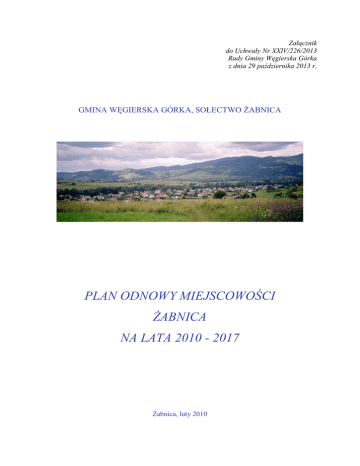Załącznik do Uchwały Nr XXIV/226/2013 Rady Gminy Węgierska Górka z dnia 29 października 2013 r. GMINA WĘGIERSKA GÓRKA, SOŁECTWO ŻABNICA PLAN ODNOWY MIEJSCOWOŚCI ŻABNICA NA LATA 2010 - 2017 Żabnica, luty 2010 PLAN ODNOWY MIEJSCOWOŚCI ŻABNICA NA LATA 2010 - 2017 SPIS TREŚCI: 1. WSTĘP _______________________________________________________________ 4 2. CHARAKTERYSTYKA MIEJSCOWOŚCI ŻABNICA _________________________ 6 2.1. Położenie __________________________________________________________ 6 2.2. Struktura przestrzenna miejscowości Żabnica __________________________ 7 2.3. Dominanta przestrzenna_____________________________________________ 8 2.4. Historia miejscowości _______________________________________________ 9 2.5. Ludność _________________________________________________________ 10 2.6. Zabytki i architektura ______________________________________________ 11 2.7. Gospodarka ______________________________________________________ 13 2.8. Rolnictwo ________________________________________________________ 14 2.9. Środowisko przyrodnicze ___________________________________________ 15 2.10. Infrastruktura ____________________________________________________ 17 2.10.1. Zaopatrzenie w wodę ___________________________________________ 17 2.10.2. Sieć kanalizacyjna ______________________________________________ 17 2.10.3. Ogrzewanie ___________________________________________________ 17 2.10.4. Gaz _________________________________________________________ 17 2.10.5. Gospodarka odpadami ___________________________________________ 18 2.10.6. Komunikacja __________________________________________________ 18 2.11. Miejsca o szczególnym znaczeniu dla potrzeb mieszkańców. ______________ 18 2.11.1. Miejsca kultu religijnego, pamięci oraz związane z kulturą i tradycją. _____ 18 2.11.2. Miejsca szczególnie atrakcyjne turystyczno-rekreacyjnie oraz przyrodniczo. 19 2.11.3. Miejsca szczególnie o charakterze komunikacyjnym. __________________ 20 2.12. Oświata __________________________________________________________ 20 2.13. Turystyka ________________________________________________________ 22 2.14. Kultura __________________________________________________________ 23 3. 4. ANALIZA SWOT ______________________________________________________ 26 3.1. Czynniki wewnętrzne miejscowości Żabnica ___________________________ 26 3.2. Czynniki zewnętrzne miejscowości Żabnica ____________________________ 27 PLANOWANE ZADANIA INWESTYCYJNE _______________________________ 28 4.1. Opis, uzasadnienie i rezultaty planowanych zadań inwestycyjnych _______ 29 4.2. Koszty i źródła finansowania realizacji poszczególnych zadań inwestycyjnych w Sołectwie Żabnica w latach 2010 - 2017. ___________________________________ 39 4.3. 5. Harmonogram realizacji zadań w Sołectwie Żabnica na lata 2010-2017. ____ 41 WDROŻENIE I MONITOROWANIE PLANU ______________________________ 43 2 Urząd Gminy Węgierska Górka 34-350 Węgierska Górka ul. Zielona 43 PLAN ODNOWY MIEJSCOWOŚCI ŻABNICA NA LATA 2010 - 2017 6. PODSUMOWANIE ____________________________________________________ 43 3 Urząd Gminy Węgierska Górka 34-350 Węgierska Górka ul. Zielona 43 PLAN ODNOWY MIEJSCOWOŚCI ŻABNICA NA LATA 2010 - 2017 1. WSTĘP Rozwój i odnowa obszarów wiejskich to jedno z kluczowych wyzwań, jakie stoją przed Polską w okresie integracji z Unią Europejską. Zasadniczym jej celem jest wzmocnienie działań służących zmniejszaniu istniejących dysproporcji i różnic w poziomie rozwoju obszarów wiejskich w stosunku do terenów miejskich. Plan Odnowy Miejscowości jest jednym z najważniejszych elementów odnowy wsi, jej rozwoju oraz poprawy warunków pracy i życia mieszkańców. Sporządzenie i uchwalenie takiego dokumentu stanowi niezbędny warunek przy aplikowaniu o środki finansowe w ramach „Programu Rozwoju Obszarów Wiejskich 2007-2013” działanie „Odnowa i rozwój wsi”, jak również stanowić będzie wytyczne dla władz Gminy Węgierska Górka przy opracowaniu kierunków rozwoju miejscowości Żabnica. Celem działania „Odnowa i rozwój wsi” jest poprawa jakości życia na obszarach wiejskich poprzez zaspokojenie potrzeb społecznych i kulturalnych mieszkańców wsi oraz promowanie obszarów wiejskich. Działanie umożliwi rozwój tożsamości społeczności wiejskiej, zachowanie dziedzictwa kulturowego i specyfiki obszarów wiejskich oraz wpłynie na wzrost ich atrakcyjności turystycznej i inwestycyjnej. W ramach działania pomocą finansową zostaną objęte projekty dotyczące: 1) budowy, przebudowy, remontu lub wyposażenia obiektów: a. pełniących funkcje publiczne, społeczno-kulturalne, rekreacyjne i sportowe, b. służących promocji obszarów wiejskich, w tym propagowaniu i zachowaniu dziedzictwa historycznego, tradycji, sztuki oraz kultury, 2) kształtowania obszaru przestrzeni publicznej, 3) budowy remontu lub przebudowy infrastruktury związanej z rozwojem funkcji turystycznych, sportowych lub społeczno-kulturalnych, 4) zakupu obiektów charakterystycznych dla tradycji budownictwa w danym regionie, w tym budynków będących zabytkami, z przeznaczeniem na cele publiczne, 5) odnawiania, eksponowania lub konserwacji lokalnych pomników historycznych, budynków będących zabytkami lub miejsc pamięci, 6) kultywowania tradycji społeczności lokalnej oraz tradycyjnych zawodów. Obszarem realizacji Planu Odnowy Miejscowości Żabnica jest obszar tej miejscowości. 4 Urząd Gminy Węgierska Górka 34-350 Węgierska Górka ul. Zielona 43 PLAN ODNOWY MIEJSCOWOŚCI ŻABNICA NA LATA 2010 - 2017 Zakres niniejszego opracowania obejmuje charakterystykę miejscowości, inwentaryzację zasobów służących odnowie miejscowości, analizę SWOT czyli mocne i słabe strony miejscowości, planowane kierunki rozwoju, zadania inwestycyjne wraz z szacunkowym kosztorysem i harmonogramem działań. Plan Odnowy Miejscowości Żabnica to dokument, który określa strategię działa