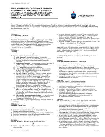 PKOBP/Regulamin_UFK/10-2014/A REGULAMIN UBEZPIECZENIOWYCH FUNDUSZY KAPITAŁOWYCH OFEROWANYCH W RAMACH UBEZPIECZEŃ NA ŻYCIE Z UBEZPIECZENIOWYM FUNDUSZEM KAPITAŁOWYM DLA KLIENTÓW PKO BP S.A. Stanowiący integralną część ogólnych warunków ubezpieczeń na życie, jeżeli są związane z ubezpieczeniowym funduszem kapitałowym (grupa 3 działu I – ubezpieczeń na życie, zgodnie z załącznikiem do Ustawy o Działalności Ubezpieczeniowej) zwanych dalej OWU oraz każdej umowy ubezpieczenia zawartej na ich podstawie, zatwierdzony przez PKO Życie Towarzystwo Ubezpieczeń S.A. (zwana dalej PKO Ubezpieczenia) dnia 1 października 2014 roku. ROZDZIAŁ 1 POSTANOWIENIA OGÓLNE 2. § 1. Regulamin Ubezpieczeniowych Funduszy Kapitałowych, zwany dalej Regulaminem, określa cel i zasady działania Ubezpieczeniowych Funduszy Kapitałowych oferowanych przez PKO Ubezpieczenia. Wykaz Ubezpieczeniowych Funduszy Kapitałowych dostępnych w ramach Umowy Ubezpieczenia ustalany jest przez PKO Ubezpieczenia i określony w Karcie Parametrów. 3. ROZDZIAŁ 2 DEFINICJE 1. 2. § 2. Terminy użyte w Regulaminie oznaczają: 1) Bank Powiernik - bank przechowujący aktywa UFK; 2) Dzień Wyceny - dzień, na który PKO Ubezpieczenia ustala Wartość Aktywów Netto Funduszu i wartość Jednostki Funduszu, 3) Instrumenty finansowy – instrumenty wskazane w art. 2 ust. 1 Ustawy z dnia 29 lipca 2005 o obrocie instrumentami finansowymi (Dz.U. z 2014 r. poz. 94 tj.); 4) UFK- Ubezpieczeniowy Fundusz Kapitałowy; 5) Ustawa o Działalności Ubezpieczeniowej - Ustawa z dnia 22 maja 2003 roku o działalności ubezpieczeniowej (tekst jednolity Dz.U. rok 2013, poz. 950); 6) Wartość Aktywów Netto UFK – wyliczona w Dniu Wyceny całkowita wartość aktywów UFK pomniejszona o jego zobowiązania, na zasadach opisanych w Rozporządzeniu Ministra Finansów z dnia 23 maja 2011 roku w sprawie rocznych i półrocznych sprawozdań ubezpieczeniowego funduszu kapitałowego (Dz. U. Nr 115 poz. 666) – w przypadku funduszy zarządzanych przez PKO Ubezpieczenia, oraz na zasadach opisanych w prospektach informacyjnych poszczególnych funduszy - w przypadku funduszy zarządzanych przez inne podmioty niż PKO Ubezpieczenia; 7) Wykaz Ubezpieczeniowych Funduszy Kapitałowych – zawarty w Karcie Parametrów wykaz Ubezpieczeniowych Funduszy Kapitałowych dostępnych w ramach Umowy Ubezpieczenia z tabelą opłat za zarządzanie Ubezpieczeniowymi Funduszami Kapitałowymi; 8) Zarządzający funduszami inwestycyjnym – TFI lub zagraniczny podmiot zarządzający lub odpowiedzialny za zarządzanie Funduszem Inwestycyjnym lub ETF. Pozostałe terminy użyte w Regulaminie mają znaczenie nadane im w OWU. ROZDZIAŁ 3 JEDNOSTKI FUNDUSZU 1. 2. 3. 4. § 3. Jednostki Funduszu nie stanowią odrębnego od umowy ubezpieczenia prawa materialnego. Jednostki Funduszu nie mogą być zbywane na rzecz osób trzecich. Jednostki Funduszu nie mogą być przedmiotem dziedziczenia. Jednostki Funduszu nie są oprocentowane. ROZDZIAŁ 4 ZASADY I TERMINY WYCENY JEDNOSTEK FUNDUSZU 1. § 4. Wycena Jednostki Funduszu polega na obliczeniu wartości Jednostki UFK. Obowiązuje od 2 października 2014 r. 4. Wartość Jednostki Funduszu w Dniu Wyceny obliczana jest przez podzielenie Wartości Aktywów Netto UFK w Dniu Wyceny przez liczbę wszystkich Jednostek Funduszu w Dniu Wyceny. Wartość Jednostki Funduszu obliczana jest na każdy dzień roboczy., z zastrzeżeniem pkt 4. Wartość Jednostki Funduszu obliczana jest najpóźniej w ciągu 3 dni roboczych następujących po Dniu Wyceny. § 5. Wycena aktywów UFK i zobowiązań następuje w Dniu Wyceny według wartości rynkowej, z zachowaniem zasady ostrożności, o której mowa w art. 7 Ustawy z dnia 29 września 1994 r. o rachunkowości (tekst jednolity Dz.U. 2013 r. poz. 330). § 6. Wszelkie dochody Funduszu powiększają Wartość Aktywów Netto Funduszu. ROZDZIAŁ 5 ZASADY NABYWANIA JEDNOSTEK FUNDUSZU 1. 2. 3. § 7. Jednostki Funduszu są nabywane ze środków pieniężnych pochodzących z Transferów, Wartości Wykupu lub Składki Alokowanej w dniu przekazania środków pieniężnych do aktywów UFK. Nabyta liczba Jednostek Funduszu jest równa ilorazowi kwoty przekazanej do aktywów UFK i wartości Jednostki Funduszu z dnia nabycia Jednostek UFK. Liczbę nabytych Jednostek Funduszu określa się z dokładnością do czterech miejsc po przecinku. ROZDZIAŁ 6 ZASADY UMARZANIA JEDNOSTEK FUNDUSZU 1. 2. 3. § 8. Jednostki Funduszu są umarzane w dniu wycofania środków pieniężnych z aktywów UFK. Umorzona liczba Jednostek UFK jest równa ilorazowi kwoty wycofanej z aktywów UFK i wartości Jednostek Funduszu z dnia umorzenia Jednostek UFK. Umorzenie Jednostek Funduszu następuje w przypadku dokonywania wypłat z tytułu Umowy Ubezpieczenia lub w przypadku dokonania Transferu. ROZDZIAŁ 7 TERMINY NABYWANIA I UMARZANIA JEDNOSTEK FUNDUSZU 1. 2. 3. 4. § 9. Nabycie Jednostek Funduszu następuje po cenie z dnia roboczego wskazanego w Karcie Parametrów, liczonego od dnia opłacenia Składki. Nabycie Jednostek Funduszu następuje pod warunkiem rozpoczęcia Okresu Odpowiedzialności. Zamiana Jednostek UFK na środki pieniężne, to jest Umorzenie Jednostek UFK, w przypadku dokonywania wypłat z tytułu Umowy Ubezpieczenia, następuje w terminach określonych w OWU. W przypadku zlecenia Transferu umorzenie Jednostek Funduszu, z którego transferowane są środki, dokonywane jest po cenie z dnia roboczego wskazanego w Karcie Parametrów, liczonego od dnia złożenia wniosku o Transfer, z zastrzeżeniem ust. 5 poniżej. W przypadku zlecenia Transferu nabycie Jednostek Funduszu, do którego środki są transferowane, dokonywane jest po cenie z dnia roboczego wskazanego w Karcie Parametrów, liczonego od drugiego dnia po dniu złożenia wniosku o Transfer, z zastrzeżeniem ust. 5 poniżej. Strona 1/6 5. 6. 7. W przypadku, gdy Ubezpieczający uprzednio złożył zlecenie innej transakcji na Indywidualnym Rachunku Kapitałowym, kt