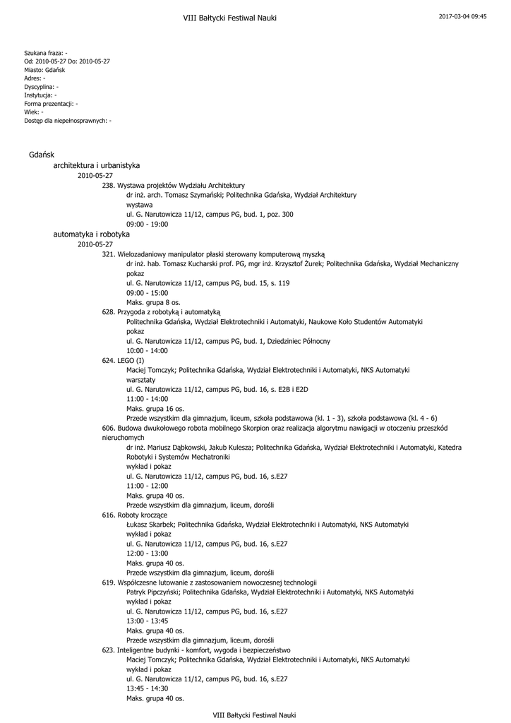 27 maja (czwartek) - Bałtycki Festiwal Nauki