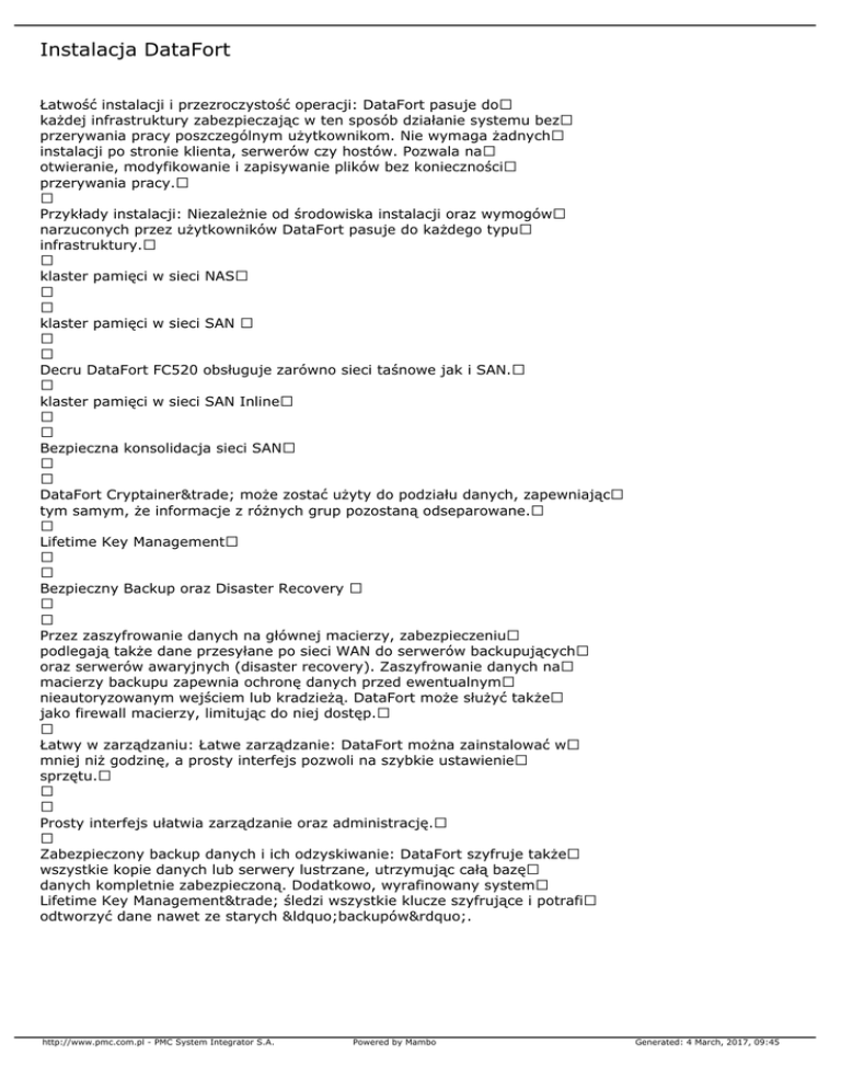 Instalacja DataFort Łatwość instalacji i przezroczystość operacji: DataFort pasuje do każdej infrastruktury zabezpieczając w ten sposób działanie systemu bez przerywania pracy poszczególnym użytkownikom. Nie wymaga żadnych instalacji po stronie klienta, serwerów czy hostów. Pozwala na otwieranie, modyfikowanie i zapisywanie plików bez konieczności przerywania pracy. Przykłady instalacji: Niezależnie od środowiska instalacji oraz wymogów narzuconych przez użytkowników DataFort pasuje do każdego typu infrastruktury. klaster pamięci w sieci NAS klaster pamięci w sieci SAN Decru DataFort FC520 obsługuje zarówno sieci taśnowe jak i SAN. klaster pamięci w sieci SAN Inline Bezpieczna konsolidacja sieci SAN DataFort Cryptainer™ może zostać użyty do podziału danych, zapewniając tym samym, że informacje z różnych grup pozostaną odseparowane. Lifetime Key Management Bezpieczny Backup oraz Disaster Recovery Przez zaszyfrowanie danych na głównej macierzy, zabezpieczeniu podlegają także dane przesyłane po sieci WAN do serwerów backupujących oraz serwerów awaryjnych (disaster recovery). Zaszyfrowanie danych na macierzy backupu zapewnia ochronę danych przed ewentualnym nieautoryzowanym wejściem lub kradzieżą. DataFort może służyć także jako firewall macierzy, limitując do niej dostęp. Łatwy w zarządzaniu: Łatwe zarządzanie: DataFort można zainstalować w mniej niż godzinę, a prosty interfejs pozwoli na szybkie ustawienie sprzętu. Prosty interfejs ułatwia zarządzanie oraz administrację. Zabezpieczony backup danych i ich odzyskiwanie: DataFort szyfruje także wszystkie kopie danych lub serwery lustrzane, utrzymując całą bazę danych kompletnie zabezpieczoną. Dodatkowo, wyrafinowany system Lifetime Key Management™ śledzi wszystkie klucze szyfrujące i potrafi odtworzyć dane nawet ze starych “backupów”. http://www.pmc.com.pl - PMC System Integrator S.A. Powered by Mambo Generated: 4 March, 2017, 09:45