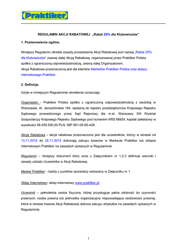 REGULAMIN AKCJI RABATOWEJ „Rabat 25% dla Klubowiczów” 1. Postanowienia ogólne. Niniejszy Regulamin określa zasady prowadzenia Akcji Rabatowej pod nazwą „Rabat 25% dla Klubowiczów” zwanej dalej Akcją Rabatową, organizowanej przez Praktiker Polska spółka z ograniczoną odpowiedzialnością, zwaną dalej Organizatorem. Akcja Rabatowa przeznaczona jest dla klientów Marketów Praktiker Polska oraz sklepu internetowego Praktiker. 2. Definicje. Użyte w niniejszym Regulaminie określenia oznaczają: Organizator - Praktiker Polska spółka z ograniczoną odpowiedzialnością z siedzibą w Warszawie, Al. Jerozolimskie 184, wpisaną do rejestru przedsiębiorców Krajowego Rejestru Sądowego prowadzonego przez Sąd Rejonowy dla m.st. Warszawy XIII Wydział Gospodarczy Krajowego Rejestru Sądowego pod numerem KRS 68924, kapitał zakładowy w wysokości 58.459.500,00 PLN, NIP 951-00-65-428. Akcja Rabatowa – akcja rabatowa przeznaczona jest dla uczestników, którzy w okresie od 13.11.2015 do 25.11.2015 dokonają zakupu towarów w Markecie Praktiker lub sklepie internetowym Praktiker na zasadach opisanych w Regulaminie. Regulamin – niniejszy dokument który wraz z Załącznikiem nr 1,2,3 definiuje warunki i zasady udziału Uczestnika w Akcji Rabatowej. Market Praktiker – każdy z punktów sprzedaży wskazany w Załączniku nr 1 Sklep Internetowy- sklep internetowy www.praktiker.pl Uczestnik – pełnoletnia osoba fizyczna, której przysługuje pełna zdolność do czynności prawnych, osoba prawna lub jednostka organizacyjna nieposiadająca osobowości prawnej, która w okresie trwania Akcji Rabatowej dokona zakupu artykułów na zasadach opisanych w Regulaminie. 1 Rabat bezpośredni – rabat przyznawany Uczestnikom polegający na pomniejszeniu ceny brutto do zapłaty za zakup artykułów w Marketach Praktiker o 25%. Artykuły wskazane w Załączniku nr 3 Artykuły promocyjne - artykuły będące w promocji oznaczone w sklepie w specjalny sposób jako artykuły promocyjne oraz artykuły, których ceny zostały obniżone bezpośrednio na kasie np. ze względu na uszkodzenie, czy sprzedaż towaru z ekspozycji. Informacja Główna – punkt obsługi klienta w Markecie Praktiker. 3. Zasady organizacji Akcji Rabatowej 3.1 Akcja Rabatowa prowadzona jest w Marketach Praktiker na terenie Polski wymienionych w załączniku nr 1 do Regulaminu oraz Sklepie Internetowym i polega na uzyskaniu 25% Rabatu Bezpośredniego na artykuły zakupione w ilościach detalicznych. 3.2 Rabat bezpośredni nie dotyczy Artykułów Promocyjnych. 3.3 Rabat bezpośredni nie dotyczy usług i artykułów, których szczegółowa lista znajduje się w załączniku nr 2 do niniejszego regulaminu. 3.4 Akcja Rabatowa nie dotyczy artykułów kupowanych w ilościach hurtowych. 3.5 Rabat 25% nie sumuje się z rabatem bezpośrednim dla posiadaczy złotych kart lojalnościowych Klubu Praktiker oraz rabatem bezpośrednim dla posiadaczy kart personalnych Pracownika Praktiker. 3.6 Akcja Rabatowa nie łączy się z innymi promocjami obowiązującymi w marketach Praktiker i sklepie internetowym Praktiker. 4. Postępowanie reklamacyjne. 4.1. Reklamacje dotyczące Akcji Rabatowej mogą być składane przez Uczestnika na piśmie w Informacji Głównej w Markecie Praktiker, w którym dokonano zakupów wraz z dowodem zakupu, potwierdzającym dokonanie transakcji w okresie Akcji Rabatowej (paragon fiskalny /faktura VAT). Zgłoszenie reklamacji powinno zawierać imię i nazwisko Uczestnika oraz jego podpis. 2 4.2 Uczestnicy, którzy dokonali zakupów w sklepie internetowym mogą składać reklamacje, dotyczące Akcji Rabatowej, na adres e-mail: [email protected] z podaniem: imienia i nazwisko Uczestnika oraz numeru zamówienia online. 4.3 Uczestnik może zgłosić reklamację w terminie 14 dni od daty dokonania reklamowanej transakcji. 4.4 Reklamacje rozpatrywane są przez Organizatora w terminie 14 dni od daty otrzymania reklamacji. 4.4 Prawo złożenia reklamacji przysługuje jedynie Uczestnikom. 4.5 Decyzja Organizatora w przedmiocie reklamacji jest ostateczna i wiążąca. Uczestnik o decyzji Organizatora zostanie powiadomiony listem poleconym na adres podany w reklamacji nadanym w terminie 7 dni od daty rozpatrzenia reklamacji. 5. Postanowienia końcowe 5.1. Treść Regulaminu dostępna jest dla Uczestników w czasie trwania Akcji Rabatowej w Informacji Głównej Marketów Praktiker biorących udział w akcji rabatowej oraz na stronie internetowej www.praktiker.pl 3 Załącznik nr 1 do Regulaminu Akcji Rabatowej Lista marketów Praktiker biorących udział w Akcji Rabatowej 4 Załącznik nr 2 do Regulaminu Akcji Rabatowej Lista usług i artykułów wykluczonych z rabatowania Kaucja zwrotna za wypożyczenie zgrzewarki Opłata za wypożyczenie zgrzewarki Usługa szycia firan Usługi krawieckie Usługa wycinania otworów w zlewozmywakach Usługa oprawiania obrazów Usługa przycinania płyt Opłata Depozytowa Sprzedaż palet jednorazowych Sprzedaż odpadów drewnianych Sprzedaż złomu Sprzedaż doładowań telefonów komórkowych 5 Załącznik nr 3 do Regulaminu Akcji Promocyjnej Lista artykułów biorących udział w promocji Lp. NR art. 1 2 3 4 5 6 7 8 9 10 11 12 13 14 15 16 17 18 19 20 21 22 23 24 25 401966 441333 469025 457036 457030 457033 291616 204868 463802 280315 376744 369310 369311 369312 439067 439068 439066 440697 438644 370995 447240 474242 474243 474240 474241 Cena asortymentowa/ assortment price nazwa WIDEODOMOFON 1-RODZINNY ZE SLUCHAWK WARSZTAT MOBILNY WIELOFUNKCYJNY DYWAN NOE 160X220 SZARY PLYTKA PODLOGOWA DIGIO KREM G1 PLYTKA SCIENNA DIGIO KREM G1 PLYTKA SCIENNA DIGIO BRAZ G1 KAMIEN ELEWACYJNY CAMPANA KREMOWY ACRYL MATT EMULSJA AKRYLOWA BIALA KABINA PRYSZNICOWA IVETTE90X90X205 Z HYDROMASAZEM MALEINAK PLUS DO KUCHNI I LAZIENEK 5L DESZCZOWNIA NEO FRESH CHROMSLUCHAWKA 3 STRUM. WAZ 0/1 BATERIA WANNOWA SERIA TORO CHROM BATERIA UMYWALKOWA SZTORC SERIA TORO CHROM BATERIA PRYSZNICOWA SERIA TORO CHROM KRZESLO DREWNIANE 