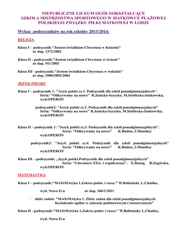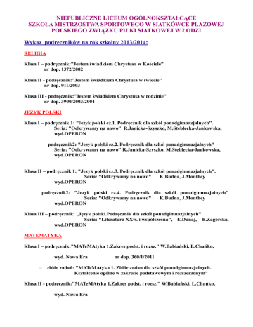 NIEPUBLICZNE LICEUM OGÓLNOKSZTAŁCĄCE SZKOŁA MISTRZOSTWA SPORTOWEGO W SIATKÓWCE PLAŻOWEJ POLSKIEGO ZWIĄZKU PIŁKI SIATKOWEJ W ŁODZI Wykaz podręczników na rok szkolny 2013/2014: RELIGIA Klasa I – podręcznik:”Jestem świadkiem Chrystusa w Kościele” nr dop. 1372/2002 Klasa II - podręcznik:”Jestem świadkiem Chrystusa w świecie” nr dop. 911/2003 Klasa III - podręcznik:”Jestem świadkiem Chrystusa w rodzinie” nr dop. 3900/2003/2004 JĘZYK POLSKI Klasa I – podręcznik 1: "Jezyk polski cz.1. Podręcznik dla szkół ponadgimnazjalnych". Seria: "Odkrywamy na nowo" R.Janicka-Szyszko, M.Steblecka-Jankowska, wyd.OPERON podręcznik2: "Jezyk polski cz.2. Podręcznik dla szkół ponadgimnazjalnych" Seria: "Odkrywamy na nowo" R.Janicka-Szyszko, M.Steblecka-Jankowska, wyd.OPERON Klasa II – podręcznik 1: "Jezyk polski cz.3. Podręcznik dla szkół ponadgimnazjalnych". Seria: "Odkrywamy na nowo" K.Budna, J.Monthey wyd.OPERON podręcznik2: "Jezyk polski cz.4. Podręcznik dla szkół ponadgimnazjalnych" Seria: "Odkrywamy na nowo" K.Budna, J.Monthey wyd.OPERON Klasa III – podręcznik: „Język polski.Podręcznik dla szkół ponadgimnazjalnych” Seria: "Literatura XXw. i współczesna", E.Dunaj, B.Zagórska, wyd.OPERON MATEMATYKA Klasa I – podręcznik:"MATeMAtyka 1.Zakres podst. i rozsz." W.Babiański, L.Chańko, wyd. Nowa Era nr dop. 360/1/2011 – zbiór zadań: "MATeMAtyka 1. Zbiór zadan dla szkół ponadgimnazjalnych. Kształcenie ogólne w zakresie podstawowym i rozszerzonym" Klasa II - podręcznik:"MATeMAtyka 1.Zakres podst. i rozsz." W.Babiański, L.Chańko, wyd. Nowa Era - zbiór zadań: "MATeMAtyka 1. Zbiór zadań dla szkół ponadgimnazjalnych. Kształcenie ogólne w zakresie podstawowym i rozszerzonym" Klasa III – podręcznik: "Matematyka 3. Poznać zrozumieć" A.Przychoda, M.Strawa, Z.Łaszczyk wyd. WSiP, nr dop. 23/3/10/S FIZYKA Klasa I – podręcznik: "Fizyka to nie katastrofa" W.Kwitowski wyd. Zamkor CHEMIA Klasa I – podręcznik: "To jest chemia" R.Hassa, A. Mrzigod wyd. Nowa Era nr dop. 438/2012 BIOLOGIA Klasa I – podręcznik:"Biologia 1. Seria Odkrywamy na nowo. Zakres podstawowy. ` Podręcznik dla szkół ponadgimnazjalnych" B.Jakubik, R.Szymańska wyd. OPERON Klasa II – podręcznik: "Biologia na czasie. Zakres rozszerzony" M.Guzik, E.Jastrzębska wyd. Nowa Era Klasa III – podręczniki: "Biologia 1. zakres podstawowy", "Biologia 2.Zakres podstawowy", "Biologia 3.Zakres podstawowy" E.Bartnik, W.Lewiński wyd. OPERON GEOGRAFIA Klasa I – podręcznik:"Geografia XXI wieku.Podręcznik dla szkół ponadgimnazjalnych. Zakres podstawowy" W.Wiecki wyd. Klett nr dop. 464/2012 - ćwiczenia: "Geografia XXI wieku.Zeszyt ćwiczeń dla szkół ponadgimnazjalnych. Zakres podstawowy" B.Stachowska, J.Nowacka, B.Pusz wyd. Klett – atlas geograficzny swiata (dowolny) klasa III - podręcznik "Vademecum maturalne-geografia 2013" J.Stasiak, Z.Zaniewicz wyd. OPERON JĘZYK ANGIELSKI Klasa I – POZIOM IV.1 – podręcznik - "Gateway 2 Student`s Book" D. Spencer wyd. Macmillan POZIOM IV.0 – podręcznik - "Gateway 1 Student`s Book " D. Spencer wyd. Macmillan Klasa II – POZIOM IV.1 – podręcznik - "Gateway 3 Student`s Book" D. Spencer wyd. Macmillan POZIOM IV.0 – podręcznik - "Gateway 2 Student`s Book " D. Spencer wyd. Macmillan Klasa III – podręcznik:M.Rosińska, L.Edwards „Matura.Repetytorium z testami” wyd. MACMILLAN Uwaga! Proszę wstrzymać się z zakupem podręczników do czasu przydzielenia ucznia do odpowiedniej grupy językowej. JEZYK NIEMIECKI Klasa I – POZIOM IV.0 – podr. z ćwiczeniami : "Motive Deutsch 1" A. Jarząbek D.Koper wyd. WSiP POZIOM IV.1 – podręcznik 1: "Alles Klar 1a kurs dla kontynuujących naukę, zakres rozszerzony" K.Łuniewska wyd. WSiP podręcznik 2: "Alles Klar 1b kurs dla kontynuujących naukę, zakres rozszerzony" K.Łuniewska wyd. WSiP Klasa II - POZIOM IV.0 – podr. z ćwiczeniami : "Motive Deutsch 2" A. Jarząbek D.Koper wyd. WSiP POZIOM IV.1 – podręcznik 1: "Alles Klar 2a kurs dla kontynuujących naukę, zakres rozszerzony" K.Łuniewska wyd. WSiP, podręcznik 2: "Alles Klar 2b kurs dla kontynuujących naukę, zakres rozszerzony" K.Łuniewska wyd. WSiP Klasa III – POZIOM PODSTAWOWY: podręcznik 1: „Alles klar 2b” K.Łuniewska, wyd. WSiP podręcznik 2: „Alles klar 3a” K.Łuniewska, wyd. WSiP POZIOM ROZSZERZONY: podręcznik 1: "Alles Klar 3a kurs dla kontynuujących naukę, zakres rozszerzony" K.Łuniewska wyd. WSiP, podręcznik 2: "Alles Klar 3b kurs dla kontynuujących naukę, zakres rozszerzony" K.Łuniewska wyd. WSiP, podręcznik 3: "Abc. Repetytorium maturalne" K.Łuniewska wyd. WSiP Uwaga! Proszę wstrzymać się z zakupem podręczników do czasu przydzielenia ucznia do odpowiedniej grupy językowej. HISTORIA Klasa I – podręcznik: "Historia.Wiek XX" D Stola wyd. WS PWN nr dop. 486/2012 Klasa III - podręcznik:„Historia 3” B.Burda, B.Halczak, R.Józefiak, M.Szymczak, wyd.OPERON nr dop. 427/03 WIEDZA O SPOŁECZEŃSTWIE klasa I – podręcznik: "Wiedza o społeczeństwie" P.Krzesicki wyd. WS PWN nr dop. 527/2012 Klasa III – podręcznik:"Wiedza o społeczeństwie.Zakres podstawowy" Z.Smutek, B.Surmacz wyd.OPERON HISTORIA I SPOŁECZEŃSTWO klasa II – podręcznik: "Historia i społeczeństwo" A. Balicki i in. Wyd. OPERON WIEDZA O KULTURZE Klasa I – podręcznik:"Spotkanie z kulturą" M.Bokiniec, B.Forysiewicz wyd. Nowa Era nr dop. 449/2012 EDUKACJA DLA BEZPIECZEŃSTWA Klasa I – podręcznik:"Edukacja dla bezpieczeństwa" M.Goniewicz, A.Nowak-Kowal, Z.Smutek wyd. OPERON nr dop. 411/2012 INFORMATYKA Klasa I – podręcznik:, „Informatyka. Po prostu. Zakres podstawowy" Z.Nowakowski wyd. WSiP nr dop. 516/2012 PODSTAWY PRZEDSIĘBIORCZOŚCI klasa I – podręcznik: "Krok w przedsiębiorczość" Z.Makieła, T.Rachwał wyd. Nowa Era nr dop. 467/2012 Klasa III – podręcznik: "Krok w przedsiębiorczość" Z.Makieła, T.Rachwał wyd. Nowa Era nr dop. 467/2012