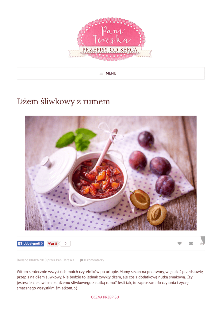 MENU Dżem śliwkowy z rumem Udostępnij 0 0 Dodano 08/09/2010 przez Pani Tereska 0 komentarzy dp Witam serdecznie wszystkich moich czytelników po urlopie. Mamy sezon na przetwory, więc dziś przedstawię przepis na dżem śliwkowy. Nie będzie to jednak zwykły dżem, ale coś z dodatkową nutką smakową. Czy jesteście ciekawi smaku dżemu śliwkowego z nutką rumu? Jeśli tak, to zapraszam do czytania i życzę smacznego wszystkim śmiałkom. :-) OCENA PRZEPISU (5 / 5) (1 ocena/y) SKŁADNIKI 1000 g śliwek węgierek (bez pestek) 1 Cukier żelujący 3:1 Dr. Oetkera 50 ml rumu SPOSÓB PRZYGOTOWANIA 1. Przygotowanie dżemu zaczynam od umycia śliwek. Następnie wyjmuję pestki i tak przygotowane śliwki kroję na małe kawałki. W trakcie tych czynności zwracam oczywiście uwagę na to, czy moje śliwki są zdrowe i nie zamieszkałe przez niepożądanych gości. :-) 2. Teraz pora na wsypanie śliwek do garnka i dodanie cukru żelującego. Garnek ze śliwkami jest już na kuchni. W trakcie podgrzewania mieszam, aż zacznie wrzeć, a potem gotuję dżem 5 minut ciągle mieszając. 3. Po 5 minutach zdejmuję garnek z ognia, wlewam rum i mieszam wszystko do momentu zniknięcia piany. Teraz pozostaje nałożyć jeszcze gorący dżem do wyparzonych słoików, szczelnie zamknąć je pokrywkami i odstawić do góry dnem na ok. 5 minut. Jesienią i zimą ta nutka rumu w dżemie może być czymś przyjemnym, nie sądzicie? Zapraszam do spróbowania tego przepisu. Jestem bardzo ciekawa Waszych opinii. Kategorie: Przetwory Tagi: alkohol, śliwki OCEŃ TEN PRZEPIS Średnia ocena 1 fan oceniał ten przepis. Nie ma jeszcze komentarzy. DODAJ KOMENTARZ (5 / 5) Komentarz Imię Email Dodaj komentarz ZOBACZ PODOBNE PRZEPISY Aromatyczny dżem śliwkowy z brzoskwiniami i wanilią Dżem truskawkowo-rabarbarowy z bananem i wanilią Kon tura z czerwonych pomarańczy Powidła śliwkowe z korzenną nutą Gładki dżem z czerwonych porzeczek Dżem brzoskwiniowy z czarną porzeczką POPULARNE PRZEPISY Pączki klasyczne Drożdżowe kieszonki z czekoladą Oponki TAGI agrest, alkohol, ananas, bakalie, banany, biała czekolada, białka wykorzystanie, biszkopty, brzoskwinie, budyń, chałwa, chili, cynamon, cytryny, czarne porzeczki, czekolada, czereśnie, czerwone porzeczki, daktyle, drożdże, dynia, dżem/kon tura, gi, frużelina, galaretka, goździki, granat, gruszki, herbatniki/ciasteczka, imbir, jabłka, jagody/borówki amerykańskie, jeżyny, jogurt, kakao, kardamon, kawa, ke r/maślanka, kisiel, kiwi, kleik ryżowy, krakersy, krem budyniowy, kwaśna śmietana, laska cynamonu, laska wanilii, majonez, mak, maliny, mango, marcepan, marchewka, masa krówkowa, mascarpone, masło orzechowe, migdały, miód, mięta, mleczko kokosowe, mleko skondesowane, mleko w proszku, morele, mąka krupczatka, mąka orkiszowa, mąka pełnoziarnista, mąka ziemniaczana, mąka żytnia, nutella, orzechy laskowe, orzechy włoskie, orzeszki ziemne, pierniczki, pigwa, pomarańcze/mandarynki, porzeczki, przyprawa korzenna, płatki owsiane, rabarbar, ricotta, rodzynki, serek homogenizowany, serek kremowy, sezam, smalec, szpinak, słonecznik, truskawki, twaróg, winogrona, wiórki kokosowe, wiśnie, śliwki, śmietanka kremówka, żelatyna, żelatyna w listkach, żurawina, żółtka wykorzystanie PANI TERESKA Mam na imię Teresa, mieszkam w Trójmieście i od przeszło trzydziestu lat pracuję w rmie Dr. Oetker w Gdańsku. Moje życie, zarówno zawodowe jak i prywatne, kręci się wokół pieczenia i gotowania, dlatego założyłam ten blog. Daje mi on możliwość dzielenia się z Wami moją pasją i jej efektami czyli moimi przepisami kulinarnymi. e-mail : [email protected] Pani Tereska Like Page 80K likes Be the first of your friends to like this © 2017 Pani Tereska - Przepisy od serca. All Rights Reserved.