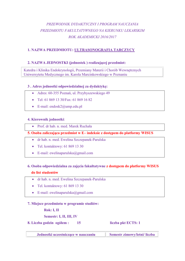 PRZEWODNIK DYDAKTYCZNY I PROGRAM NAUCZANIA PRZEDMIOTU FAKULTATYWNEGO NA KIERUNKU LEKARSKIM ROK AKADEMICKI 2016/2017 1. NAZWA PRZEDMIOTU: ULTRASONOGRAFIA TARCZYCY 2. NAZWA JEDNOSTKI (jednostek ) realizującej przedmiot: Katedra i Klinika Endokrynologii, Przemiany Materii i Chorób Wewnętrznych Uniwersytetu Medycznego im. Karola Marcinkowskiego w Poznaniu 3 . Adres jednostki odpowiedzialnej za dydaktykę: Adres: 60-355 Poznań, ul. Przybyszewskiego 49 Tel: 61 869 13 30/Fax: 61 869 16 82 E-mail: [email protected] 4. Kierownik jednostki: Prof. dr hab. n. med. Marek Ruchała 5. Osoba zaliczająca przedmiot w E– indeksie z dostępem do platformy WISUS dr hab. n. med. Ewelina Szczepanek-Parulska Tel. kontaktowy: 61 869 13 30 E-mail: [email protected] 6. Osoba odpowiedzialna za zajęcia fakultatywne z dostępem do platformy WISUS do list studentów dr hab. n. med. Ewelina Szczepanek-Parulska Tel. kontaktowy: 61 869 13 30 E-mail: [email protected] 7. Miejsce przedmiotu w programie studiów: Rok: I, II Semestr: I, II, III, IV 8. Liczba godzin ogółem : 15 Jednostki uczestniczące w nauczaniu liczba pkt ECTS: 1 Semestr zimowy/letni/ liczba przedmiotu godzin Ćwiczenia kategoria W Ć Katedra i Klinika Endokrynologii, Przemiany Materii i Chorób Wewnętrznych 0 15 0 Razem: 0 15 0 S 9 . Cel nauczania przedmiotu Celem fakultetu jest zapoznanie Studentów z podstawami diagnostyki ultrasonograficznej gruczołu tarczowego i węzłów chłonnych szyi, a także ze wskazaniami i sposobem wykonania biopsji aspiracyjnej cienkoigłowej podejrzanych zmian oraz wprowadzenie do nowoczesnych metod diagnostycznych takich jak sonoelastografia. 10.SYLABUS 11.Tematyka poszczególnych ćwiczeń i seminariów Ćwiczenia - Semestr zimowy/letni Tematyka ćwiczeń Ćwiczenie 1. Ćwiczenie 2. Osoba odpowiedzialna Anatomia ultrasonograficzna, echostruktura gruczołu tarczowego. Prezentacja techniki badania USG - budowa i regulacja aparatów USG, zastosowanie poszczególnych głowic, przygotowanie pacjenta do badania. Wprowadzenie. prof. dr hab. n. med. Marek Ruchała Ultrasonografia gruczołu tarczowego. dr hab. n. med. Ewelina SzczepanekParulska / dr n.med. Nadia Sawicka-Gutaj / lek. Ariadna Zybek-Kocik Ćwiczenie 3. Ultrasonografia gruczołu tarczowego. Ćwiczenie 4. Ultrasonografia gruczołu tarczowego. Ćwiczenie 5. Ultrasonografia gruczołu tarczowego. dr hab. n. med. Ewelina SzczepanekParulska / dr n.med. Nadia Sawicka-Gutaj / lek. Ariadna Zybek-Kocik dr hab. n. med. Ewelina SzczepanekParulska / dr n.med. Nadia Sawicka-Gutaj / lek. Ariadna Zybek-Kocik dr hab. n. med. Ewelina SzczepanekParulska / dr n.med. Nadia Sawicka-Gutaj / lek. Ariadna Zybek-Kocik 12. Organizacja zajęć: Zajęcia fakultatywne odbywają się : I termin – 13.10.2016, 14.10.2016, 20.10.2016, 21.10.2016, 27.10.2016 w godzinach: 11:30 – 13:45 II termin – 8.11.2016, 9.11.2106, 15.11.2016, 22.11.2016, 23.11.2016 w godzinach: 11:30 – 13:45 III termin – 1.12.2016, 2.12.2016, 8.12.2016, 15.12.2016, 16.12.2016 w godzinach: 11:30 – 13:45 IV termin – 4.04.2017, 5.04.2017, 6.04.2017, 11.04.2017, 12.04.2017 w godzinach: 11:30 – 13:45 V termin – 9.05.2017, 10.05.2017, 11.05.2017, 16.05.2017, 17.05.2017 w godzinach: 11:30 – 13:45 VI termin – 1.06.2017, 2.06.2017, 7.06.2017, 8.06.2017, 9.06.2017 w godzinach: 11:30 – 13:45 REGULAMIN ZAJĘĆ: Zajęcia z przedmiotu „Ultrasonografia tarczycy” prowadzone dla studentów I i II roku Wydziału Lekarskiego I, kierunek lekarski, obejmują pięć dni zajęć ćwiczeniowych (15 godzin) odbywających się w Klinice Endokrynologii, Przemiany Materii i Chorób Wewnętrznych. Do zaliczenia przedmiotu wymagana jest obecność na wszystkich zajęciach. W wyjątkowych, uzasadnionych przypadkach, po uprzednim uzgodnieniu terminu z osobą koordynującą zajęcia nieobecność można odrobić z inną grupą studencką. Grupy mogą liczyć max 15 osób. PROGRAM ZAJĘĆ: 1. Anatomia i topografia tarczycy 2. Podstawy badania ultrasonograficznego tarczycy 3. Prawidłowy obraz ultrasonograficzny tarczycy 4. Embriogeneza i zaburzenia rozwojowe tarczycy 5. Wole 6. Choroba Gravesa-Basedowa 7. Zapalenia tarczycy 8. Jatrogenne patologie tarczycy 9. Rola ultrasonografii tarczycy w leczeniu chirurgicznym 10. Ultrasonografia tarczycy płodu 11. Biopsja aspiracyjna celowana cienkoigłowa tarczycy 12. Diagnostyka ultrasonograficzna przytarczyc 13. Ultrasonograficzna ocena węzłów chłonnych szyi 14. Wprowadzenie do sonoelastografii PROGRAM NAUCZANIA Wymagania wstępne: ogólne wiadomości z anatomii i fizjologii tarczycy Przygotowanie do zajęć: przypomnienie podstawowych wiadomości z zakresu anatomii i fizjologii tarczycy Wymagania końcowe: umiejętność wykonania badania ultrasonograficznego tarczycy oraz interpretowania jego wyników, znajomość wskazań do biopsji aspiracyjnej cienkoigłowej i umiejętność interpretowania wyników badania, znajomość podstaw sonoelastografii 13.Kryteria zaliczenia przedmiotu: Zaliczenie – kryterium zaliczenia Aktywny udział studenta w zajęciach 14. Literatura: Zalecana literatura: 1. Marek Ruchała (red.), Atlas ultrasonograficzny tarczycy w aspekcie praktycznym, Termedia, Poznań 2012 2. Ewa Białek, Wiesław Jakubowski. Diagnostyka ultrasonograficzna tarczycy, przytarczyc i węzłów chłonnych szyi, Makmed, Gdańsk 2001 3. Interna Szczeklika - mały podręcznik 2015/2016, Medycyna Praktyczna, Kraków 2015 15. Podpis osoby odpowiedzialnej za nauczanie przedmiotu lub koordynatora