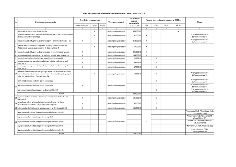 Plan postępowań o udzielenie zamówień w roku 2017 r. (16/01/2017) Przedmiot postępowania Lp 1 Przedmiot postepowania Tryb postępowania 2 roboty budowlane usługi dostawy 3 4 5 1 Ochrona fizyczna i monitoring obiektów 2 Inwestor zastępczy przy realizacji zamówienia na wyk. Termomodernizacji obiektu przy ul. Dąbrowskiego 4 3 Przebudowa obiektu przy ul. Dąbrowskiego 4 - termomodernizacja + co 4 I kw II kw III kw IV kw 7 8 9 10 11 Termin wszczęcia postępowania w 2017 r. Uwagi przetarg nieograniczony 1 500 000,00 X przetarg nieograniczony 41 000,00 X W przypadku uzyskania dofinansowania z UE przetarg nieograniczony 1 260 000,00 X W przypadku uzyskania dofinansowania z UE przetarg nieograniczony 57 000,00 X X X 5 Przebudowa obiektu przy ul. Dąbrowskiego 4 - modernizacja wnętrza X przetarg nieograniczony 1 895 000,00 X 6 Przebudowa lokali mieszkalnych w budynku przy ul. Wyszyńskiego 6 X przetarg nieograniczony 153 000,00 X 7 Przebudowa lokalu mnieszkalnego przy ul. Paderewskiego 10 X przetarg nieograniczony 92 000,00 X X przetarg nieograniczony 88 000,00 X X przetarg nieograniczony 67 000,00 X przetarg nieograniczony 53 000,00 X 277 666,67 X 277 666,67 X 277 666,67 X Zmiana sposobu ogrzewania i przebudowa lokali w budynku przy ul. Łużyckiej 3 Zmiana sposobu ogrzewania i przebudowa lokali w budynku przy ul. 9 Łużyckiej 4 8 Pełnienie funkcji inwestora zastępczego w tym nadzoru inwestorskiego 10 przy realizacji zamówienia na wyk. termomodernizacji budyków przy ul. Łużyckiej 3, Łużyckiej 4 i Grunwaldzkiej 64 X Termomodernizacja budynku prz ul. Łużyckiej 3 11 X Termomodernizacja budynku prz ul. Łużyckiej 4 przetarg nieograniczony Termonodernizacja budynku przy ul. Grunwaldzkiej 64 Razem W przypadku uzyskania dofinansowania z UE W przypadku uzyskania dofinansowania z UE W przypadku uzyskania dofinansowania z UE W przypadku uzyskania dofinansowania z UE 833 000,00 12 Wymiana stolarki okiennej i drzwiowej w loklach mieszkalnych oraz użytkowych X przetarg nieograniczony 135 000,00 X 13 Przbudowa celem wykonania i montażu windy wraz z szybem zewnetrznym w budynku przy ul. Wyspiańskiego 35 C X przetarg nieograniczony 57 000,00 X 14 Roboty dekarsko-blacharskie w budynku przy ul. Chrobrego 26-28 X przetarg nieograniczony 185 200,00 X Wykonanie dokumentacji na przebudowę lokali mieszkalnych 16 000,00 Wykonanie dokumentacji na przebudowę lokali 30 000,00 15 Wykonanie dokumentacji na przebudowę lokali mieszkalnych 11 X X Pełnieni nadzoru inwestorskiego przy realizacji zamówienia na wyk. Modernizacji wnętrza budynku przy ul. Dabrowskiego 4 6 Orientacyjna wartość zamówienia (netto w zł) przetarg nieograniczony 38 000,00 X Piłsudskiego 13/5; Piłsudskiego 33/6; Piłsudskiego 33/10 A.Krajowej 13B/2; Poznańska 2/3; Wyszyńskiego 2/9 Łużycka 1/5; Łużycka 3/3; Łużycka 4/1, Łużycka 4/3 Wykonanie dokumentacji na przebudowę lokali mieszkalnych 20 000,00 Marynarzy 1/8. Boh. Wrzesnia 39/5 Wykonanie dokumentacji na przebudowę lokali mieszkalnych 80 000,00 Modrzejewskiej 75/2; Modrzejewskiej 20 Razem 150 000,00