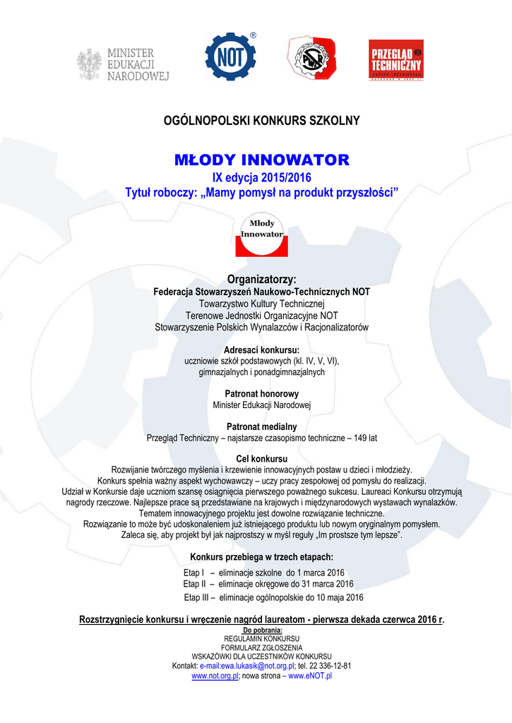 OGÓLNOPOLSKI KONKURS SZKOLNY MŁODY INNOWATOR IX edycja 2015/2016 Tytuł roboczy: „Mamy pomysł na produkt przyszłości” Organizatorzy: Federacja Stowarzyszeń Naukowo-Technicznych NOT Towarzystwo Kultury Technicznej Terenowe Jednostki Organizacyjne NOT Stowarzyszenie Polskich Wynalazców i Racjonalizatorów Adresaci konkursu: uczniowie szkół podstawowych (kl. IV, V, VI), gimnazjalnych i ponadgimnazjalnych Patronat honorowy Minister Edukacji Narodowej Patronat medialny Przegląd Techniczny – najstarsze czasopismo techniczne – 149 lat Cel konkursu Rozwijanie twórczego myślenia i krzewienie innowacyjnych postaw u dzieci i młodzieży. Konkurs spełnia ważny aspekt wychowawczy – uczy pracy zespołowej od pomysłu do realizacji. Udział w Konkursie daje uczniom szansę osiągnięcia pierwszego poważnego sukcesu. Laureaci Konkursu otrzymują nagrody rzeczowe. Najlepsze prace są przedstawiane na krajowych i międzynarodowych wystawach wynalazków. Tematem innowacyjnego projektu jest dowolne rozwiązanie techniczne. Rozwiązanie to może być udoskonaleniem już istniejącego produktu lub nowym oryginalnym pomysłem. Zaleca się, aby projekt był jak najprostszy w myśl reguły „Im prostsze tym lepsze”. Konkurs przebiega w trzech etapach: Etap I – eliminacje szkolne do 1 marca 2016 Etap II – eliminacje okręgowe do 31 marca 2016 Etap III – eliminacje ogólnopolskie do 10 maja 2016 Rozstrzygnięcie konkursu i wręczenie nagród laureatom - pierwsza dekada czerwca 2016 r. Do pobrania: REGULAMIN KONKURSU FORMULARZ ZGŁOSZENIA WSKAZÓWKI DLA UCZESTNIKÓW KONKURSU Kontakt: e-mail:[email protected]; tel. 22 336-12-81 www.not.org.pl; nowa strona – www.eNOT.pl