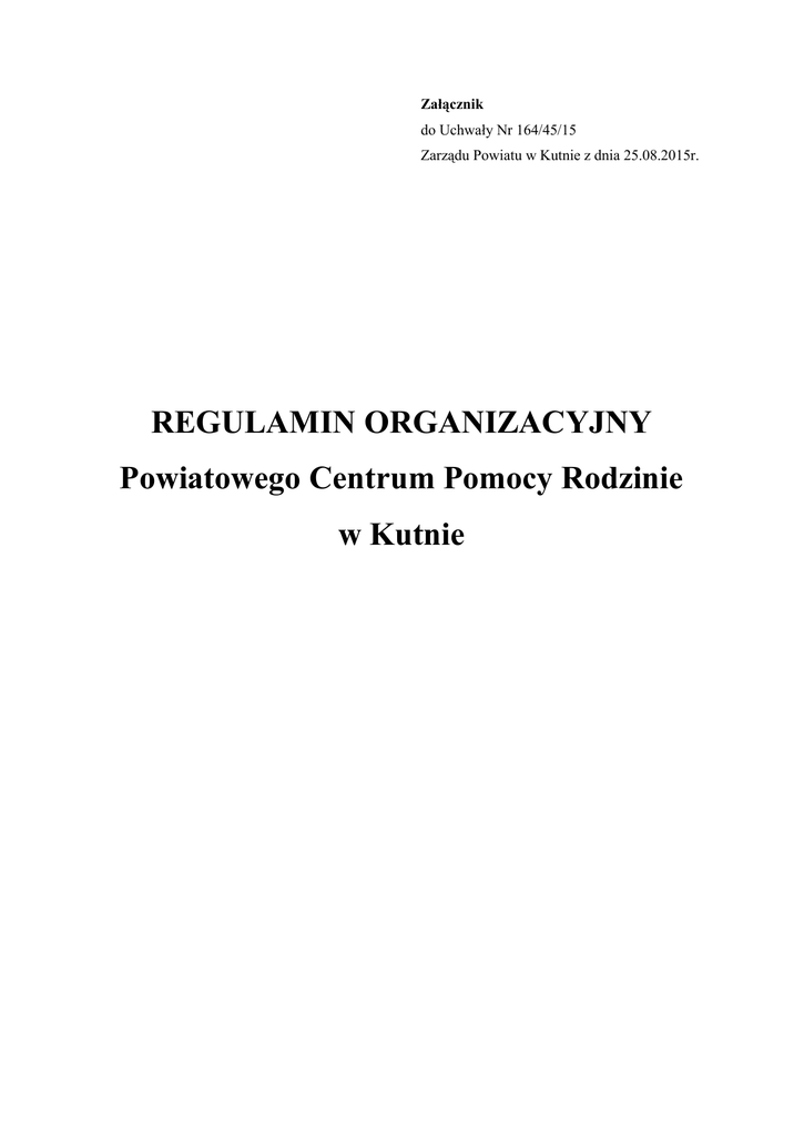 Załącznik do Uchwały Nr 164/45/15 Zarządu Powiatu w Kutnie z dnia 25.08.2015r. REGULAMIN ORGANIZACYJNY Powiatowego Centrum Pomocy Rodzinie w Kutnie Spis treści Strona nr ROZDZIAŁ I Postanowienia ogólne 3 ROZDZIAŁ II Organizacja Centrum 10 ROZDZIAŁ III Podział zadań i kompetencji w Centrum 11 ROZDZIAŁ IV Podstawowe zakresy działania komórek organizacyjnych 14 ROZDZIAŁ V Obsługa prawna Centrum 28 ROZDZIAŁ VI Zasady opracowywania i wydawania aktów prawnych i administracyjnych przez Centrum ROZDZIAŁ VII 29 Obieg korespondencji oraz zasady podpisywania pism, decyzji i innych dokumentów ROZDZIAŁ VIII System kontroli zarządczej 30 31 ROZDZIAŁ IX Tryb przyjmowania, rozpatrywania i załatwiania skarg i wniosków 31 ROZDZIAŁ X Zasady obsługi interesantów ZAŁĄCZNIK Schemat organizacyjny Powiatowego Centrum Pomocy Rodzinie 33 w Kutnie 2 Rozdział I Postanowienia ogólne §1 Regulamin organizacyjny Powiatowego Centrum Pomocy Rodzinie w Kutnie, zwany dalej ,,Regulaminem’’, określa zadania i zasady działania Powiatowego Centrum Pomocy Rodzinie w Kutnie, jego wewnętrzną strukturę organizacyjną, podział zadań i kompetencji, właściwości rzeczowe komórek organizacyjnych, zasady organizacji pracy i załatwiania spraw w Centrum. §2 Zapisy niniejszego Regulaminu należy rozumieć: 1. Powiat - Powiat Kutnowski, 2. Rada - Rada Powiatu w Kutnie, 3. Zarząd - Zarząd Powiatu w Kutnie, 4. Starosta - Starosta Kutnowski, Przewodniczący Zarządu Powiatu w Kutnie, 5. Starostwo - Starostwo Powiatowe w Kutnie, 6. Centrum - Powiatowe Centrum Pomocy Rodzinie w Kutnie, 7. Dyrektor - Dyrektor Powiatowego Centrum Pomocy Rodzinie w Kutnie, 8. Osoba nadzorująca dział - pracownik nadzorujący dział, 9. Główny Księgowy - kierujący Działem Finansowym, 10. PFRON - Państwowy Fundusz Rehabilitacji Osób Niepełnosprawnych, 11. Zespół - Powiatowy Zespół ds. Orzekania o Niepełnosprawności w Kutnie, 12. Przewodniczący - Przewodniczący Powiatowego Zespołu ds. Orzekania o Niepełnosprawności, 13. Ustawa o pomocy społecznej - ustawa z dnia 12 marca 2004 roku o pomocy społecznej (t.j.: Dz.U. z 2015r. poz. 163 z późn. zm.), 14. Ustawa o wspieraniu rodziny i systemie pieczy zastępczej - ustawa z dnia 09 czerwca 2011 roku (t.j. Dz. U. z 2015r. poz. 332 z późn. zm.), 15. Ustawa o rehabilitacji – ustawa z dnia 27 sierpnia 1997 roku o rehabilitacji zawodowej i społecznej oraz zatrudnianiu osób niepełnosprawnych (t.j.: Dz.U. z 2011r. Nr 127, poz.721 z późn. zm.), 3 16. Ustawa o przeciwdziałaniu przemocy w rodzinie – ustawa z dnia 29 lipca 2005 roku o przeciwdziałaniu przemocy w rodzinie (Dz.U. z 2005 r. Nr 180, poz. 1493 z późn. zm.), 17. GIODO- Generalny Inspektor Ochrony Danych Osobowych, 18. EKSMOON – Elektroniczny Krajowy System Monitoringu Osób Orzekanych o Niepełnosprawności, 19. POIK – Powiatowy Ośrodek Interwencji Kryzysowej. §3 Centrum jest jednostką organizacyjną Powiatu Kutnowskiego, powołaną uchwałą Nr 21/IV/99 Rady Powiatu Kutnowskiego z dnia 28 stycznia 1999r. w sprawie utworzenia jednostki budżetowej p.n. Powiatowe Centrum Pomocy Rodzinie. §4 1. Centrum działa na podstawie następujących aktów prawnych: 1) ustawy z dnia 5 czerwca 1998 r. o samorządzie powiatowym (t. j.: Dz. U. z 2013 r. , poz. 595 z późn. zm.), 2) ustawy z dnia 27 sierpnia 2009 r. o finansach publicznych (t.j.:Dz. U. z 2013, poz. 885 z późn. zm.), 3) ustawy z dnia 12 marca 2004 r. o pomocy społecznej (t.j.: Dz. U. z 2015 r., poz. 163 z późn. zm.), 4) ustawy z dnia 09 czerwca 2011 roku o wspieraniu rodziny i systemie pieczy zastępczej (t.j. Dz. U. z 2015r. poz. 332 z późn. zm) 5) ustawy z dnia 27 sierpnia 1997 r. o rehabilitacji zawodowej i społecznej oraz zatrudnianiu osób niepełnosprawnych (t.j.: Dz.U. z 2011r. Nr 127, poz.721 z późn. zm.), 6) ustawy z dnia 14 czerwca 1960 r. Kodeks postępowania administracyjnego (t. j.: Dz. U. z 2013 r., poz. 267 z późn. zm.), 7) innych źródeł prawa powszechnie obowiązującego, w których zawarte są regulacje dotyczące zadań i kompetencji należących do Centrum, 8) Statutu Centrum, 9) uchwał Rady i Zarządu, a także zarządzeń Starosty, zarządzeń Dyrektora, 10) niniejszego Regulaminu. 4 §5 1. Centrum jest jednostką organizacyjną pomocy społecznej, wykonującą zadania Powiatu z zakresu pomocy społecznej, pieczy zastępczej oraz rehabilitacji społecznej osób niepełnosprawnych, a także inne zadania wynikające z odrębnych ustaw. 2. Centrum jest jednostką budżetową, działającą na podstawie rocznego planu finansowego zatwierdzonego przez Zarząd i uchwalonego w formie uchwały budżetowej przez Radę Powiatu. 3. Siedzibą Centrum jest miasto Kutno ulica Krzywoustego 11. §6 1. Do zadań Centrum z zakresu pomocy społecznej m.in. należy: 1) opracowanie, realizacja i koordynowanie realizacji powiatowej strategii rozwiązywania problemów społecznych, ze szczególnym uwzględnieniem programów pomocy społecznej, wspierania osób niepełnosprawnych i innych, których celem jest integracja osób i rodzin z grup szczególnego ryzyka – po konsultacji z właściwymi terytorialnie gminami, 2) prowadzenie specjalistycznego poradnictwa, 3) pomoc cudzoziemcom, którzy uzyskali w Rzeczypospolitej Polskiej status uchodźcy lub ochronę uzupełniającą, mającym trudności w integracji ze środowiskiem, 4) prowadzenie i rozwój infrastruktury domów pomocy społecznej o zasięgu ponadgminnym oraz umieszczanie w nich skierowanych osób, 5) prowadzenie mieszkań chronionych dla osób z terenu więcej niż jednej gminy oraz powiatowych ośrodków wsparcia, w tym domów dla matek z małoletnimi dziećmi i kobiet w ciąży, z wyłączeniem środowiskowych domów samopomocy i innych ośrodków wsparcia dla osób z zaburzeniami psychicznymi, 6) prowadzenie ośrodków interwencji kryzysowej, 7) udzielanie informacji o prawach i uprawnieniach, 8) szkolenie i doskonalenie zawodowe kadr pomocy społeczn