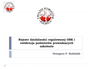 Rejestr działalności regulowanej OSK i ewidencja podmiotów prowadzących szkolenie Grzegorz P. Kubalski Charakter działalności (1) Działalność gospodarcza zarówno w zakresie prowadzenia stacji kontroli pojazdów, jak i ośrodka szkolenia kierowców jest działalnością regulowaną w rozumieniu przepisów ustawy z dnia 2 lipca 2004 roku o swobodzie działalności gospodarczej i wymaga uzyskania wpisu do odpowiedniego rejestru przedsiębiorców por. art. 83 ust. 2 oraz art. 103 ust. 1 Prawa o ruchu drogowym Kwalifikacja prowadzenia ośrodka szkolenia kierowców jako działalności regulowanej w rozumieniu przepisów ustawy z dnia 2 lipca 2004 roku o swobodzie działalności gospodarczej jest utrzymana w ustawie o kierujących pojazdami. por. art. 28 ust. 1 ustawy o kierujących pojazdami Charakter działalności (2) Działalność regulowana – działalność gospodarcza, której wykonywanie wymaga spełnienia szczególnych warunków, określonych przepisami prawa art. 5 pkt 5 ustawy o swobodzie działalności gospodarczej Jeżeli przepis odrębnej ustawy stanowi, że dany rodzaj działalności jest działalnością regulowaną w rozumieniu niniejszej ustawy, przedsiębiorca może wykonywać tę działalność, jeżeli spełnia szczególne warunki określone przepisami tej odrębnej ustawy i po uzyskaniu wpisu w rejestrze działalności regulowanej, z zastrzeżeniem art. 75. art. 64 ust. 1 ustawy o swobodzie działalności gospodarczej Ewidencjonowanie podmiotów prowadzących szkolenie kierowców Przedsiębiorcy rejestr ośrodków szkolenia kierowców Jednostka wojskowa Jednostka służb podległych lub nadzorowanych przez MSWiA Szkoła Podmiot wykonujący przewozy tramwajem ewidencja podmiotów prowadzących szkolenie Warunki stawiane przedsiębiorcom prowadzącym osk (1) Prawo o ruchu drogowym 1) 2) 3) posiadanie siedziby lub miejsca zamieszkania na terytorium Rzeczypospolitej Polskiej; nie została otwarta likwidacja lub nie ogłoszono upadłości przedsiębiorcy; brak prawomocnego skazania za przestępstwo popełnione w celu osiągnięcia korzyści majątkowej lub przestępstwo przeciwko dokumentom - dotyczy osoby fizycznej lub członków organów osoby prawnej; Ustawa o kierujących pojazdami 4) brak prawomocnego skazania za przestępstwo popełnione w celu osiągnięcia korzyści majątkowej lub przestępstwo przeciwko wiarygodności dokumentów dotyczy to osoby fizycznej lub członków organów osoby prawnej Warunki stawiane przedsiębiorcom prowadzącym osk (2) Prawo o ruchu drogowym 4) 5) posiadanie warunków lokalowych, wyposażenia dydaktycznego, placu do wykonywania manewrów oraz co najmniej jednego pojazdu przystosowanego do nauki jazdy; gwarantowanie przeprowadzenie szkolenia zgodnie z jego szczegółowymi warunkami; Ustawa o kierujących pojazdami 1) posiada infrastrukturę odpowiednią do zakresu prowadzonego szkolenia: a) b) c) d) salę wykładową, pomieszczenie biurowe, plac manewrowy oraz pojazd przeznaczony do nauki jazdy 3) posiada w ośrodku szkolenia kierowców zbiory przepisów ruchu drogowego oraz pomoce dydaktyczne właściwe ze względu na rodzaj prowadzonego szkolenia Warunki stawiane przedsiębiorcom prowadzącym osk (3) Prawo o ruchu drogowym 6) zatrudnianie co najmniej jednego instruktora lub posiadanie uprawnień instruktorem Ustawa o kierujących pojazdami 2) zatrudnianie w ośrodku szkolenia kierowców co najmniej jednego instruktora posiadającego uprawnienia oraz udokumentowaną 3-letnią praktykę w szkoleniu kandydatów na kierowców pozwalającą na prowadzenie szkolenia w zakresie uzyskiwania uprawnienia do kierowania pojazdami silnikowymi kategorii prawa jazdy określonej we wniosku, o którym mowa w ust. 4, lub sam jest instruktorem spełniającym te wymagania Zawartość wniosku o wpis do rejestru osk (1) 1. 2. 3. 4. 5. Firma przedsiębiorcy oraz oznaczenie jego adresu i siedziby albo miejsca zamieszkania; Numer w ewidencji działalności gospodarczej albo w rejestrze przedsiębiorców w Krajowym Rejestrze Sądowym - o ile są wymagane; Numer identyfikacji podatkowej (NIP) - o ile taki numer przedsiębiorca posiada; Numer identyfikacji statystycznej (REGON) - o ile taki numer przedsiębiorca posiada; Oznaczenie i adres ośrodka szkolenia kierowców; Zawartość wniosku o wpis do rejestru osk (2) 6. 7. 8. 9. Adresy należących do ośrodka szkolenia kierowców pomieszczeń biurowych, sal wykładowych i placów manewrowych, wraz z określeniem tytułu prawnego oraz dat określających okres, na jaki przedsiębiorca posiada tytuł prawny do tych obiektów; Zakres prowadzonego szkolenia; Imiona i nazwiska instruktorów i wykładowców wraz z ich numerami ewidencyjnymi; Numer rejestracyjny każdego pojazdu, którym prowadzona jest nauka jazdy. Właściwość miejscowa Art. 28. 3. Organem prowadzącym rejestr, o którym mowa w ust. 1, jest starosta właściwy ze względu na miejsce prowadzenia ośrodka szkolenia kierowców. 10. W przypadku gdy część infrastruktury ośrodka szkolenia kierowców, o której mowa w ust. 2 pkt 1, znajduje się na terenie innego powiatu, starosta, dokonując wpisu do rejestru przedsiębiorców prowadzących ośrodek szkolenia kierowców, informuje starostów, na których obszarze działania znajduje się infrastruktura ośrodka, o fakcie dokonania wpisu, przesyłając informację na temat tej infrastruktury i jej lokalizacji. Funkcjonowanie rejestru osk Wpis do rejestru Wykreślenie z rejestru Przesłanki prowadzenia szkolenia kierowców przez nie-przedsiębiorców Posiadanie odpowiedniego wyposażenia i kadry Wymóg uprzedniego wpisu do ewidencji Jednostki wojskowe Jednostki organizacyjne służb podległych lub nadzorowanych przez MSWiA Szkoły tak nie, jedynie obowiązek informacyjny Podmiot wykonujący przewozy tramwajem tak tak Zakres danych wprowadzanych do ewidencji Art. 30. 2. W ewidencji umieszcza się następujące dane: 1) nazwę podmiotu oraz oznaczenie jego adresu i siedziby; 2) numer identyfikac