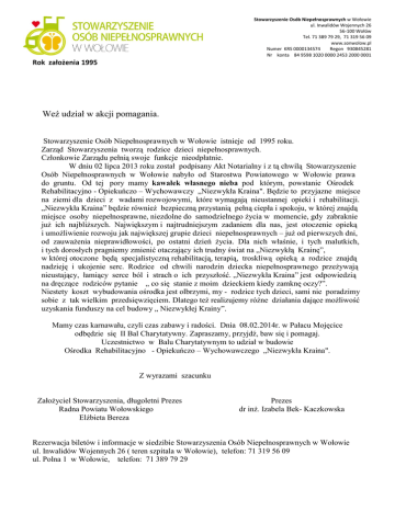 Stowarzyszenie Osób Niepełnosprawnych w Wołowie ul. Inwalidów Wojennych 26 56-100 Wołów Tel. 71 389 79 29, 71 319 56 09 www.sonwolow.pl Numer KRS 0000134574 Regon 930845281 Nr konta 84 9598 1020 0000 2453 2000 0001 Rok założenia 1995 Weź udział w akcji pomagania. Stowarzyszenie Osób Niepełnosprawnych w Wołowie istnieje od 1995 roku. Zarząd Stowarzyszenia tworzą rodzice dzieci niepełnosprawnych. Członkowie Zarządu pełnią swoje funkcje nieodpłatnie. W dniu 02 lipca 2013 roku został podpisany Akt Notarialny i z tą chwilą Stowarzyszenie Osób Niepełnosprawnych w Wołowie nabyło od Starostwa Powiatowego w Wołowie prawa do gruntu. Od tej pory mamy kawałek własnego nieba pod którym, powstanie Ośrodek Rehabilitacyjno - Opiekuńczo – Wychowawczy „Niezwykła Kraina". Będzie to przyjazne miejsce na ziemi dla dzieci z wadami rozwojowymi, które wymagają nieustannej opieki i rehabilitacji. „Niezwykła Kraina” będzie również bezpieczną przystanią pełną ciepła i spokoju, w której znajdą miejsce osoby niepełnosprawne, niezdolne do samodzielnego życia w momencie, gdy zabraknie już ich najbliższych. Największym i najtrudniejszym zadaniem dla nas, jest otoczenie opieką i umożliwienie rozwoju jak największej grupie dzieci niepełnosprawnych – już od pierwszych dni, od zauważenia nieprawidłowości, po ostatni dzień życia. Dla nich właśnie, i tych malutkich, i tych dorosłych pragniemy zmienić otaczający ich trudny świat na „Niezwykłą Krainę”, w której otoczone będą specjalistyczną rehabilitacją, terapią, troskliwą opieką a rodzice znajdą nadzieję i ukojenie serc. Rodzice od chwili narodzin dziecka niepełnosprawnego przeżywają nieustający, łamiący serce ból i strach o ich przyszłość. „Niezwykła Kraina” jest odpowiedzią na dręczące rodziców pytanie „ co się stanie z moim dzieckiem kiedy zamknę oczy?”. Niestety koszt wybudowania ośrodka jest olbrzymi, my - rodzice tych dzieci, sami nie poradzimy sobie z tak wielkim przedsięwzięciem. Dlatego też realizujemy różne działania dające możliwość uzyskania funduszy na cel budowy „ Niezwykłej Krainy”. Mamy czas karnawału, czyli czas zabawy i radości. Dnia 08.02.2014r. w Pałacu Mojęcice odbędzie się II Bal Charytatywny. Zapraszamy, przyjdź, baw się i pomagaj. Uczestnictwo w Balu Charytatywnym to udział w budowie Ośrodka Rehabilitacyjno - Opiekuńczo – Wychowawczego „Niezwykła Kraina". Z wyrazami szacunku Założyciel Stowarzyszenia, długoletni Prezes Radna Powiatu Wołowskiego Elżbieta Bereza Prezes dr inż. Izabela Bek- Kaczkowska Rezerwacja biletów i informacje w siedzibie Stowarzyszenia Osób Niepełnosprawnych w Wołowie ul. Inwalidów Wojennych 26 ( teren szpitala w Wołowie), telefon: 71 319 56 09 ul. Polna 1 w Wołowie, telefon: 71 389 79 29