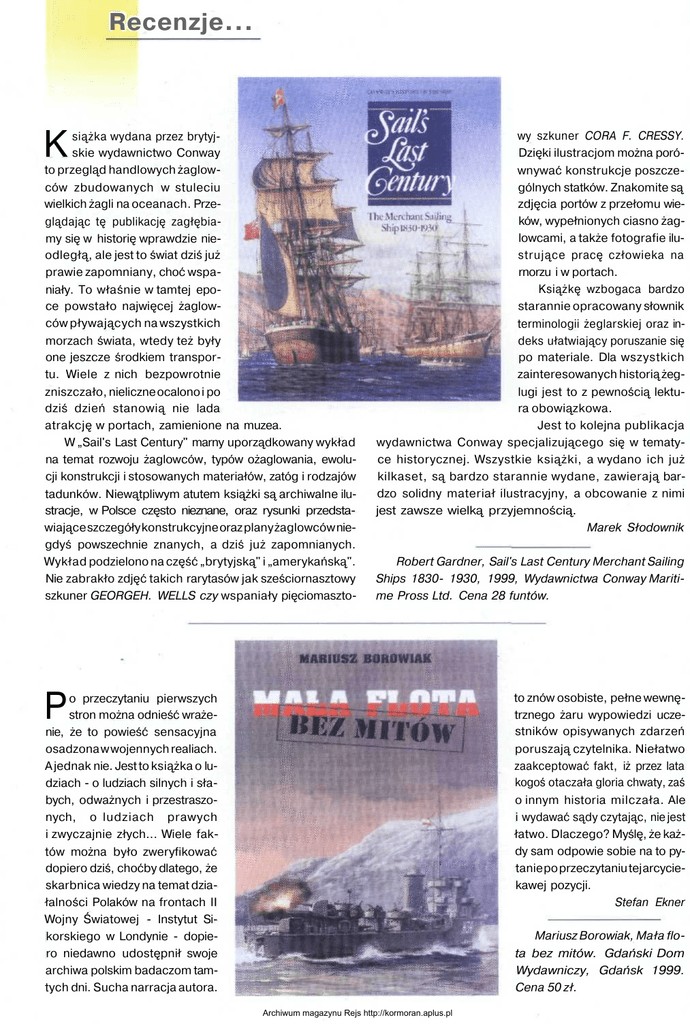 Recenzje... siążka wydana przez brytyjskie wydawnictwo Conway to przegląd handlowych żaglowców zbudowanych w stuleciu wielkich żagli na oceanach. Przeglądając tę publikację zagłębiamy się w historię wprawdzie nieodległą, ale jest to świat dziś już prawie zapomniany, choć wspaniały. To właśnie w tamtej epoce powstało najwięcej żaglowców pływających na wszystkich morzach świata, wtedy też były one jeszcze środkiem transportu. Wiele z nich bezpowrotnie zniszczało, nieliczne ocalono i po dziś dzień stanowią nie lada atrakcję w portach, zamienione na muzea. W „Sail's Last Century" marny uporządkowany wykład na temat rozwoju żaglowców, typów ożaglowania, ewolucji konstrukcji i stosowanych materiałów, zatóg i rodzajów tadunków. Niewątpliwym atutem książki są archiwalne ilustracje, w Polsce często nieznane, oraz rysunki przedstawiające szczegóły konstrukcyjne oraz plany żaglowców niegdyś powszechnie znanych, a dziś już zapomnianych. Wykład podzielono na część „brytyjską" i „amerykańską". Nie zabrakło zdjęć takich rarytasów jak sześciornasztowy szkuner GEORGEH. WELLS czy wspaniały pięciomaszto- K wy szkuner CORA F. CRESSY. Dzięki ilustracjom można porównywać konstrukcje poszczególnych statków. Znakomite są zdjęcia portów z przełomu wieków, wypełnionych ciasno żaglowcami, a także fotografie ilustrujące pracę człowieka na rnorzu i w portach. Książkę wzbogaca bardzo starannie opracowany słownik terminologii żeglarskiej oraz indeks ułatwiający poruszanie się po materiale. Dla wszystkich zainteresowanych historią żeglugi jest to z pewnością lektura obowiązkowa. Jest to kolejna publikacja wydawnictwa Conway specjalizującego się w tematyce historycznej. Wszystkie książki, a wydano ich już kilkaset, są bardzo starannie wydane, zawierają bardzo solidny materiał ilustracyjny, a obcowanie z nimi jest zawsze wielką przyjemnością. Marek Słodownik Robert Gardner, Sail's Last Century Merchant Sailing Ships 1830- 1930, 1999, Wydawnictwa Conway Maritime Pross Ltd. Cena 28 funtów. to znów osobiste, pełne wewnętrznego żaru wypowiedzi uczestników opisywanych zdarzeń poruszają czytelnika. Niełatwo zaakceptować fakt, iż przez lata kogoś otaczała gloria chwaty, zaś o innym historia milczała. Ale i wydawać sądy czytając, nie jest łatwo. Dlaczego? Myślę, że każdy sam odpowie sobie na to pytanie po przeczytaniu tej arcyciekawej pozycji. Stefan Ekner o przeczytaniu pierwszych stron można odnieść wrażenie, że to powieść sensacyjna osadzona w wojennych realiach. A jednak nie. Jest to książka o ludziach - o ludziach silnych i słabych, odważnych i przestraszonych, o ludziach prawych i zwyczajnie złych... Wiele faktów można było zweryfikować dopiero dziś, choćby dlatego, że skarbnica wiedzy na temat działalności Polaków na frontach II Wojny Światowej - Instytut Sikorskiego w Londynie - dopiero niedawno udostępnił swoje archiwa polskim badaczom tamtych dni. Sucha narracja autora. P Mariusz Borowiak, Mała flota bez mitów. Gdański Dom Wydawniczy, Gdańsk 1999. Cena 50 zł. Archiwum magazynu Rejs http://kormoran.aplus.pl akładem Crusing Yacht Club of Australia ukazał się raport poświęcony ubiegłorocznym regatom Sydney Hobart. Wszyscy pamiętamy zapewne dramat spowodowany sztormem, który zdziesiątkował startujące jachty. Książka jest plonem pracy specjalnej komisji powołanej po zakończeniu regat w celu zbadania przyczyn tragedii. Na blisko dwustu stronach dokonana jest analiza przyczyn z wnioskami z tego płynącymi. Interesujący jest zwłaszcza rozdział poświęcony operacji ratowniczej, największej na morzu w dziejach Australii. Kolejny rozdział to analiza sytuacji meteorologicznej zilustrowana zdjęciami satelitarnymi. Sztormu ominąć nie było można, wszystkich jednak zaskoczyła jego gwałtowność i siła. Na układ chmur w układzie godzinowym naniesiono pozycje poszczególnych jachtów. Można zobaczyć, które z nich znalazły się w centrum sztormu, wystawione na wiatr o szybkości 64 węzłów. Bardzo drobiazgowo zanalizowano stan techniczny i konstrukcję poszkodowanych jachtów. Poda no przyczyny wycofania się i okoliczności porzucenia jachtów. l wreszcie wnioski komisji jako podsumowanie całości. Nie szukano sensacji i winnych. Skupiono się na przyczynach tragedii wytykając organizatorom uchybienia, ale wskazując także na nieprecyzyjne przepisy dotyczące żeglarstwa regatowego w Australii. Raport spełnił swoje zadanie, wkrótce po jego ogtoszeniu zaostrzono bowiem wymagania dotyczące wyposażenia jachtów zgłaszanych do regat oraz kwalifikacji ich załóg. Jest to książka bardzo rzetelna i warto aby poznał ją każdy kto wybiera się na morze, niekoniecznie w regaty. Jak uniknąć kłopotów, jak zachować się podczas akcji ratowniczej, jeśli kłopoty już mamy, jak wreszcie stosować procedury w akcji ratowniczej - o tym jest ta publikacja. Skoncentrowanie się na faktach i ich analiza bez literackich opisów poraża swoją wymową i skłania do refleksji, a te są zawsze potrzebne zanim wyruszymy w morze nie tylko po regatowe laury. Marek Słodownik dy autor zaczynał kilka lat temu zbierać materiały do książki, nie spodziewał się, że w Polsce jest taka obfitość konstrukcji. Nie podejrzewał, że aby dojść do tego, kto tak naprawdę zaprojektował niektóre jachty, będzie musiaf przeprowadzać niemal dochodzenie, wertując niezliczone czasopisma czy książki. Wiele jachtów już nie istnieje, do wielu plany czy choćby rysunki po prostu zaginęty w czasie nawałnic przetaczających się przez nasz kraj; wielu projektantów nie ma już wśród żyjących... Kilkakrotnie widziałem, jak w swoim mieszkaniu sktadat szczątki rysunków jakiegoś jachtu. Szkoda tylko, że praca edytorska nie zostata wykonana tak sumiennie jak zbieranie materiałów, wymagające docierania do niezliczonej grupy polski