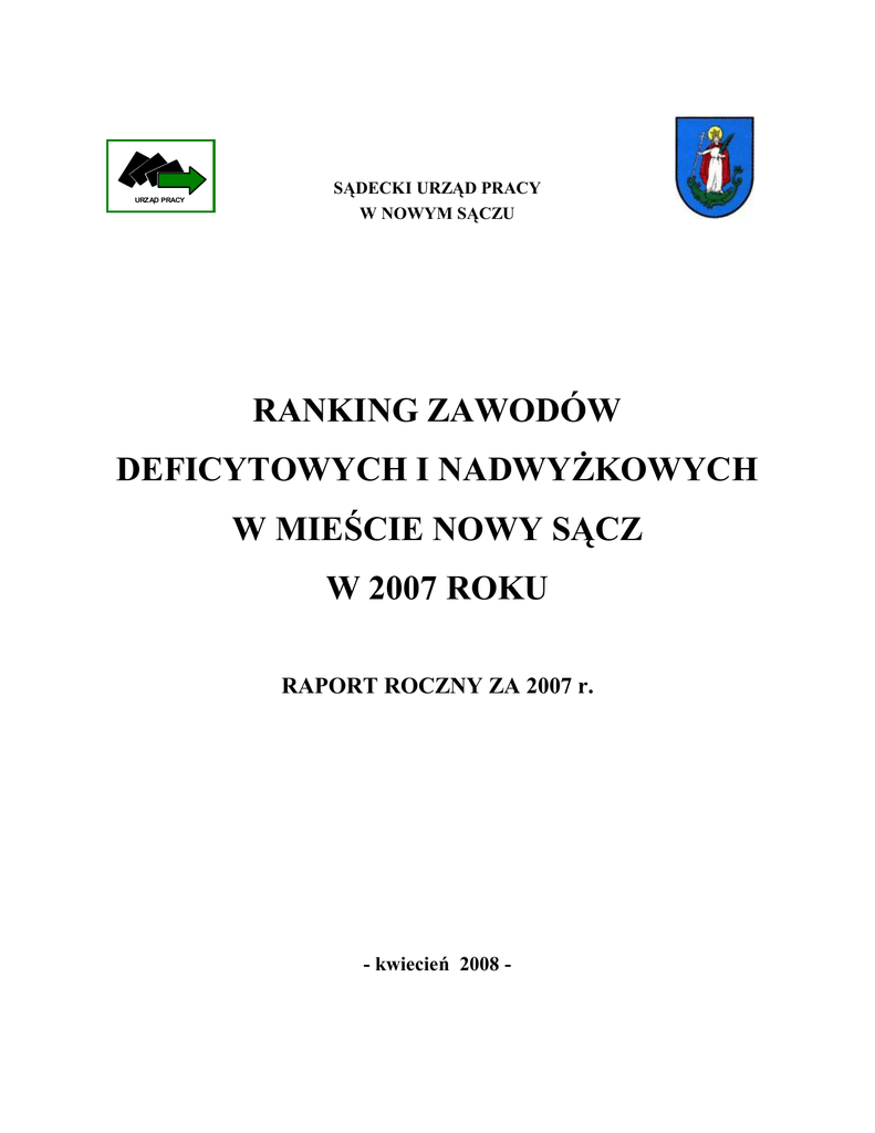 URZĄD PRACY SĄDECKI URZĄD PRACY W NOWYM SĄCZU RANKING ZAWODÓW DEFICYTOWYCH I NADWYŻKOWYCH W MIEŚCIE NOWY SĄCZ W 2007 ROKU RAPORT ROCZNY ZA 2007 r. - kwiecień 2008 - SPIS TREŚCI 1. 2. 3. 4. 5. 6. Wstęp Analiza bezrobocia w mieście Nowy Sącz według zawodów (grup zawodów) Analiza ofert pracy w mieście Nowy Sącz według zawodów (grup zawodów) Analiza zawodów deficytowych i nadwyżkowych Wnioski Aneks statystyczny 2 1. Wstęp Monitoring zawodów deficytowych i nadwyżkowych to proces polegający na systematycznym obserwowaniu zjawisk zachodzących na rynku pracy dotyczących kształtowania popytu na pracę i podaży zasobów pracy w przekroju terytorialno-zawodowym oraz formułowaniu na tej podstawie ocen, wniosków i krótkotrwałych prognoz niezbędnych dla prawidłowego funkcjonowania systemów: szkolenia bezrobotnych oraz kształcenia zawodowego. W związku z tym, Sądecki Urząd Pracy w Nowym Sączu w ramach prowadzonego monitoringu zawodów deficytowych i nadwyżkowych opracował raport o charakterze diagnostycznym i prognostycznym za rok 2007 dla miasta Nowego Sącza. Podstawą opracowania są dane z zakresu załącznika 3 („Bezrobotni oraz oferty pracy według zawodów i specjalności”) i załącznika 2 („Bezrobotni według rodzaju działalności ostatniego miejsca pracy i oferty pracy”) do sprawozdania MGiP-01 o rynku pracy za 2007 rok. W oparciu o wyżej wymienione źródła informacji, za pomocą aplikacji „Monitoring zawodów” wygenerowanych zostało 15 tablic wynikowych, stanowiących integralną część raportu. Raport sporządzono zgodnie z „Zaleceniami metodycznymi do prowadzenia monitoringu zawodów deficytowych i nadwyżkowych” opracowanymi w 2003r. przez Departament Rynku Pracy w Ministerstwie Gospodarki, Pracy i Polityki Społecznej. Monitoring dotyczy 30 dużych grup zawodowych (kod 2-cyfrowy), 392 grup elementarnych (kod 4-cyfrowy) oraz 1707 zawodów i specjalności (kod 6-cyfrowy), wprowadzonych do stosowania Rozporządzeniem Ministra Gospodarki i Pracy z dnia 8 grudnia 2004r. w sprawie klasyfikacji zawodów i specjalności dla potrzeb rynku pracy oraz zakresu jej stosowania. W monitoringu zastosowano następujące mierniki: - średnia miesięczna nadwyżka (deficyt) podaży siły roboczej w zawodzie k - wskaźnik intensywności nadwyżki (deficytu) zawodów k - wskaźnik szansy uzyskania oferty w zawodzie k 3 - wskaźnik długotrwałego bezrobocia w zawodzie k - wskaźnik struktury bezrobotnych według zawodów ( grup zawodów) - wskaźnik struktury bezrobotnych według PKD - wskaźniki struktury ofert pracy według zawodów ( grup zawodów ) - wskaźniki struktury ofert pracy według PKD Równocześnie podkreślić należy, iż raport ten nie odzwierciedla rzeczywistej sytuacji, jaka ma miejsce na lokalnym rynku pracy w badanym zakresie. Poniżej podajemy kilka wielkości charakteryzujących lokalny rynek pracy. Do 31.12.2007r. w obsłudze Sądeckiego Urzędu Pracy pozostawało 4094 osoby, z czego 2577 to kobiety. Stopa bezrobocia na dzień 31.12.2007r. w mieście Nowym Sączu wynosiła 9,8% wg danych statystycznych na koniec roku. Stopa ta była wyższa niż w Małopolsce (8,8%), ale niższa niż w całym kraju (11,4%). Była także wyższa niż średnia stopa bezrobocia w Unii Europejskiej (6,8 %). 2. Analiza bezrobocia w mieście Nowy Sącz według zawodów (grup zawodów) W tabeli T-II/P-1 przedstawiono strukturę osób bezrobotnych w liczbach bezwzględnych wg poszczególnych zawodów (kod 6-cyfrowy), w tym: kobiet, osób do 12 miesięcy od dnia ukończenia szkoły oraz osób zarejestrowanych powyżej 12 miesięcy (stan na 31.12.2007r.). Liczba osób bezrobotnych ogółem w Nowym Sączu wynosi 4094. Bezrobotnych kobiet jest 2577. Osób do 12 miesięcy od dnia ukończenia szkoły – 234 (155 kobiet), natomiast osób zarejestrowanych powyżej 12 miesięcy – 1439 (1012 kobiet). Struktura bezrobotnych wg dużych grup zawodowych (kod 2-cyfrowy) oraz grup elementarnych (kod 4-cyfrowy) wyrażona w procentach w mieście Nowym Sączu przedstawia tabela T-II/P-1a; 4 Najliczniejszą grupę wśród zarejestrowanych w SUP bezrobotnych, stanowią osoby zaliczone do dużej grupy zawodowej (kod 2-cyfrowy) – „modelki, sprzedawcy i demonstratorzy” (wielkość wskaźnika – 12,8352). Wszystkie osoby bezrobotne z tej kategorii, to równocześnie osoby posiadające 4-cyfrowy kod zawodu - sprzedawcy i demonstratorzy. Nieco mniejsza grupa bezrobotnych (9,7073) to „pracownicy usług osobistych i ochrony”. W tej kategorii, szczególnie liczni są przedstawiciele takich grup elementarnych (kod 4-cyfrowy) jak: kucharze (4,2017), kelnerzy i pokrewni (1,9704) i fryzjerzy, kosmetyczki i pokrewni (1,7096). W dalszej kolejności zanotowano następujące grupy zawodów: „pracownicy pozostałych specjalności” (9,2439), w tym: pracownicy ds. finansowych i handlowych, pracownicy administracyjni (4,8102), sekretarze i pokrewni (1,0432). Dalej „robotnicy obróbki metali i mechanicy maszyn i urządzeń” (9,2147), gdzie dominują ślusarze i pokrewni (2,3471), mechanicy pojazdów samochodowych (1,7676), i elektromechanicy (1,1011). Następnie sytuują się „pozostali robotnicy przemysłowi i rzemieślnicy” (8,1426), a wśród nich krawcy i kapelusznicy (3,5062). Dalej „średni personel techniczny” (7,6788), „pracownicy przy pracach prostych i usługach” (6,7807) i „pracownicy obsługi biurowej” (6,7227). Pozostałe grupy były reprezentowane już znacznie mniej licznie. Najniższe wskaźniki odnotowano w takich grupach jak „leśnicy i rybacy” (0,0290), „nauczyciele praktycznej nauki zawodu i instruktorzy” (0,0290), „przedstawiciele władz publicznych, wyżsi urzędnicy, zawodowi działacze” (0,0290), „robotnicy pomocniczy w rolnictwie, rybołówstwie i pokrewni” (0,0580), „rolnicy i rybacy pracujący na własne potrzeby” (0,0983) oraz „kierownicy małych przedsiębiorstw” (0,1160). Jeśli chodzi o kobie