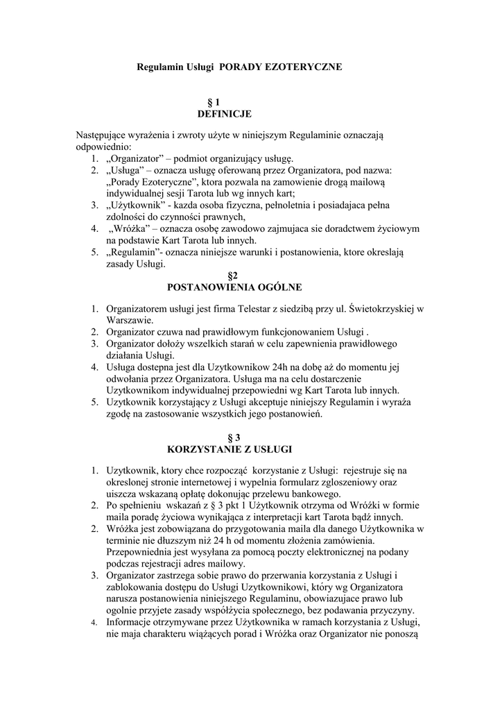 Regulamin Usługi PORADY EZOTERYCZNE §1 DEFINICJE Następujące wyrażenia i zwroty użyte w niniejszym Regulaminie oznaczają odpowiednio: 1. „Organizator” – podmiot organizujący usługę. 2. „Usługa” – oznacza usługę oferowaną przez Organizatora, pod nazwa: „Porady Ezoteryczne”, ktora pozwala na zamowienie drogą mailową indywidualnej sesji Tarota lub wg innych kart; 3. „Użytkownik” - kazda osoba fizyczna, pełnoletnia i posiadajaca pełna zdolności do czynności prawnych, 4. „Wróżka” – oznacza osobę zawodowo zajmujaca sie doradctwem życiowym na podstawie Kart Tarota lub innych. 5. „Regulamin”- oznacza niniejsze warunki i postanowienia, ktore okreslają zasady Usługi. §2 POSTANOWIENIA OGÓLNE 1. Organizatorem usługi jest firma Telestar z siedzibą przy ul. Świetokrzyskiej w Warszawie. 2. Organizator czuwa nad prawidłowym funkcjonowaniem Usługi . 3. Organizator dołoży wszelkich starań w celu zapewnienia prawidłowego działania Usługi. 4. Usługa dostepna jest dla Uzytkownikow 24h na dobę aż do momentu jej odwołania przez Organizatora. Usługa ma na celu dostarczenie Uzytkownikom indywidualnej przepowiedni wg Kart Tarota lub innych. 5. Uzytkownik korzystający z Usługi akceptuje niniejszy Regulamin i wyraźa zgodę na zastosowanie wszystkich jego postanowień. §3 KORZYSTANIE Z USŁUGI 1. Uzytkownik, ktory chce rozpocząć korzystanie z Usługi: rejestruje się na okreslonej stronie internetowej i wypelnia formularz zgloszeniowy oraz uiszcza wskazaną opłatę dokonując przelewu bankowego. 2. Po spełnieniu wskazań z § 3 pkt 1 Użytkownik otrzyma od Wróźki w formie maila poradę życiowa wynikająca z interpretacji kart Tarota bądź innych. 2. Wróżka jest zobowiązana do przygotowania maila dla danego Użytkownika w terminie nie dłuzszym niż 24 h od momentu złożenia zamówienia. Przepowniednia jest wysyłana za pomocą poczty elektronicznej na podany podczas rejestracji adres mailowy. 3. Organizator zastrzega sobie prawo do przerwania korzystania z Usługi i zablokowania dostępu do Usługi Uzytkownikowi, który wg Organizatora narusza postanowienia niniejszego Regulaminu, obowiazujace prawo lub ogolnie przyjete zasady współżycia społecznego, bez podawania przyczyny. 4. Informacje otrzymywane przez Użytkownika w ramach korzystania z Usługi, nie maja charakteru wiążących porad i Wróźka oraz Organizator nie ponoszą odpowiedzialnosci za sposob, w jaki Uzytkownik je wykorzysta i zinterpretuje. W zwiazku z powyzszym Uzytkownikowi nie przysługują ż adne roszczenia z tytułu poniesienia jakichkolwiek szkod powstałych lub mogacych powstać na skutek korzystania z tresci otrzymanych w ramach Usługi. §4 DOSTĘPNOŚĆ I KOSZT KORZYSTANIA Z USŁUGI 1. Usługa jest dostępna po opłaceniu wskazanej kwoty za pomocą karty platniczej. 2. Cena za skorzystanie z usługi to 60 zl z Vat. §5 REKLAMACJE Wszelkie reklamacje i zastrzeżenia dotyczące korzystania z Usługi mogą być składane przez Użytkowników pisemne wraz ze szczegołowym uzasadnieniem w terminie 14 dni od dnia jej zakonczenia pod rygorem wygasniecia jakichkolwiek roszczen danej osoby w zwiazku z Usługa. Reklamacje wpływajace po powyższym terminie nie beda rozpatrywane. Reklamacje Użytkownikow dotyczace Usługi będą rozpatrywane niezwłocznie, jednakze nie pozniej niż w terminie 21 dni roboczych od daty otrzymania. Zainteresowani zostaną powiadomieni o sposobie rozpatrzenia reklamacji drogą elektroniczna lub pocztową. §6 POSTANOWIENIA KOŃCOWE 1. Organizator nie ponosi odpowiedzialnosci za: a. problemy w funkcjonowaniu Usługi, jezeli nastapiły one wskutek zdarzeń, ktorych Organizator przy zachowaniu nalezytej starannosci nie był w stanie przewidzieć lub ktorym nie mogł zapobiec, w szczegolnosci w przypadku problemów zwiazanych ze zdarzeniami losowymi o charakterze siły wyzszej. b. szkody spowodowane nieprawidłowym korzystaniem przez Użytkownika z Usługi, c. szkody spowodowane wykorzystaniem przez Użytkownika informacji otrzymanych w wyniku korzystania z Usługi, d. korzystanie z Usługi przez Użytkownikow niezgodnie z postanowieniami niniejszego Regulaminu lub bez zapoznania się z Regulaminem, w tym zwłaszcza wynikajace z niewłasciwego zrozumienia przez Użytkownika charakteru Usługi, 2. Uzytkownicy wyrazają zgodę na przetwarzanie swoich danych osobowych w celach związanych z przeprowadzeniem Usługi, zgodnie z Ustawa o ochronie danych osobowych z dnia 29.08.1997r. Kazdy z Użytkownikow ma prawo wgladu do swoich danych osobowych ich poprawiania oraz ż ad ̨ ania usunięcia. Administratorem bazy danych Użytkownikow w rozumieniu w/w ustawy jest Organizator. 3. Organizator zastrzega sobie prawo zmiany postanowień Regulaminu w razie zmiany przepisow prawnych lub z innej waznej przyczyny. Zmiany Regulaminu wchodzą w ż ycie z dniem ich publikacji na stronie internetowej. 5. Regulamin dostępy jest w siedzibie Organizatora.